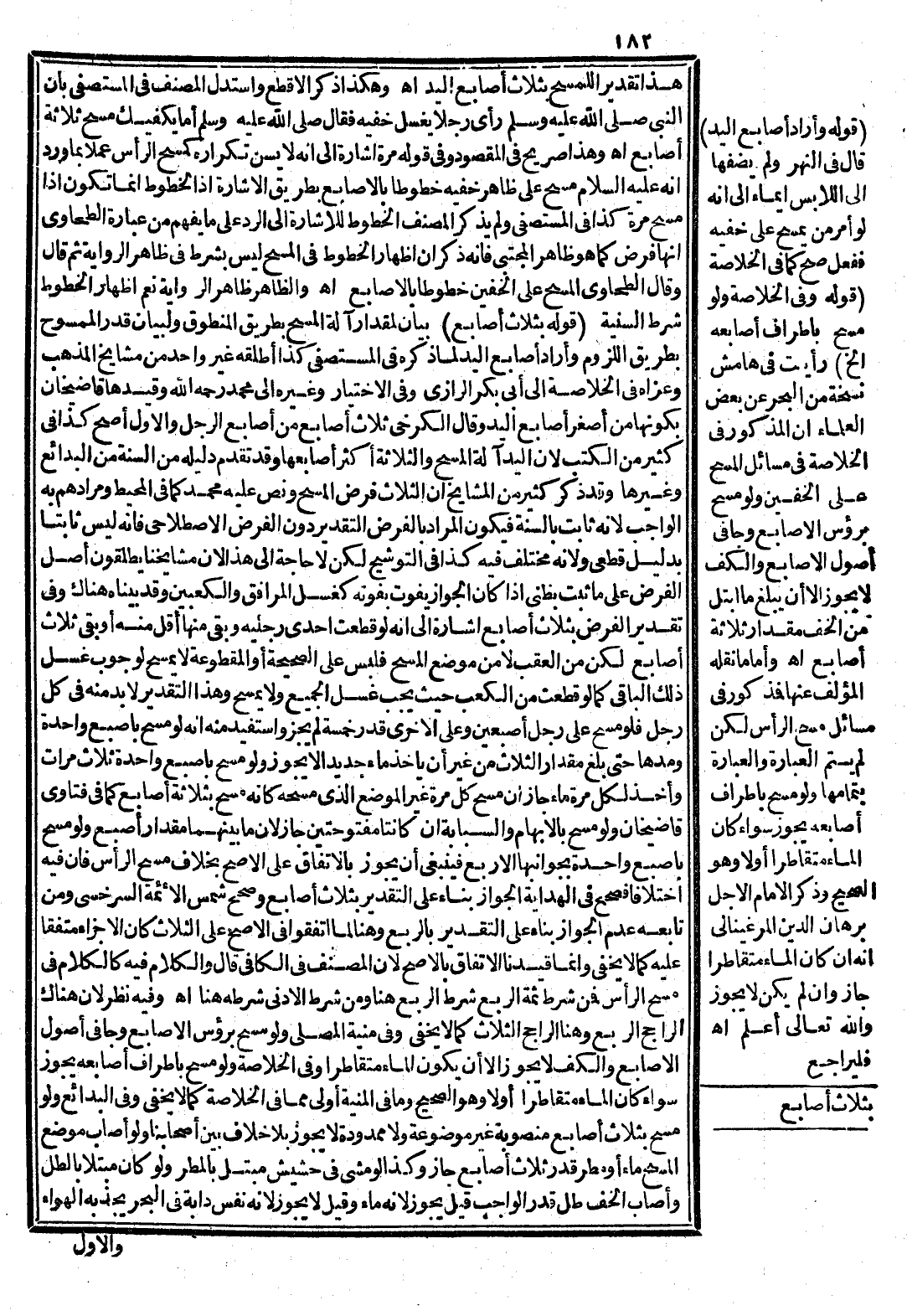 وَلَوْ مَسَحَ بِالْإِبْهَامِ وَالسَّبَّابَةِ إنْ كَانَتَا مَفْتُوحَتَيْنِ جَازَ؛ لِأَنَّ مَا بَيْنَهُمَا مِقْدَارُ أُصْبُعٍ وَلَوْ مَسَحَ بِأُصْبُعٍ وَاحِدَةٍ بِجَوَانِبِهَا الْأَرْبَعِ فَيَنْبَغِي أَنْ يَجُوزَ بِالِاتِّفَاقِ عَلَى الْأَصَحِّ بِخِلَافِ مَسْحِ الرَّأْسِ، فَإِنَّ فِيهِ اخْتِلَافًا فَصَحَّحَ فِي الْهِدَايَةِ الْجَوَازَ بِنَاءً عَلَى التَّقْدِيرِ بِثَلَاثِ أَصَابِعَ وَصَحَّحَ شَمْسُ الْأَئِمَّةِ السَّرَخْسِيُّ وَمَنْ تَابَعَهُ عَدَمَ الْجَوَازِ بِنَاءً عَلَى التَّقْدِيرِ بِالرُّبْعِ وَهُنَا لَمَّا اتَّفَقُوا فِي الْأَصَحِّ عَلَى الثَّلَاثِ كَانَ الْإِجْزَاءُ مُتَّفَقًا عَلَيْهِ كَمَا لَا يَخْفَى، وَإِنَّمَا قَيَّدْنَا الِاتِّفَاقَ بِالْأَصَحِّ؛ لِأَنَّ الْمُصَنِّفَ فِي الْكَافِي قَالَ وَالْكَلَامُ فِيهِ كَالْكَلَامِ فِي مَسْحِ الرَّأْسِ فَمَنْ شَرَطَ ثَمَّةَ الرُّبْعِ شَرَطَ الرُّبْعَ هُنَا وَمَنْ شَرَطَ الْأَدْنَى شَرَطَهُ هُنَا اهـ.