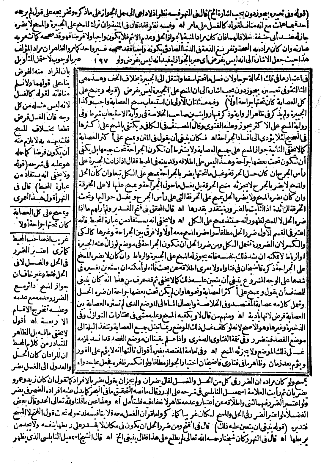 أَقُولُ: لَا يَخْفَى مَا فِيهِ بَلْ الظَّاهِرُ الْمُتَبَادِرُ مِنْ كَلَامِ الْمُحِيطِ أَنَّ الْمُرَادَ إنْ كَانَ الْحَلُّ وَالْعُدُولُ إلَى الْغَسْلِ يَضُرُّ يَمْسَحُ وَلَوْ كَانَ مُرَادُهُ أَنَّ الضَّرَرَ فِي كُلٍّ مِنْ الْحَلِّ وَالْغَسْلِ لَقَالَ يَضُرَّانِ وَلَمْ يَجُزْ أَنْ يَقُولَ يَضُرُّ بِالْإِفْرَادِ كَمَا تَقُولُ إنْ كَانَ زَيْدٌ وَعَمْرٌو يَضْرِبَانِ ثُمَّ رَأَيْت الْعَلَّامَةَ إسْمَاعِيلَ النَّابُلُسِيَّ فِي شَرْحِهِ عَلَى الدُّرَرِ قَالَ مَا نَصُّهُ التَّحْقِيقُ مَا فِي الْبَحْرِ كَمَا يَدُلُّ عَلَيْهِ إفْرَادُهُ الضَّمِيرَ فِي يَضُرُّ وَلَوْ اُعْتُبِرَ الضَّرَرُ فِيهِمَا لَثَنَّى وَإِطْلَاقُهُ عَنْ اعْتِبَارٍ وَعَدَمُهُ ظَاهِرٌ لَا خَفَاءَ فِيهِ فَلْيُتَأَمَّلْ. اهـ.