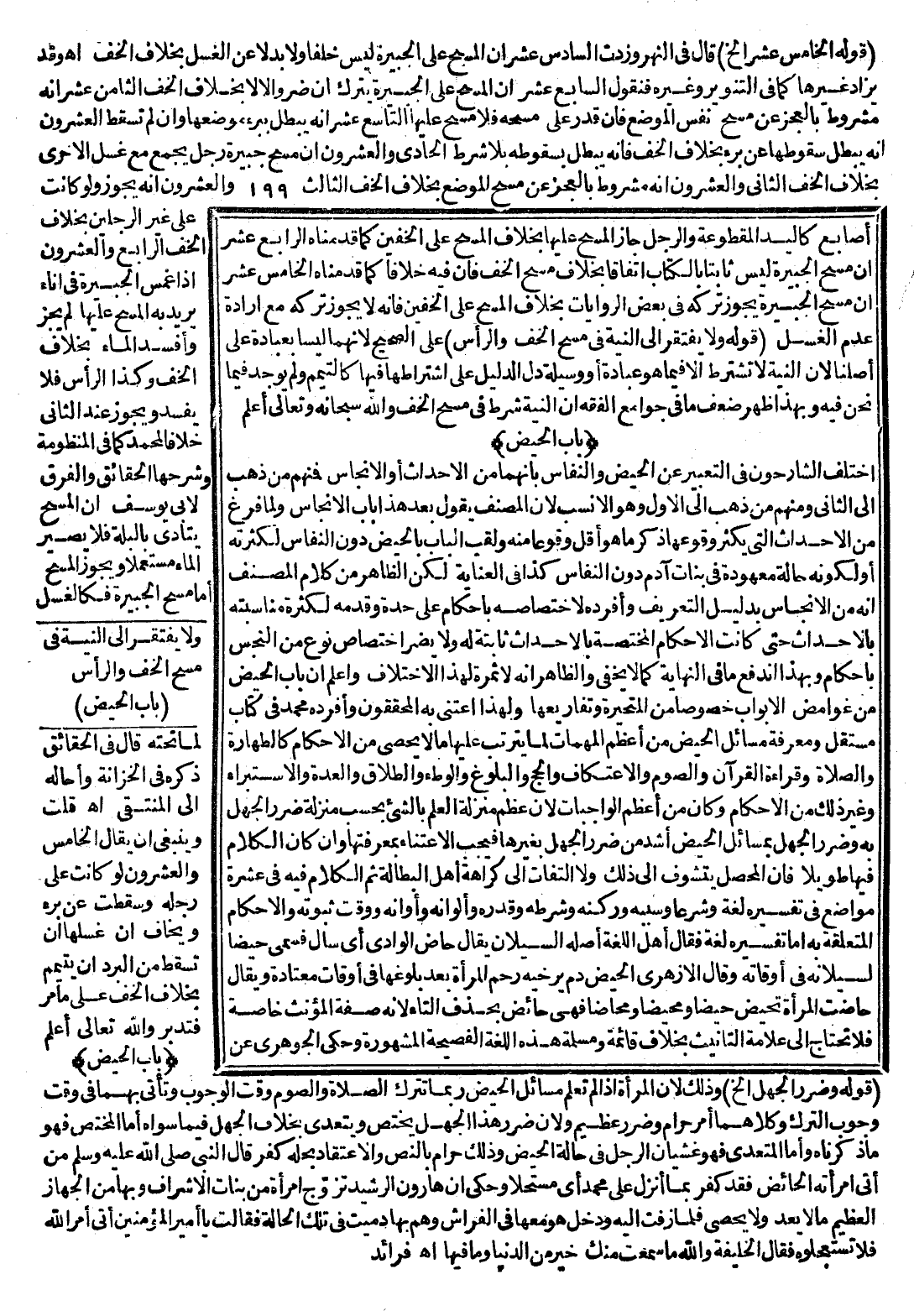 وَمَعْرِفَةُ مَسَائِلِ الْحَيْضِ مِنْ أَعْظَمِ الْمُهِمَّاتِ لِمَا يَتَرَتَّبُ عَلَيْهَا مَا لَا يُحْصَى مِنْ الْأَحْكَامِ كَالطَّهَارَةِ وَالصَّلَاةِ وَقِرَاءَةِ الْقُرْآنِ وَالصَّوْمِ وَالِاعْتِكَافِ وَالْحَجِّ وَالْبُلُوغِ وَالْوَطْءِ وَالطَّلَاقِ وَالْعِدَّةِ وَالِاسْتِبْرَاءِ وَغَيْرِ ذَلِكَ مِنْ الْأَحْكَامِ وَكَانَ مِنْ أَعْظَمَ الْوَاجِبَاتِ؛ لِأَنَّ عِظَمَ مَنْزِلَةِ الْعِلْمِ بِالشَّيْءِ بِحَسَبِ مَنْزِلَةِ ضَرَرِ الْجَهْلِ بِهِ وَضَرَرُ الْجَهْلِ بِمَسَائِلِ الْحَيْضِ أَشَدُّ مِنْ ضَرَرِ الْجَهْلِ بِغَيْرِهَا فَيَجِبُ الِاعْتِنَاءُ بِمَعْرِفَتِهَا وَإِنْ كَانَ الْكَلَامُ فِيهَا طَوِيلًا فَإِنَّ الْمُحَصِّلَ يَتَشَوَّفُ إلَى ذَلِكَ وَلَا الْتِفَاتَ إلَى كَرَاهَةِ أَهْلِ الْبَطَالَةِ، ثُمَّ الْكَلَامُ فِيهِ فِي عَشَرَةِ مَوَاضِعَ فِي تَفْسِيرِهِ لُغَةً وَشَرْعًا وَسَبَبِهِ وَرُكْنِهِ وَشَرْطِهِ وَقَدْرِهِ وَأَلْوَانِهِ وَأَوَانِهِ وَوَقْتِ ثُبُوتِهِ وَالْأَحْكَامِ الْمُتَعَلِّقَةِ بِهِ، أَمَّا تَفْسِيرُهُ لُغَةً فَقَالَ أَهْلُ اللُّغَةِ أَصْلُهُ السَّيَلَانُ يُقَالُ حَاضَ الْوَادِي أَيْ سَالَ فَسُمِّيَ حَيْضًا لِسِيلَانِهِ فِي أَوْقَاتِهِ وَقَالَ الْأَزْهَرِيُّ الْحَيْضُ دَمٌ يُرْخِيهِ رَحِمُ الْمَرْأَةِ بَعْدَ بُلُوغِهَا فِي أَوْقَاتٍ مُعْتَادَةٍ، وَيُقَالُ حَاضَتْ الْمَرْأَةُ تَحِيضُ حَيْضًا وَمَحِيضًا وَمُحَاضًا فَهِيَ حَائِضٌ بِحَذْفِ التَّاءِ؛ لِأَنَّهُ صِفَةُ الْمُؤَنَّثِ خَاصَّةً فَلَا تَحْتَاجُ إلَى عَلَامَةِ التَّأْنِيثِ بِخِلَافِ قَائِمَةٍ وَمُسْلِمَةٍ هَذِهِ اللُّغَةُ الْفَصِيحَةُ الْمَشْهُورَةُ.