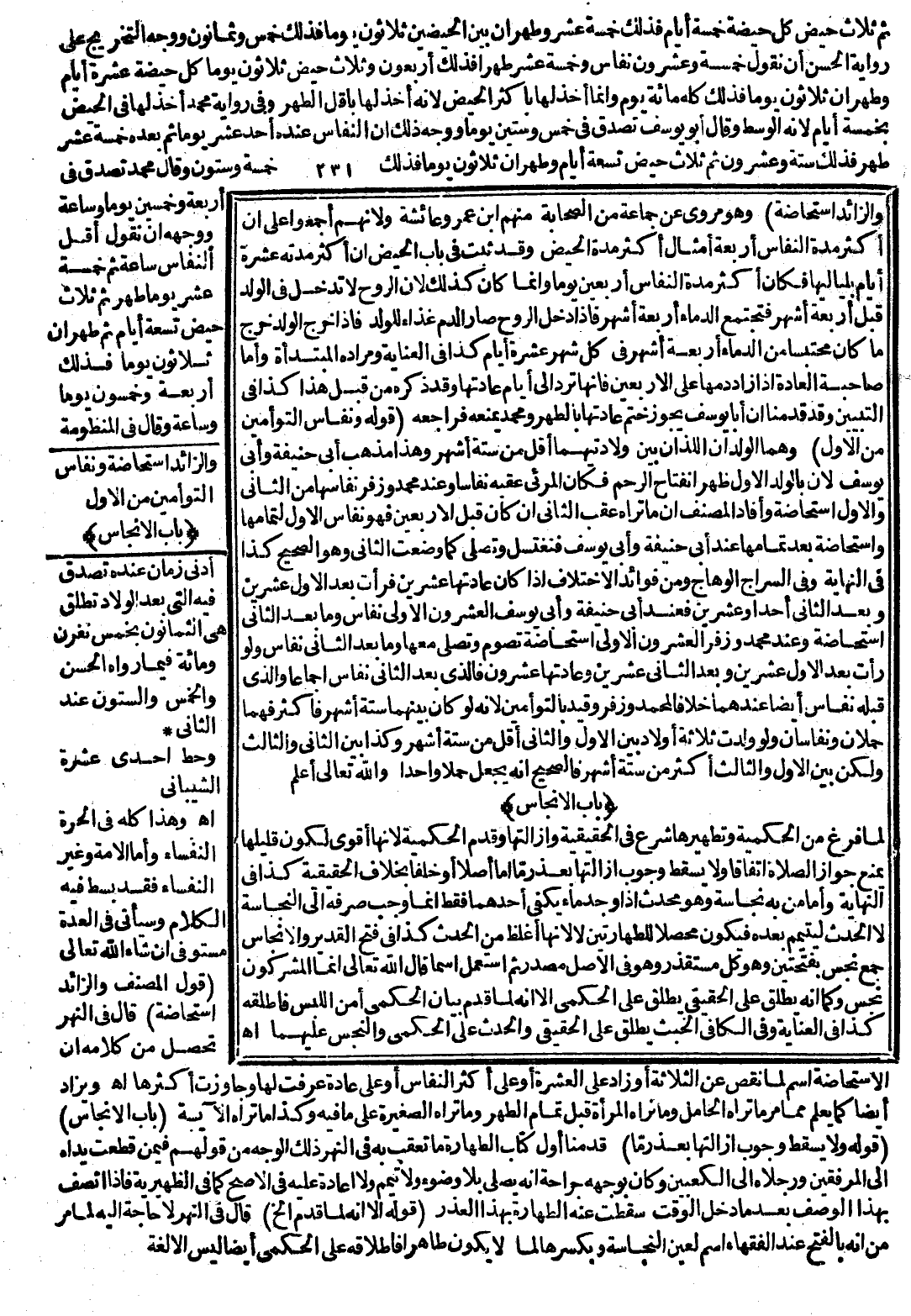 وَإِنَّمَا أَخَذَ لَهَا بِأَكْثَرَ الْحَيْضِ لِأَنَّهُ أَخْذٌ لَهَا بِأَقَلِّ الطُّهْرِ وَفِي رِوَايَةِ مُحَمَّدٍ أَخْذٌ لَهَا فِي الْحَيْضِ بِخَمْسَةِ أَيَّامٍ؛ لِأَنَّهُ الْوَسَطُ وَقَالَ أَبُو يُوسُفَ تُصَدَّقُ فِي خَمْسٍ وَسِتِّينَ يَوْمًا وَوَجْهُ ذَلِكَ أَنَّ النِّفَاسَ عِنْدَهُ أَحَدَ عَشَرَ يَوْمًا، ثُمَّ بَعْدَهُ خَمْسَةَ عَشَرَ طُهْرٌ فَذَلِكَ سِتَّةٌ وَعِشْرُونَ، ثُمَّ ثَلَاثُ حِيَضٍ تِسْعَةُ أَيَّامٍ وَطُهْرَانِ ثَلَاثُونَ يَوْمًا فَذَلِكَ خَمْسَةٌ وَسِتُّونَ وَقَالَ مُحَمَّدٌ تُصَدَّقُ فِي أَرْبَعَةٍ وَخَمْسِينَ يَوْمًا وَسَاعَةٍ وَوَجْهُهُ أَنْ نَقُولَ أَقَلُّ النِّفَاسِ سَاعَةٌ، ثُمَّ خَمْسَةَ عَشَرَ يَوْمًا طُهْرٌ، ثُمَّ ثَلَاثٌ حَيْضٌ تِسْعَةُ أَيَّامٍ، ثُمَّ طُهْرَانِ ثَلَاثُونَ يَوْمًا فَذَلِكَ أَرْبَعَةٌ وَخَمْسُونَ يَوْمًا وَسَاعَةٌ وَقَالَ فِي الْمَنْظُومَةِ