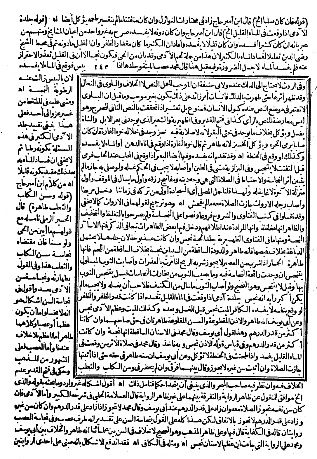 مِنْ كَلَامِ ابْنِ أَمِيرِ حَاجٍّ (قَوْلُهُ: وَسِنُّ الْكَلْبِ وَالثَّعْلَبِ طَاهِرَةٌ) قَالَ الْخَيْرُ الرَّمْلِيُّ تَأَمَّلْهُ مَعَ قَوْلِهِمْ مَا أُبِينَ مِنْ الْحَيِّ وَلَوْ سِنًّا فَإِنَّ مُقْتَضَاهُ نَجَاسَةُ سِنِّ الْكَلْبِ وَالثَّعْلَبِ هَذَا وَفِي الْقَوْلِ بِطَهَارَتِهِ وَنَجَاسَةِ سِنِّ الْآدَمِيِّ بُعْدٌ وَأَقُولُ: فِي نَجَاسَةِ السِّنِّ إشْكَالٌ هُوَ أَنَّهُ لَا يَخْلُو إمَّا أَنْ يَكُونَ عَظْمًا أَوْ عَصَبًا وَكِلَاهُمَا طَاهِرٌ، أَمَّا الْعَظْمُ بِلَا خِلَافٍ عِنْدَنَا، وَأَمَّا الْعَصَبُ فَعَلَى الْمَشْهُورِ مِنْ الْمَذْهَبِ وَحَكَى فِي فَتْحِ الْقَدِيرِ عَدَمَ الْخِلَافِ فِيهِ وَإِنْ نَظَرَ فِيهِ صَاحِبُ الْبَحْرِ وَاَلَّذِي يَنْبَغِي أَنْ يَتَّحِدَا حُكْمًا فَتَأَمَّلْ ذَلِكَ. اهـ.