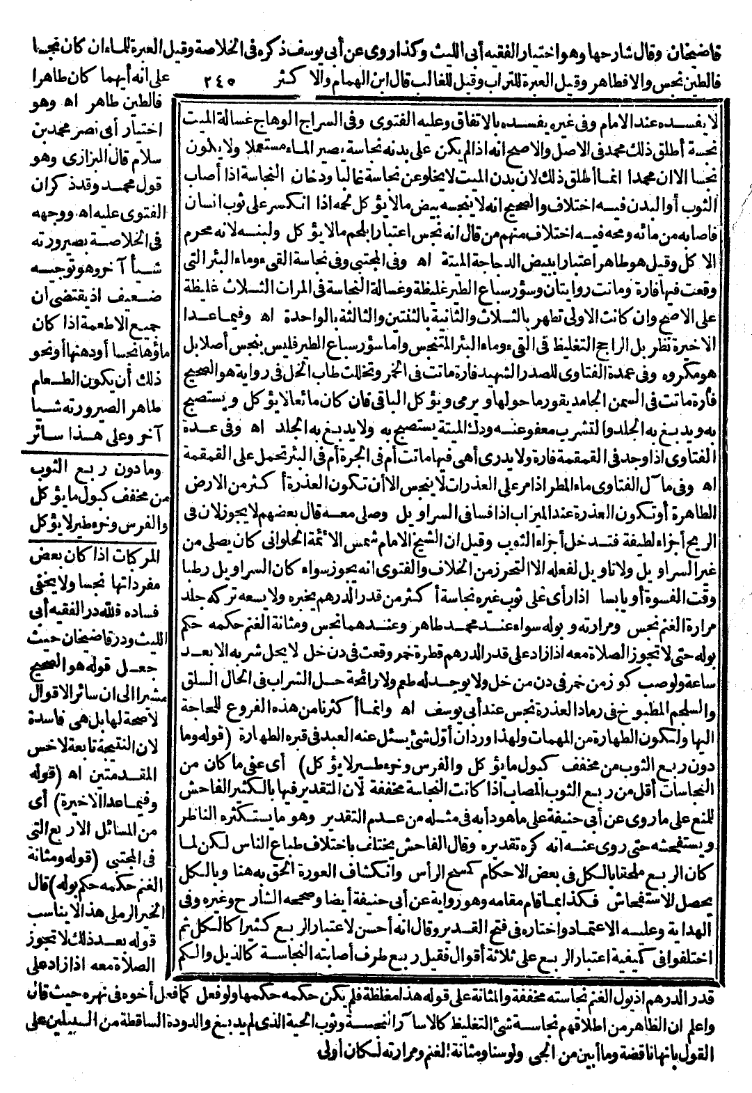 وَفِي مَآلِ الْفَتَاوَى مَاءُ الْمَطَرِ إذَا مَرَّ عَلَى الْعَذِرَاتِ لَا يَنْجُسُ إلَّا أَنْ تَكُونَ الْعَذِرَةُ أَكْثَرَ مِنْ الْأَرْضِ الطَّاهِرَةِ أَوْ تَكُونَ الْعَذِرَةُ عِنْدَ الْمِيزَابِ، إذَا فَسَا فِي السَّرَاوِيلِ وَصَلَّى مَعَهُ قَالَ بَعْضُهُمْ لَا يَجُوزُ؛ لِأَنَّ فِي الرِّيحِ أَجْزَاءً لَطِيفَةً فَتَدْخُلُ أَجْزَاءُ الثَّوْبِ وَقِيلَ إنَّ الشَّيْخَ الْإِمَامَ شَمْسَ الْأَئِمَّةِ الْحَلْوَانِيَّ كَانَ يُصَلِّي مِنْ غَيْرِ السَّرَاوِيلِ وَلَا تَأْوِيلَ لِفِعْلِهِ إلَّا التَّحَرُّزَ مِنْ الْخِلَافِ وَالْفَتْوَى أَنَّهُ يَجُوزُ سَوَاءٌ كَانَ السَّرَاوِيلُ رَطْبًا وَقْتَ الْفَسْوَةِ أَوْ يَابِسًا، إذَا رَأَى عَلَى ثَوْبِ غَيْرِهِ نَجَاسَةً أَكْثَرَ مِنْ قَدْرِ الدِّرْهَمِ يُخْبِرُهُ وَلَا يَسَعُهُ تَرْكُهُ، جِلْدُ مَرَارَةِ الْغَنَمِ نَجَسٌ وَمَرَارَتُهُ وَبَوْلُهُ سَوَاءٌ عِنْدَ مُحَمَّدٍ طَاهِرٌ وَعِنْدَهُمَا نَجَسٌ وَمَثَانَةُ الْغَنَمِ حُكْمُهُ حُكْمُ بَوْلِهِ حَتَّى لَا تَجُوزُ الصَّلَاةُ مَعَهُ إذَا زَادَ عَلَى قَدْرِ الدِّرْهَمِ قَطْرَةُ خَمْرٍ وَقَعَتْ فِي دَنِّ خَلٍّ لَا يَحِلُّ شُرْبُهُ إلَّا بَعْدَ سَاعَةٍ وَلَوْ صُبَّ كُوزٌ مِنْ خَمْرٍ فِي دَنٍّ مِنْ خَلٍّ وَلَا يُوجَدُ لَهُ طَعْمٌ وَلَا رَائِحَةٌ حَلَّ الشَّرَابُ فِي الْحَالِ، السَّلْقُ وَالسَّلْجَمُ الْمَطْبُوخُ فِي رَمَادِ الْعَذِرَةِ نَجَسٌ عِنْدَ أَبِي يُوسُفَ. اهـ.