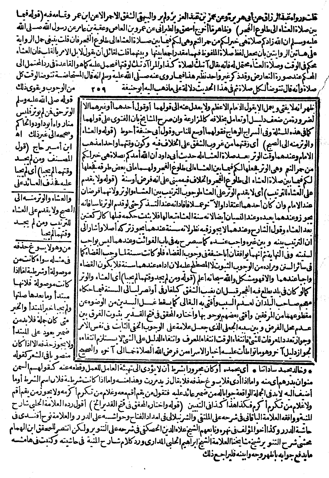 (قَوْلُهُ: فِيمَا بَيْنَ صَلَاةِ الْعِشَاءِ إلَى طُلُوعِ الْفَجْرِ) وَظَاهِرُ مَا أَخْرَجَ إِسْحَاقُ وَالطَّبَرَانِيُّ عَنْ عَمْرِو بْنِ الْعَاصِ وَعُقْبَةَ بْنِ عَامِرٍ عَنْ رَسُولِ اللَّهِ - صَلَّى اللَّهُ عَلَيْهِ وَسَلَّمَ - «إنَّ اللَّهَ زَادَكُمْ صَلَاةً هِيَ خَيْرٌ لَكُمْ مِنْ حُمُرِ النِّعَمِ وَهِيَ لَكُمْ فِيمَا بَيْنَ صَلَاةِ الْعِشَاءِ إلَى طُلُوعِ الْفَجْرِ» ، فَإِنْ قُلْتُ: يَنْبَغِي حَمْلُ الرِّوَايَةِ عَلَى هَاتَيْنِ الرِّوَايَتَيْنِ بِأَنْ يُجْعَلَ لَفْظُ صَلَاةِ الْمَلْفُوظِ فِيهِمَا مُقَدَّرًا جَمْعًا بَيْنَهَا وَبَيْنَهُمَا قُلْتُ: لِقَائِلٍ أَنْ يَقُولَ لَا بَلْ الْأَمْرُ بِالْقَلْبِ فَإِنَّ الْعِشَاءَ مُحْكَمٌ فِي الْوَقْتِ وَصَلَاةُ الْعِشَاءِ مُحْتَمِلٌ لَهُ فَإِنَّهُ يُقَالُ آتِيَك لِصَلَاةِ كَذَا وَالْمُرَادُ آتِيَك لِوَقْتِهَا فَيُحْمَلُ عَلَيْهِ كَمَا هُوَ الْقَاعِدَةُ فِي رَدِّ الْمُحْتَمِلِ إلَى الْمُحْكَمِ عِنْدَ صُورَةِ التَّعَارُضِ، وَقَدْ ذَكَرَ غَيْرُ وَاحِدٍ نَظِيرَ هَذَا فِيمَا رُوِيَ عَنْهُ - صَلَّى اللَّهُ عَلَيْهِ وَسَلَّمَ - أَنَّهُ قَالَ «الْمُسْتَحَاضَةُ تَتَوَضَّأُ لِوَقْتِ كُلِّ صَلَاةٍ» وَأَنَّهُ قَالَ «تَتَوَضَّأُ لِكُلِّ صَلَاةٍ» ، ثُمَّ فِي هَذَا الْحَدِيثِ دَلَالَةٌ عَلَى مَا ذَهَبَ إلَيْهِ أَبُو حَنِيفَةَ مِنْ الْوُجُوبِ، وَيُقَوِّي ذَلِكَ قَوْلُهُ - صَلَّى اللَّهُ عَلَيْهِ وَسَلَّمَ - «الْوِتْرُ حَقٌّ فَمَنْ لَمْ يُوتِرْ فَلَيْسَ مِنَّا» رَوَاهُ أَبُو دَاوُد وَالْحَاكِمُ وَصَحَّحَهُ إلَى غَيْرِ ذَلِكَ. اهـ. ابْنُ أَمِيرِ حَاجٍّ