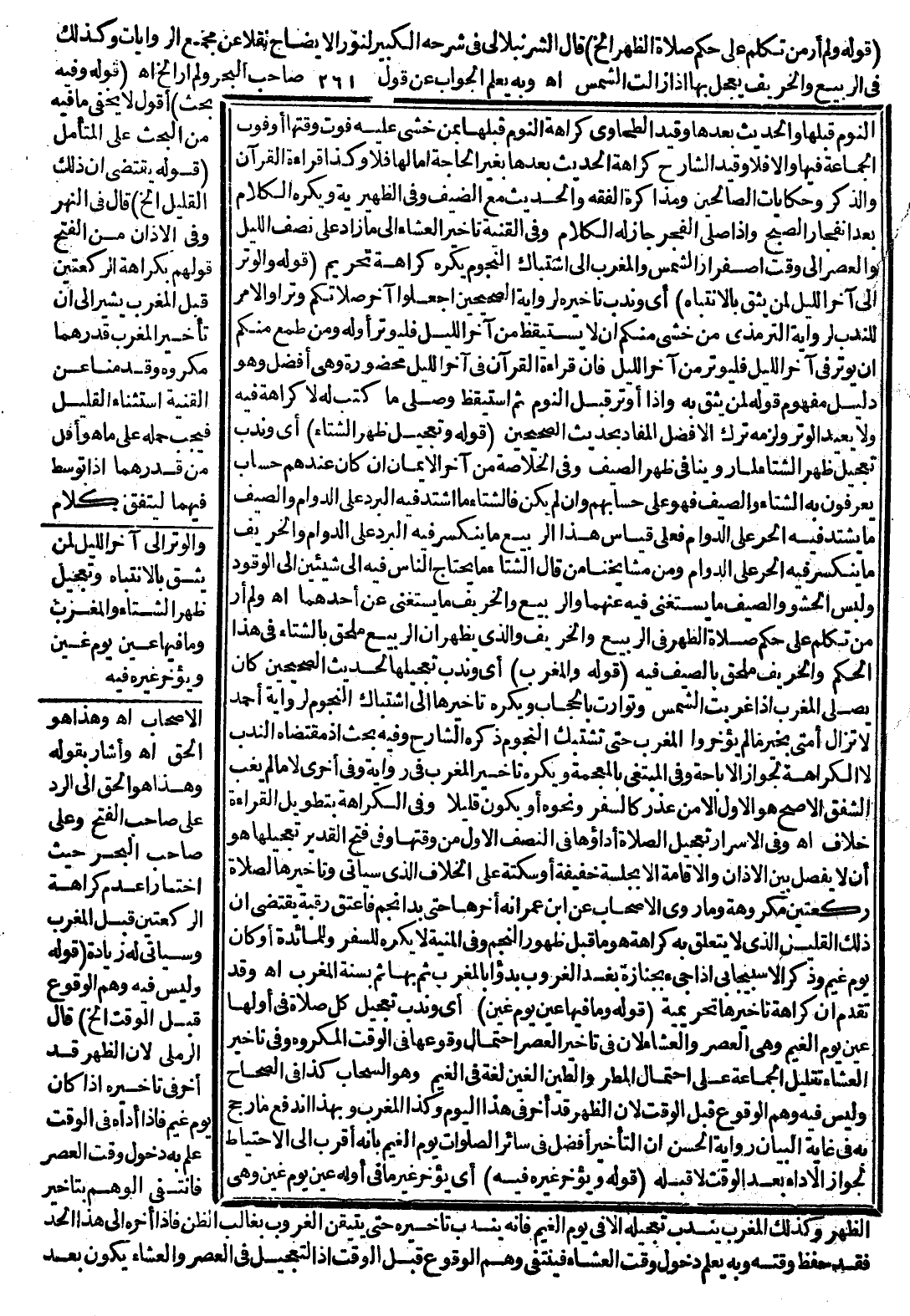 النَّوْمَ قَبْلَهَا وَالْحَدِيثَ بَعْدَهَا» وَقَيَّدَ الطَّحَاوِيُّ كَرَاهَةَ النَّوْمِ قَبْلَهَا بِمَنْ خُشِيَ عَلَيْهِ فَوْتُ وَقْتِهَا أَوْ فَوْتُ الْجَمَاعَةِ فِيهَا وَإِلَّا فَلَا وَقَيَّدَ الشَّارِحُ كَرَاهَةَ الْحَدِيثِ بَعْدَهَا بِغَيْرِ الْحَاجَةِ، أَمَّا لَهَا فَلَا وَكَذَا قِرَاءَةُ الْقُرْآنِ وَالذِّكْرِ وَحِكَايَاتِ الصَّالِحِينَ وَمُذَاكَرَةُ الْفِقْهِ وَالْحَدِيثِ مَعَ الضَّيْفِ وَفِي الظَّهِيرِيَّةِ وَيُكْرَهُ الْكَلَامُ بَعْدَ انْفِجَارِ الصُّبْحِ وَإِذَا صَلَّى الْفَجْرَ جَازَ لَهُ الْكَلَامُ، وَفِي الْقُنْيَةِ تَأْخِيرُ الْعِشَاءِ إلَى مَا زَادَ عَلَى نِصْفِ اللَّيْلِ وَالْعَصْرِ إلَى وَقْتِ اصْفِرَارِ الشَّمْسِ وَالْمَغْرِبِ إلَى اشْتِبَاكِ النُّجُومِ يُكْرَهُ كَرَاهَةَ تَحْرِيمٍ. (قَوْلُهُ: وَالْوِتْرُ إلَى آخِرِ اللَّيْلِ لِمَنْ يَثِقُ بِالِانْتِبَاهِ) أَيْ وَنُدِبَ تَأْخِيرُهُ لِرِوَايَةِ الصَّحِيحَيْنِ «اجْعَلُوا آخِرَ صَلَاتِكُمْ وِتْرًا» وَالْأَمْرُ لِلنَّدْبِ لِرِوَايَةِ التِّرْمِذِيِّ «مَنْ خَشِيَ مِنْكُمْ أَنْ لَا يَسْتَيْقِظَ مِنْ آخِرِ اللَّيْلِ فَلْيُوتِرْ أَوَّلَهُ وَمَنْ طَمِعَ مِنْكُمْ أَنْ يُوتِرَ فِي آخِرِ اللَّيْلِ فَلْيُوتِرْ مِنْ آخِرِ اللَّيْلِ فَإِنَّ قِرَاءَةَ الْقُرْآنِ فِي آخِرِ اللَّيْلِ مَحْضُورَةٌ» وَهِيَ أَفْضَلُ وَهُوَ دَلِيلٌ مَفْهُومٌ قَوْلُهُ لِمَنْ يَثِقُ بِهِ وَإِذَا أَوْتَرَ قَبْلَ النَّوْمِ، ثُمَّ اسْتَيْقَظَ وَصَلَّى مَا كُتِبَ لَهُ لَا كَرَاهَةَ فِيهِ وَلَا يُعِيدُ الْوِتْرَ وَلَزِمَهُ تَرْكُ الْأَفْضَلِ الْمُفَادِ بِحَدِيثِ الصَّحِيحَيْنِ. (قَوْلُهُ: وَتَعْجِيلُ ظُهْرِ الشِّتَاءِ) أَيْ وَنُدِبَ تَعْجِيلُ ظُهْرِ الشِّتَاءِ لِمَا رَوَيْنَا فِي ظُهْرِ الصَّيْفِ وَفِي الْخُلَاصَةِ مَنْ أَخَّرَ الْإِيمَانَ إنْ كَانَ عِنْدَهُمْ حِسَابٌ يَعْرِفُونَ بِهِ الشِّتَاءَ وَالصَّيْفَ فَهُوَ عَلَى حِسَابِهِمْ وَإِنْ لَمْ يَكُنْ فَالشِّتَاءُ مَا اشْتَدَّ فِيهِ الْبَرْدُ عَلَى الدَّوَامِ وَالصَّيْفُ مَا يَشْتَدُّ فِيهِ الْحَرُّ عَلَى الدَّوَامِ، فَعَلَى قِيَاسِ هَذَا الرَّبِيعُ مَا يَنْكَسِرُ فِيهِ الْبَرْدُ عَلَى الدَّوَامِ وَالْخَرِيفُ مَا يَنْكَسِرُ فِيهِ الْحَرُّ عَلَى الدَّوَامِ وَمِنْ مَشَايِخِنَا مَنْ قَالَ الشِّتَاءُ مَا يَحْتَاجُ النَّاسُ فِيهِ إلَى شَيْئَيْنِ إلَى الْوُقُودِ وَلُبْسِ الْحَشْوِ وَالصَّيْفُ مَا يُسْتَغْنَى فِيهِ عَنْهُمَا وَالرَّبِيعُ وَالْخَرِيفُ مَا يُسْتَغْنَى عَنْ أَحَدِهِمَا. اهـ.