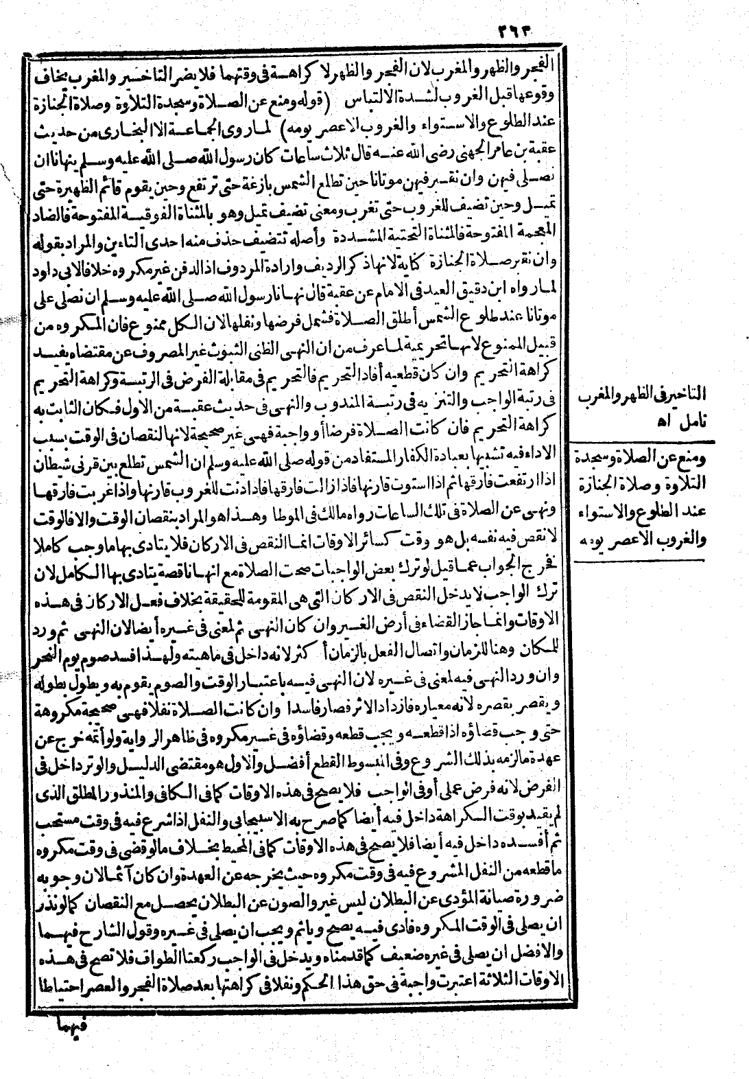 (قَوْلُهُ: وَمُنِعَ عَنْ الصَّلَاةِ وَسَجْدَةِ التِّلَاوَةِ وَصَلَاةِ الْجِنَازَةِ عِنْدَ الطُّلُوعِ وَالِاسْتِوَاءِ وَالْغُرُوبِ إلَّا عَصْرُ يَوْمِهِ) لِمَا رَوَى الْجَمَاعَةُ إلَّا الْبُخَارِيَّ مِنْ حَدِيثِ عُقْبَةَ بْنِ عَامِرٍ الْجُهَنِيِّ - رَضِيَ اللَّهُ عَنْهُ - قَالَ «ثَلَاثُ سَاعَاتٍ كَانَ رَسُولُ اللَّهِ - صَلَّى اللَّهُ عَلَيْهِ وَسَلَّمَ - يَنْهَانَا أَنْ نُصَلِّيَ فِيهِنَّ وَأَنْ نَقْبُرَ فِيهِنَّ مَوْتَانَا حِينَ تَطْلُعُ الشَّمْسُ بَازِغَةً حَتَّى تَرْتَفِعَ وَحِينَ يَقُومُ قَائِمُ الظَّهِيرَةِ حَتَّى تَمِيلَ وَحِينَ تَضَيَّفُ لِلْغُرُوبِ حَتَّى تَغْرُبَ» وَمَعْنَى تُضَيَّفُ تَمِيلُ وَهُوَ بِالْمُثَنَّاةِ الْفَوْقِيَّةِ الْمَفْتُوحَةِ فَالضَّادُ الْمُعْجَمَةُ الْمَفْتُوحَةُ فَالْمُثَنَّاةُ التَّحْتِيَّةُ الْمُشَدَّدَةُ وَأَصْلُهُ تَتَضَيَّفُ حُذِفَ مِنْهُ إحْدَى التَّاءَيْنِ وَالْمُرَادُ بِقَوْلِهِ وَأَنْ نَقْبُرَ صَلَاةُ الْجِنَازَةِ كِنَايَةٌ؛ لِأَنَّهَا ذِكْرُ الرَّدِيفِ وَإِرَادَةُ الْمَرْدُوفِ إذْ الدَّفْنُ غَيْرُ مَكْرُوهٍ خِلَافًا لِأَبِي دَاوُد لِمَا رَوَاهُ ابْنُ دَقِيقِ الْعِيدِ فِي الْإِمَامِ عَنْ عُقْبَةَ قَالَ «نَهَانَا رَسُولُ اللَّهِ - صَلَّى اللَّهُ عَلَيْهِ وَسَلَّمَ - أَنْ نُصَلِّيَ عَلَى مَوْتَانَا عِنْدَ طُلُوعِ الشَّمْسِ» أَطْلَقَ الصَّلَاةَ فَشَمِلَ فَرْضَهَا وَنَفْلَهَا؛ لِأَنَّ الْكُلَّ مَمْنُوعٌ فَإِنَّ الْمَكْرُوهَ مِنْ قَبِيلِ الْمَمْنُوعِ؛ لِأَنَّهَا تَحْرِيمِيَّةٌ لِمَا عُرِفَ مِنْ أَنَّ النَّهْيَ الظَّنِّيَّ الثُّبُوتِ غَيْرُ الْمَصْرُوفِ عَنْ مُقْتَضَاهُ يُفِيدُ كَرَاهَةَ التَّحْرِيمِ وَإِنْ كَانَ قَطْعِيَّهُ أَفَادَ التَّحْرِيمَ فَالتَّحْرِيمُ فِي مُقَابَلَةِ الْفَرْضِ فِي الرُّتْبَةِ وَكَرَاهَةُ التَّحْرِيمِ فِي رُتْبَةِ الْوَاجِبِ وَالتَّنْزِيهُ فِي رُتْبَةِ الْمَنْدُوبِ وَالنَّهْيُ فِي حَدِيثِ عُقْبَةَ مِنْ الْأَوَّلِ فَكَانَ الثَّابِتُ بِهِ كَرَاهَةُ التَّحْرِيمِ،