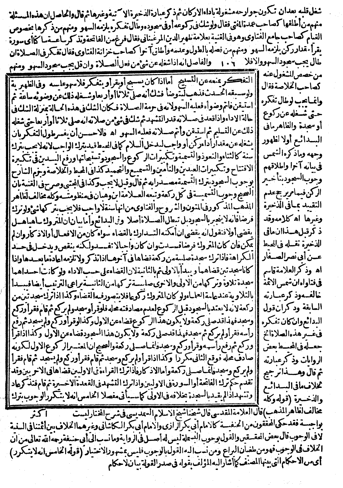وَالْحَاصِلُ أَنَّ هَذِهِ الْمَسْأَلَةَ مِنْهُمْ مَنْ أَطْلَقَهَا كَصَاحِبِ عُمْدَةَ الْمُفْتِي فَقَالَ وَلَوْ شَكَّ فِي رُكُوعِهِ أَوْ فِي سُجُودِ وَطَالَ تَفَكُّرُهُ يَلْزَمُهُ السَّهْوُ وَمِنْهُمْ مَنْ ذَكَرَهَا بِخُصُوصِ الْقِيَامِ كَصَاحِبِ جَامِعِ الْفَتَاوَى وَهُوَ فِي الْقُنْيَةِ بِعَلَامَةِ ظَهِيرِ الدِّينِ الْمَرْغِينَانِيِّ فَقَالَ فَرَغَ مِنْ الْفَاتِحَةِ وَتَذَكَّرَ سَاعَةً سَاكِنًا أَيْ سُورَةً يَقْرَأُ مِقْدَارَ رُكْنٍ يَلْزَمُهُ السَّهْوُ وَمِنْهُمْ مَنْ فَصَّلَهُ بِالطُّولِ وَعَدَمِهِ وَأَطْلَقَ آخِرًا كَصَاحِبِ خِزَانَةِ الْفَتَاوَى فَقَالَ تَفَكَّرَ فِي الصَّلَاةِ إنْ طَالَ يَجِبُ سُجُودُ السَّهْوِ وَإِلَّا فَلَا وَالْفَاصِلُ أَنَّهُ إذَا شَغَلَهُ عَنْ شَيْءٍ مِنْ فِعْلِ الصَّلَاةِ وَإِنْ قَلَّ يَجِبُ سُجُودُ السَّهْوِ وَمِنْهُمْ مَنْ خَصَّصَ الْمَشْغُولَ عَنْهُ كَصَاحِبِ الْخُلَاصَةِ فَقَالَ وَإِنَّمَا يَجِبُ لَوْ طَالَ تَفَكُّرُهُ حَتَّى شَغَلَهُ عَنْ رُكُوعٍ أَوْ سَجْدَةٍ