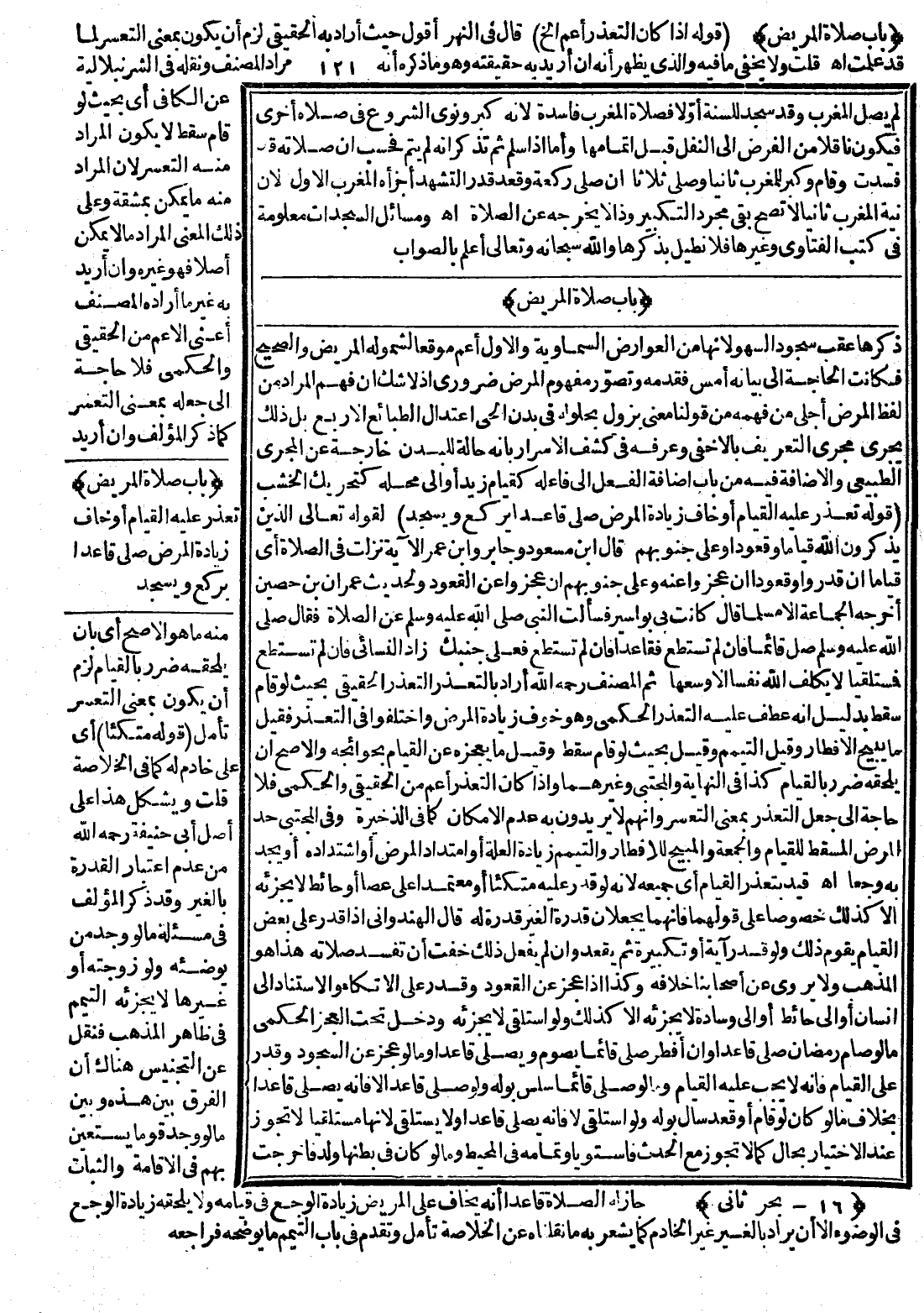 (بَابُ صَلَاةِ الْمَرِيضِ) ذَكَرَهَا عَقِبَ سُجُودِ السَّهْوِ لِأَنَّهَا مِنْ الْعَوَارِضِ السَّمَاوِيَّةِ وَالْأَوَّلُ أَعَمُّ مَوْقِعًا لِشُمُولِهِ الْمَرِيضَ وَالصَّحِيحَ فَكَانَتْ الْحَاجَةُ إلَى بَيَانِهِ أَمَسُّ فَقَدَّمَهُ وَتَصَوُّرُ مَفْهُومِ الْمَرَضِ ضَرُورِيٌّ إذْ لَا شَكَّ أَنَّ فَهْمَ الْمُرَادِ مِنْ لَفْظِ الْمَرَضِ أَجْلَى مِنْ فَهْمِهِ مِنْ قَوْلِنَا مَعْنًى يَزُولُ بِحُلُولِهِ فِي بَدَنِ الْحَيِّ اعْتِدَالُ الطَّبَائِعِ الْأَرْبَعِ بَلْ ذَلِكَ يَجْرِي مَجْرَى التَّعْرِيفِ بِالْأَخْفَى وَعَرَّفَهُ فِي كَشْفِ الْأَسْرَارِ بِأَنَّهُ حَالَةٌ لِلْبَدَنِ خَارِجَةٌ عَنْ الْمَجْرَى الطَّبِيعِيِّ وَالْإِضَافَةُ فِيهِ مِنْ بَابِ إضَافَةِ الْفِعْلِ إلَى فَاعِلِهِ كَقِيَامِ زَيْدٍ أَوْ إلَى مَحَلِّهِ كَتَحْرِيكِ الْخَشَبِ (قَوْلُهُ تَعَذَّرَ عَلَيْهِ الْقِيَامُ أَوْ خَافَ زِيَادَةَ الْمَرَضِ صَلَّى قَاعِدًا يَرْكَعُ وَيَسْجُدُ) لِقَوْلِهِ تَعَالَى {الَّذِينَ يَذْكُرُونَ اللَّهَ قِيَامًا وَقُعُودًا وَعَلَى جُنُوبِهِمْ} [آل عمران: 191] قَالَ ابْنُ مَسْعُودٍ وَجَابِرٌ وَابْنُ عُمَرَ الْآيَةَ نَزَلَتْ فِي الصَّلَاةِ أَيْ قِيَامًا إنْ قَدَرُوا وَقُعُودًا إنْ عَجَزُوا عَنْهُ وَعَلَى جُنُوبِهِمْ إنْ عَجَزُوا عَنْ الْقُعُودِ وَلِحَدِيثِ عُمَرَ بْنِ حُصَيْنٍ أَخْرَجَهُ الْجَمَاعَةُ إلَّا مُسْلِمًا «قَالَ كَانَتْ بِي بَوَاسِيرُ فَسَأَلْت النَّبِيَّ - صَلَّى اللَّهُ عَلَيْهِ وَسَلَّمَ - عَنْ الصَّلَاةِ فَقَالَ - صَلَّى اللَّهُ عَلَيْهِ وَسَلَّمَ - صَلِّ قَائِمًا فَإِنْ لَمْ تَسْتَطِعْ فَقَاعِدًا فَإِنْ لَمْ تَسْتَطِعْ فَعَلَى جَنْبِك» زَادَ النَّسَائِيُّ «فَإِنْ لَمْ تَسْطِيعْ فَمُسْتَلْقِيًا لَا يُكَلِّفُ اللَّهُ نَفْسًا إلَّا وُسْعَهَا» ثُمَّ الْمُصَنِّفُ - رَحِمَهُ اللَّهُ - أَرَادَ بِالتَّعَذُّرِ التَّعَذُّرَ الْحَقِيقِيَّ بِحَيْثُ لَوْ قَامَ سَقَطَ بِدَلِيلِ أَنَّهُ عَطَفَ عَلَيْهِ التَّعَذُّرَ الْحُكْمِيَّ وَهُوَ خَوْفُ زِيَادَةِ الْمَرَضِ وَاخْتَلَفُوا فِي التَّعَذُّرِ فَقِيلَ مَا يُبِيحُ الْإِفْطَارَ وَقِيلَ التَّيَمُّمَ وَقِيلَ بِحَيْثُ لَوْ قَامَ سَقَطَ وَقِيلَ مَا يُعْجِزُهُ عَنْ الْقِيَامِ بِحَوَائِجِهِ وَالْأَصَحُّ أَنْ يَلْحَقَهُ ضَرَرٌ بِالْقِيَامِ كَذَا فِي النِّهَايَةِ وَالْمُجْتَبَى وَغَيْرِهِمَا وَإِذَا كَانَ التَّعَذُّرُ أَعَمَّ مِنْ الْحَقِيقِيِّ وَالْحُكْمِيِّ فَلَا حَاجَةَ إلَى جَعْلِ التَّعَذُّرِ بِمَعْنَى التَّعَسُّرِ وَإِنَّهُمْ لَا يُرِيدُونَ بِهِ عَدَمَ الْإِمْكَانِ كَمَا فِي الذَّخِيرَةِ