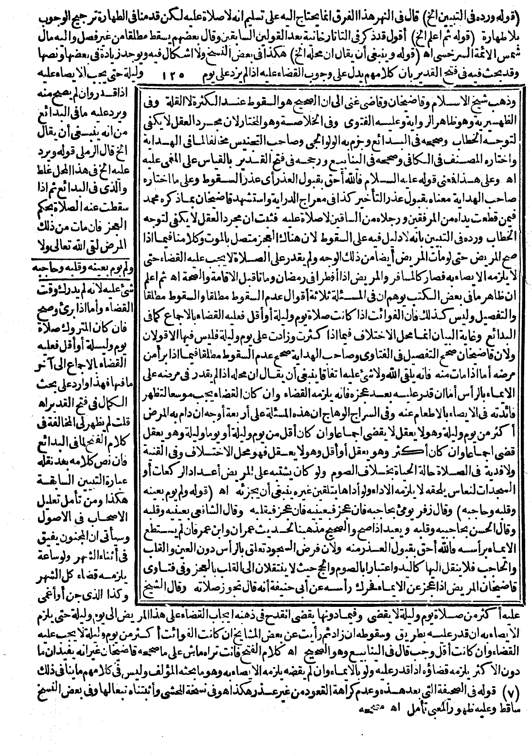 وَذَهَبَ شَيْخُ الْإِسْلَامِ وَقَاضِي خَانْ وَقَاضِي غَنِيٍّ إلَى أَنَّ الصَّحِيحَ هُوَ السُّقُوطُ عَنْ الْكَثْرَةِ لَا الْقِلَّةِ وَفِي الظَّهِيرِيَّةِ وَهُوَ ظَاهِرُ الرِّوَايَةِ وَعَلَيْهِ الْفَتْوَى وَفِي الْخُلَاصَةِ وَهُوَ الْمُخْتَارُ لِأَنَّ مُجَرَّدَ الْعَقْلِ لَا يَكْفِي لِتَوَجُّهِ الْخِطَابِ وَصَحَّحَ فِي الْبَدَائِعِ وَجَزَمَ بِهِ الْوَلْوَالِجِيُّ وَصَاحِبُ التَّجْنِيسِ مُخَالِفًا لِمَا فِي الْهِدَايَةِ وَاخْتَارَهُ الْمُصَنِّفُ فِي الْكَافِي وَصَحَّحَهُ فِي الْيَنَابِيعِ وَرَجَّحَهُ فِي فَتْحِ الْقَدِيرِ بِالْقِيَاسِ عَلَى الْمُغْمَى عَلَيْهِ اهـ.