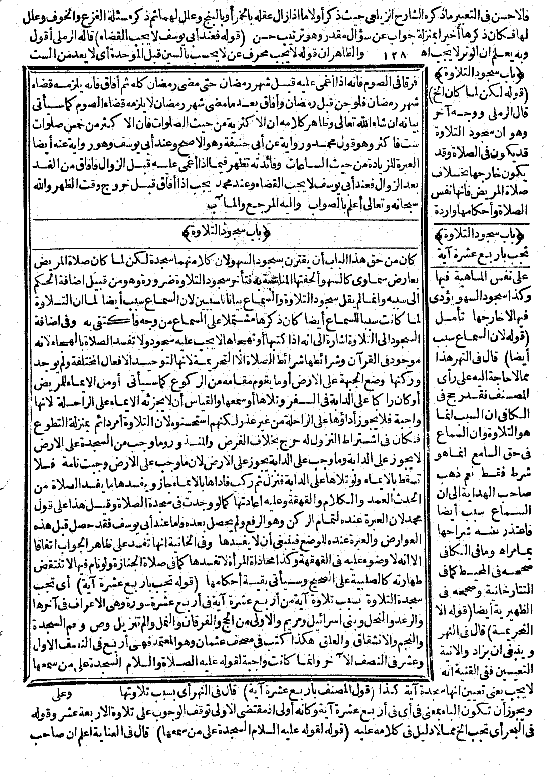 (قَوْلُهُ تَجِبُ بِأَرْبَعَ عَشْرَةَ آيَةً) أَيْ تَجِبُ سَجْدَةُ التِّلَاوَةِ بِسَبَبِ تِلَاوَةِ آيَةٍ مِنْ أَرْبَعَ عَشَرَةَ آيَةً فِي أَرْبَعَ عَشْرَةَ سُورَةً وَهِيَ: الْأَعْرَافُ فِي آخِرِهَا وَالرَّعْدُ وَالنَّحْلُ وَبَنِي إسْرَائِيلَ وَمَرْيَمُ وَالْأُولَى مِنْ الْحَجِّ وَالْفُرْقَانُ وَالنَّمْلُ والم تَنْزِيلُ وص وحم السَّجْدَةُ وَالنَّجْمُ وَالِانْشِقَاقُ وَالْعَلَقُ هَكَذَا كُتِبَ فِي مُصْحَفِ عُثْمَانَ، وَهُوَ الْمُعْتَمَدُ فَهِيَ أَرْبَعٌ فِي النِّصْفِ الْأَوَّلِ وَعَشْرٌ فِي النِّصْفِ الْآخِرِ، وَإِنَّمَا كَانَتْ وَاجِبَةً لِقَوْلِهِ - عَلَيْهِ الصَّلَاةُ وَالسَّلَامُ - «السَّجْدَةُ عَلَى مَنْ سَمِعَهَا»