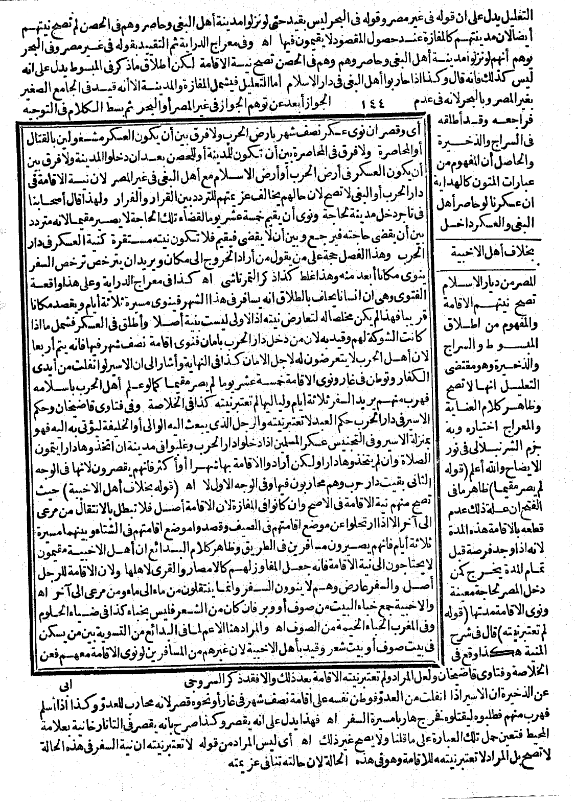 وَالْحَاصِلُ أَنَّ الْمَفْهُومَ مِنْ عِبَارَاتِ الْمُتُونِ كَالْهِدَايَةِ أَنَّ عَسْكَرنَا لَوْ حَاصَرَ أَهْلَ الْبَغْيِ، وَالْعَسْكَرُ دَاخِلَ الْمِصْرِ مِنْ دِيَارِ الْإِسْلَامِ تَصِحُّ نِيَّتُهُمْ الْإِقَامَةَ وَالْمَفْهُومُ مِنْ إطْلَاقِ الْمَبْسُوطِ وَالسِّرَاجِ وَالذَّخِيرَةِ، وَهُوَ مُقْتَضَى التَّعْلِيلِ أَنَّهَا لَا تَصِحُّ وَظَاهِرُ كَلَامِ الْعِنَايَةِ وَالْمِعْرَاجِ اخْتِيَارُهُ وَبِهِ جَزَمَ الشُّرُنْبُلَالِيُّ فِي نُورِ الْإِيضَاحِ وَاَللَّهُ أَعْلَمُ.