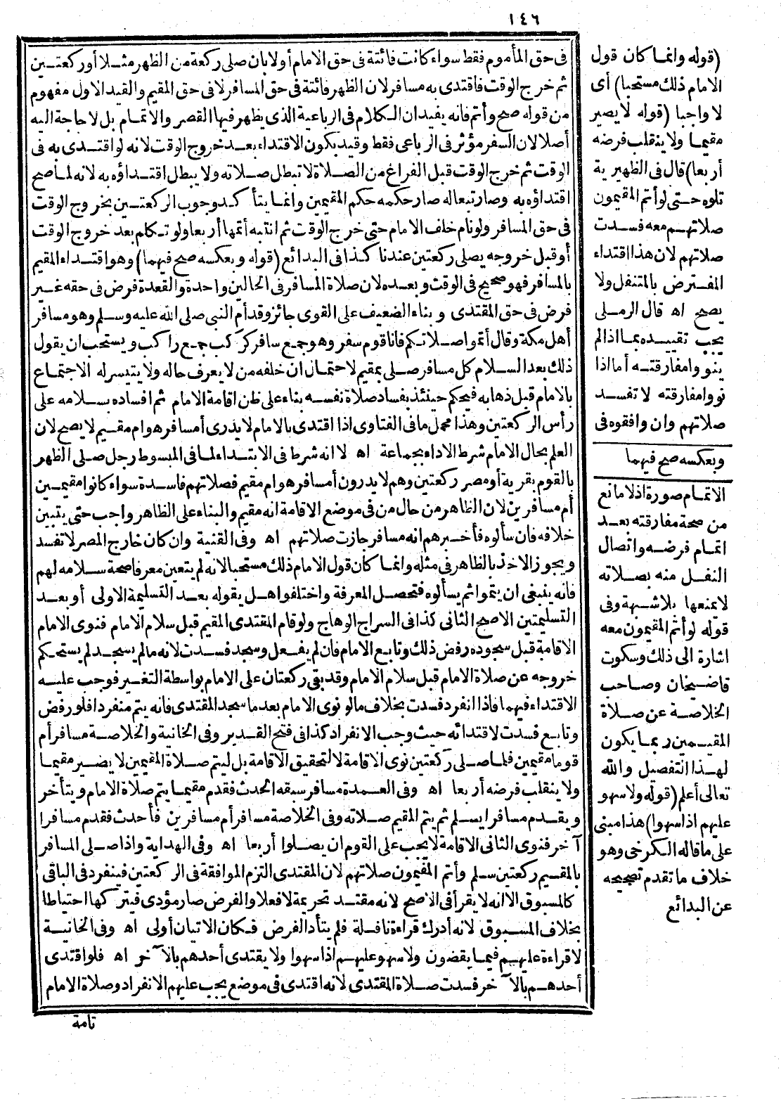 وَفِي الْقُنْيَةِ، وَإِنْ كَانَ خَارِجَ الْمِصْرِ لَا تَفْسُدُ وَيَجُوزُ الْأَخْذُ بِالظَّاهِرِ فِي مِثْلِهِ، وَإِنَّمَا كَانَ قَوْلُ الْإِمَامِ ذَلِكَ مُسْتَحَبًّا؛ لِأَنَّهُ لَمْ يَتَعَيَّنْ مُعَرِّفًا صِحَّةَ سَلَامِهِ لَهُمْ فَإِنَّهُ يَنْبَغِي أَنْ يُتِمُّوا ثُمَّ يَسْأَلُوهُ فَتَحْصُلُ الْمَعْرِفَةُ وَاخْتَلَفُوا هَلْ يَقُولُهُ بَعْدَ التَّسْلِيمَةِ الْأُولَى أَوْ بَعْدَ التَّسْلِيمَتَيْنِ الْأَصَحُّ الثَّانِي كَذَا فِي السِّرَاجِ الْوَهَّاجِ، وَلَوْ قَامَ الْمُقْتَدِي الْمُقِيمُ قَبْلَ سَلَامِ الْإِمَامِ فَنَوَى الْإِمَامُ الْإِقَامَةَ قَبْلَ سُجُودِهِ رُفِضَ ذَلِكَ وَتَابَعَ الْإِمَامَ، فَإِنْ لَمْ يَفْعَلْ وَسَجَدَ فَسَدَتْ؛ لِأَنَّهُ مَا لَمْ يَسْجُدْ لَمْ يَسْتَحْكِمْ خُرُوجُهُ عَنْ صَلَاةِ الْإِمَامِ قَبْلَ سَلَامِ الْإِمَامِ وَقَدْ بَقِيَ رَكْعَتَانِ عَلَى الْإِمَامِ بِوَاسِطَةِ التَّغَيُّرِ فَوَجَبَ عَلَيْهِ الِاقْتِدَاءُ فِيهِمَا فَإِذَا انْفَرَدَ فَسَدَتْ بِخِلَافِ مَا لَوْ نَوَى الْإِمَامُ بَعْدَمَا سَجَدَ الْمُقْتَدِي فَإِنَّهُ يُتِمُّ مُنْفَرِدًا فَلَوْ رَفَضَ وَتَابَعَ فَسَدَتْ لِاقْتِدَائِهِ حَيْثُ وَجَبَ الِانْفِرَادُ كَذَا فِي فَتْحِ الْقَدِيرِ، وَفِي الْخَانِيَّةِ وَالْخُلَاصَةِ مُسَافِرٌ أَمَّ قَوْمًا مُقِيمِينَ فَلَمَّا صَلَّى رَكْعَتَيْنِ نَوَى الْإِقَامَةَ لَا لِتَحْقِيقِ الْإِقَامَةِ بَلْ لِيُتِمَّ صَلَاةَ الْمُقِيمِينَ لَا يَصِيرُ مُقِيمًا، وَلَا يَنْقَلِبُ فَرْضُهُ أَرْبَعًا اهـ.