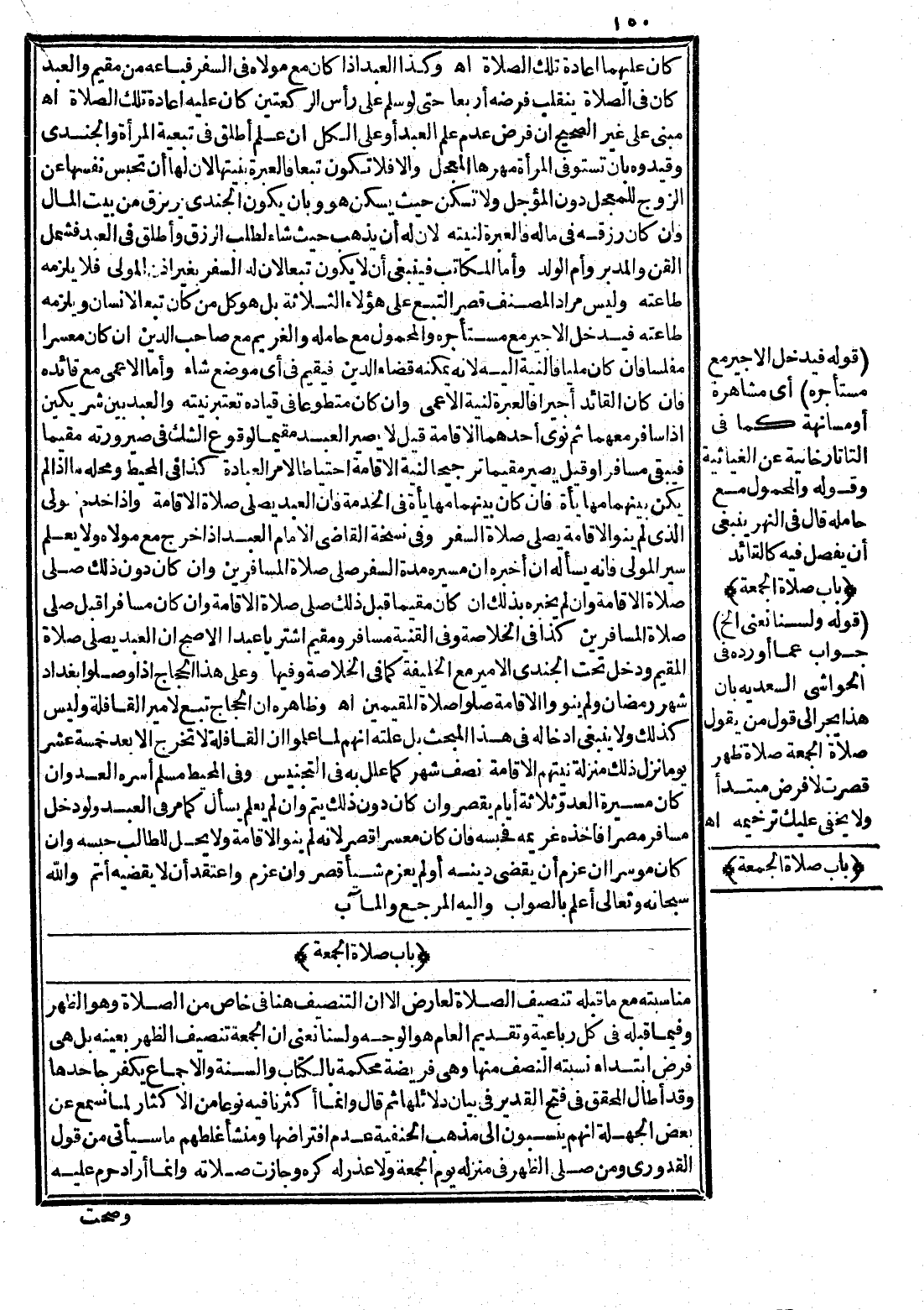 مُنَاسَبَتُهُ مَعَ مَا قَبْلَهُ تَنْصِيفُ الصَّلَاةِ لِعَارِضٍ إلَّا أَنَّ التَّنْصِيفَ هُنَا فِي خَاصٍّ مِنْ الصَّلَاةِ، وَهُوَ الظُّهْرُ وَفِيمَا قَبْلَهُ فِي كُلِّ رُبَاعِيَّةٍ وَتَقْدِيمُ الْعَامِّ هُوَ الْوَجْهُ وَلَسْنَا نَعْنِي أَنَّ الْجُمُعَةَ تَنْصِيفُ الظُّهْرِ بِعَيْنِهِ بَلْ هِيَ فَرْضٌ ابْتِدَاءً نِسْبَتُهُ النِّصْفُ مِنْهَا وَهِيَ فَرِيضَةٌ مُحْكَمَةٌ بِالْكِتَابِ وَالسُّنَّةِ وَالْإِجْمَاعِ يَكْفُرُ جَاحِدُهَا وَقَدْ أَطَالَ الْمُحَقِّقُ فِي فَتْحِ الْقَدِيرِ فِي بَيَانِ دَلَائِلِهَا ثُمَّ قَالَ، وَإِنَّمَا أَكْثَرْنَا فِيهِ نَوْعًا مِنْ الْإِكْثَارِ لِمَا نَسْمَعُ عَنْ بَعْضِ الْجَهَلَةِ أَنَّهُمْ يَنْسُبُونَ إلَى مَذْهَبِ الْحَنَفِيَّةِ عَدَمَ افْتِرَاضِهَا وَمَنْشَأُ غَلَطِهِمْ مَا سَيَأْتِي مِنْ قَوْلِ الْقُدُورِيِّ، وَمَنْ صَلَّى الظُّهْرَ فِي مَنْزِلِهِ يَوْمَ الْجُمُعَةِ، وَلَا عُذْرَ لَهُ كُرِهَ وَجَازَتْ صَلَاتُهُ، وَإِنَّمَا أَرَادَ حَرُمَ عَلَيْهِ
