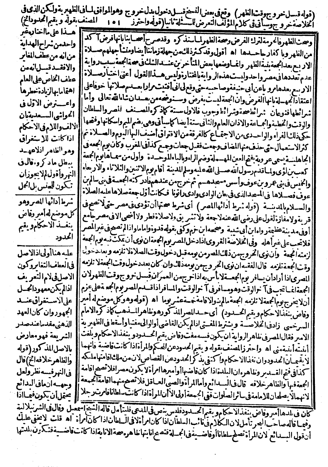 ـــــــــــــــــــــــــــــQ (قَوْلُهُ قَبْلَ خُرُوجِ وَقْتِ الظُّهْرِ) وَقَعَ فِي بَعْضِ النُّسَخِ قَبْلَ دُخُولِ بَدَلَ خُرُوجِ، وَهُوَ الْمُوَافِقُ لِمَا فِي الظَّهِيرِيَّةِ وَلَكِنَّ الَّذِي فِي الْخُلَاصَةِ خُرُوجٌ وَسَيَأْتِي فِي كَلَامِ الْمُؤَلِّفِ التَّعَرُّضُ لِلْمَسْأَلَةِ ثَانِيًا (قَوْلُهُ وَاحْتَرَزَ الْمُصَنِّفُ بِقَوْلِهِ وَيُقِيمُ الْحُدُودَ إلَخْ) هَذَا عَلَى مَا اخْتَارَهُ غَيْرُ وَاحِدٍ مِنْ شُرَّاحِ الْهِدَايَةِ مِنْ أَنَّهُ مِنْ عَطْفِ الْمُغَايِرِ وَإِلَّا فَقَدْ قِيلَ: إنَّهُ مِنْ عَطْفِ الْخَاصِّ عَلَى الْعَامِّ اهْتِمَامًا بِهَا لِزِيَادَةِ خَطَرِهَا وَاعْتُرِضَ الْأَوَّلُ فِي الْحَوَاشِي السَّعْدِيَّةِ بِأَنَّ الْأَلِفَ وَاللَّامَ فِي الْأَحْكَامِ إذَا كَانَتْ لِلِاسْتِغْرَاقِ، وَهُوَ الظَّاهِرُ إذْ لَا عَهْدَ يُبْطِلُ مَا ذَكَرُوهُ قَالَ فِي النَّهْرِ وَأَقُولُ: لِمَ لَا يَجُوزُ أَنْ تَكُونَ لِلْجِنْسِ بَلْ الْحَمْلُ عَلَيْهِ هُنَا أَوْلَى إذْ الْأَصْلُ فِي الْعَطْفِ التَّغَايُرُ وَكَوْنُ الْأَصْلِ فِي لَامِ التَّعْرِيفِ إذَا لَمْ يَكُنْ مَعْهُودُ الْحَمْلِ عَلَى الِاسْتِغْرَاقِ عِنْدَ الْجُمْهُورِ، وَإِنْ كَانَ الْعَهْدُ الذِّهْنِيُّ مُقَدَّمًا عِنْدَ صَدْرِ الشَّرِيعَةِ فَهُوَ مُعَارَضٌ بِالْأَصْلِ الْمَذْكُورِ