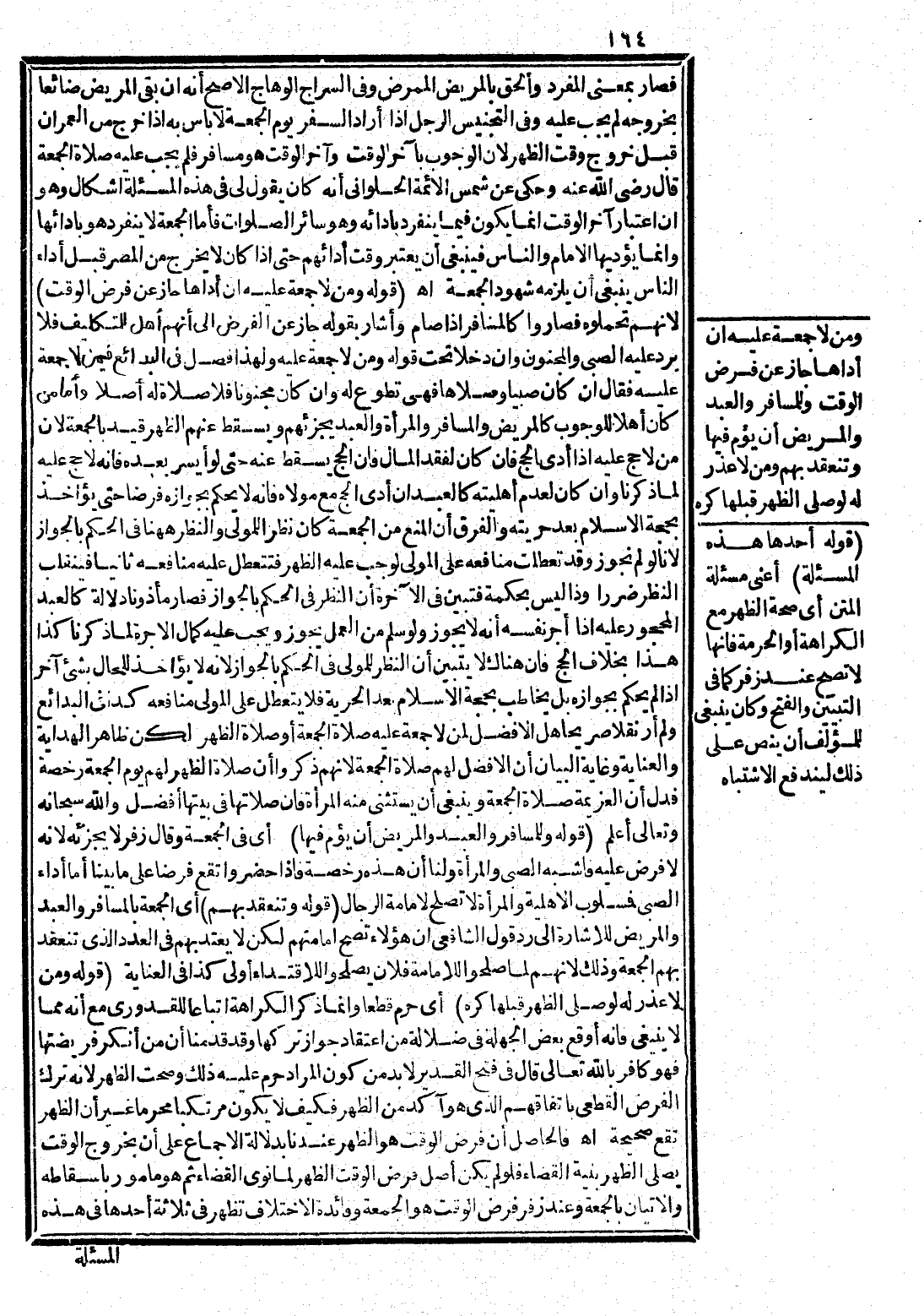 فَصَارَ بِمَعْنَى الْمُفْرَدِ وَأُلْحِقَ بِالْمَرِيضِ الْمُمَرِّضُ، وَفِي السِّرَاجِ الْوَهَّاجِ الْأَصَحُّ أَنَّهُ إنْ بَقِيَ الْمَرِيضُ ضَائِعًا بِخُرُوجِهِ لَمْ يَجِبْ عَلَيْهِ، وَفِي التَّجْنِيسِ الرَّجُلُ إذَا أَرَادَ السَّفَرَ يَوْمَ الْجُمُعَةِ لَا بَأْسَ بِهِ إذَا خَرَجَ مِنْ الْعُمْرَانِ قَبْلَ خُرُوجِ وَقْتِ الظُّهْرِ؛ لِأَنَّ الْوُجُوبَ بِآخِرِ الْوَقْتِ وَآخِرَ الْوَقْتِ هُوَ مُسَافِرٌ فَلَمْ يَجِبْ عَلَيْهِ صَلَاةُ الْجُمُعَةِ قَالَ - رَضِيَ اللَّهُ عَنْهُ - وَحُكِيَ عَنْ شَمْسِ الْأَئِمَّةِ الْحَلْوَانِيِّ أَنَّهُ كَانَ يَقُولُ لِي فِي هَذِهِ الْمَسْأَلَةِ إشْكَالٌ، وَهُوَ أَنَّ اعْتِبَارَ آخِرِ الْوَقْتِ إنَّمَا يَكُونُ فِيمَا يَنْفَرِدُ بِأَدَائِهِ، وَهُوَ سَائِرُ الصَّلَوَاتِ فَأَمَّا الْجُمُعَةُ لَا يَنْفَرِدُ هُوَ بِأَدَائِهَا، وَإِنَّمَا يُؤَدِّيهَا الْإِمَامُ وَالنَّاسُ فَيَنْبَغِي أَنْ يُعْتَبَرَ وَقْتُ أَدَائِهِمْ حَتَّى إذَا كَانَ لَا يَخْرُجُ مِنْ الْمِصْرِ قَبْلَ أَدَاءِ النَّاسِ يَنْبَغِي أَنْ يَلْزَمَهُ شُهُودُ الْجُمُعَةِ.