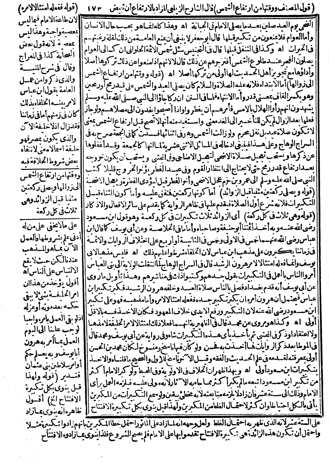 أَقُولُ: يُؤْخَذُ مِنْ هَذَا أَنَّ أَمْرَ الْخَلِيفَةِ بِشَيْءٍ لَا يَبْقَى حُكْمُهُ بَعْدَ مَوْتِهِ أَوْ عَزْلِهِ إذْ لَوْ بَقِيَ الْعَمَلُ بِأَمْرِهِ وَاجِبًا لَوَجَبَ عَلَيْنَا إلَى الْيَوْمِ الْعَمَلُ بِمَا أَمَرَ بِهِ هَارُونُ أَبَا يُوسُفَ وَبِهِ يُعْلَمُ حُكْمُ أَوَامِرِ سَلَاطِينِ بَنِي عُثْمَانَ فَتَدَبَّرْ (قَوْلُهُ؛ وَلِهَذَا قِيلَ يَنْوِي بِكُلِّ تَكْبِيرَةٍ الِافْتِتَاحَ إلَخْ) أَقُولُ: ظَاهِرُهُ أَنَّهُ يَنْوِي بِمَا زَادَ عَلَى السِّتَّةَ عَشَرَ؛ لِأَنَّهُ الَّذِي ظَهَرَ بِهِ احْتِمَالُ الْغَلَطِ وَلَعَلَّ وَجْهَهُ أَنَّهُ لَمَّا زَادَ عَلَى الْمَأْثُورِ احْتَمَلَ خَطَأَ الْمُكَبِّرِينَ بِأَنَّهُمْ زَادُوا تَكْبِيرَةً مَثَلًا وَاحْتُمِلَ أَنْ تَكُونَ هَذِهِ الزَّائِدَةُ هِيَ تَكْبِيرَةُ الِافْتِتَاحِ تَقَدَّمُوا بِهَا عَلَى الْإِمَامِ فَلَمْ يَصِحَّ الشُّرُوعُ فَلِذَا يَنْوِي بِمَا زَادَهُ الِافْتِتَاحَ