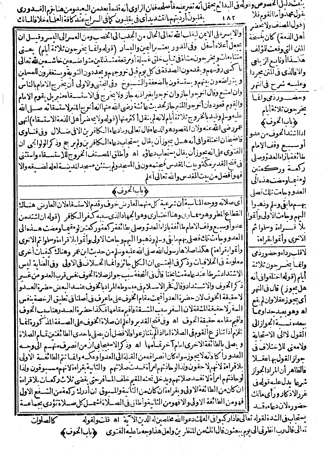 (بَابُ الْخَوْفِ) أَيْ صَلَاتُهُ وَوَجْهُ الْمُنَاسَبَةِ أَنَّ شَرْعِيَّةَ كُلٍّ مِنْهُمَا لِعَارِضِ خَوْفٍ وَقَدَّمَ الِاسْتِسْقَاءَ؛ لِأَنَّ الْعَارِضَ هُنَاكَ انْقِطَاعُ الْمَطَرِ، وَهُوَ سَمَاوِيٌّ وَهُنَا اخْتِيَارِيٌّ، وَهُوَ الْجِهَادُ الَّذِي سَبَبُهُ كُفْرُ الْكَافِرِ (قَوْلُهُ إنْ اشْتَدَّ مِنْ عَدُوٍّ أَوْ سَبُعٍ وَقَفَ الْإِمَامُ طَائِفَةً بِإِزَاءِ الْعَدُوِّ وَصَلَّى بِطَائِفَةٍ رَكْعَةً وَرَكْعَتَيْنِ لَوْ مُقِيمًا وَمَضَتْ هَذِهِ إلَى الْعَدُوِّ وَجَاءَتْ تِلْكَ فَصَلَّى بِهِمْ مَا بَقِيَ وَسَلَّمَ وَذَهَبُوا إلَيْهِمْ وَجَاءَتْ الْأُولَى وَأَتَمُّوا بِلَا قِرَاءَةٍ وَسَلَّمُوا ثُمَّ الْأُخْرَى وَأَتَمُّوا بِقِرَاءَةٍ) هَكَذَا صَلَّاهَا رَسُولُ اللَّهِ - صَلَّى اللَّهُ عَلَيْهِ وَسَلَّمَ - مِنْ حَدِيثِ ابْنِ عُمَرَ وَهُنَاكَ كَيْفِيَّاتٌ أُخْرَى مَعْلُومَةٌ فِي الْخِلَافِيَّاتِ وَذُكِرَ فِي الْمُجْتَبَى أَنَّ الْكُلَّ جَائِزٌ، وَإِنَّمَا الْخِلَافُ فِي الَأَوْلَى، وَفِي الْعِنَايَةِ لَيْسَ الِاشْتِدَادُ شَرْطًا عِنْدَ عَامَّةِ مَشَايِخِنَا قَالَ فِي التُّحْفَةِ سَبَبُ جَوَازِ صَلَاةِ الْخَوْفِ نَفْسُ قُرْبِ الْعَدُوِّ مِنْ غَيْرِ ذِكْرِ الْخَوْفِ وَالِاشْتِدَادِ وَقَالَ فَخْرُ الْإِسْلَامِ فِي مَبْسُوطِهِ: الْمُرَادُ بِالْخَوْفِ عِنْدَ الْبَعْضِ حَضْرَةُ الْعَدُوِّ لَا حَقِيقَةُ الْخَوْفِ؛ لِأَنَّ حَضْرَةَ الْعَدُوِّ أُقِيمَتْ مَقَامَ الْخَوْفِ عَلَى مَا عُرِفَ فِي أَصْلِنَا فِي تَعْلِيقِ الرُّخْصَةِ بِنَفْسِ السَّفَرِ لَا حَقِيقَةُ الْمَشَقَّةِ؛ لِأَنَّ السَّفَرَ سَبَبُ الْمَشَقَّةِ فَأُقِيمَ مَقَامَهَا فَكَذَا حَضْرَةُ الْعَدُوِّ وَهُنَا سَبَبُ الْخَوْفِ فَأُقِيمَ مَقَامَهُ حَقِيقَةُ الْخَوْفِ اهـ.