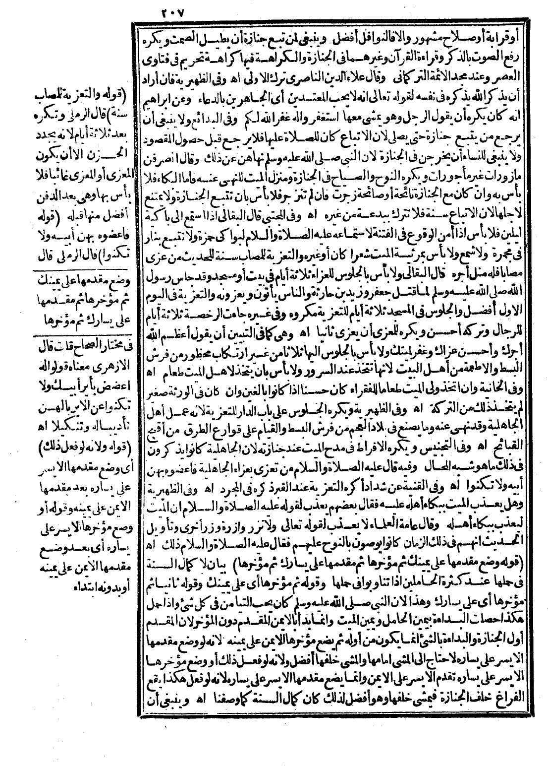 أَوْ قَرَابَةٍ أَوْ صَلَاحٍ مَشْهُورٍ وَإِلَّا فَالنَّوَافِلُ أَفْضَلُ وَيَنْبَغِي لِمَنْ تَبِعَ جِنَازَةً أَنْ يُطِيلَ الصَّمْتَ وَيُكْرَهُ رَفْعُ الصَّوْتِ بِالذِّكْرِ وَقِرَاءَةِ الْقُرْآنِ وَغَيْرِهِمَا فِي الْجِنَازَةِ وَالْكَرَاهَةُ فِيهَا كَرَاهَةَ تَحْرِيمٍ فِي فَتَاوَى الْعَصْرِ وَعِنْدَ مَجْدِ الْأَئِمَّةِ التُّرْكُمَانِيِّ وَقَالَ عَلَاءُ الدِّينِ النَّاصِرِيُّ تَرْكُ الْأَوْلَى اهـ.