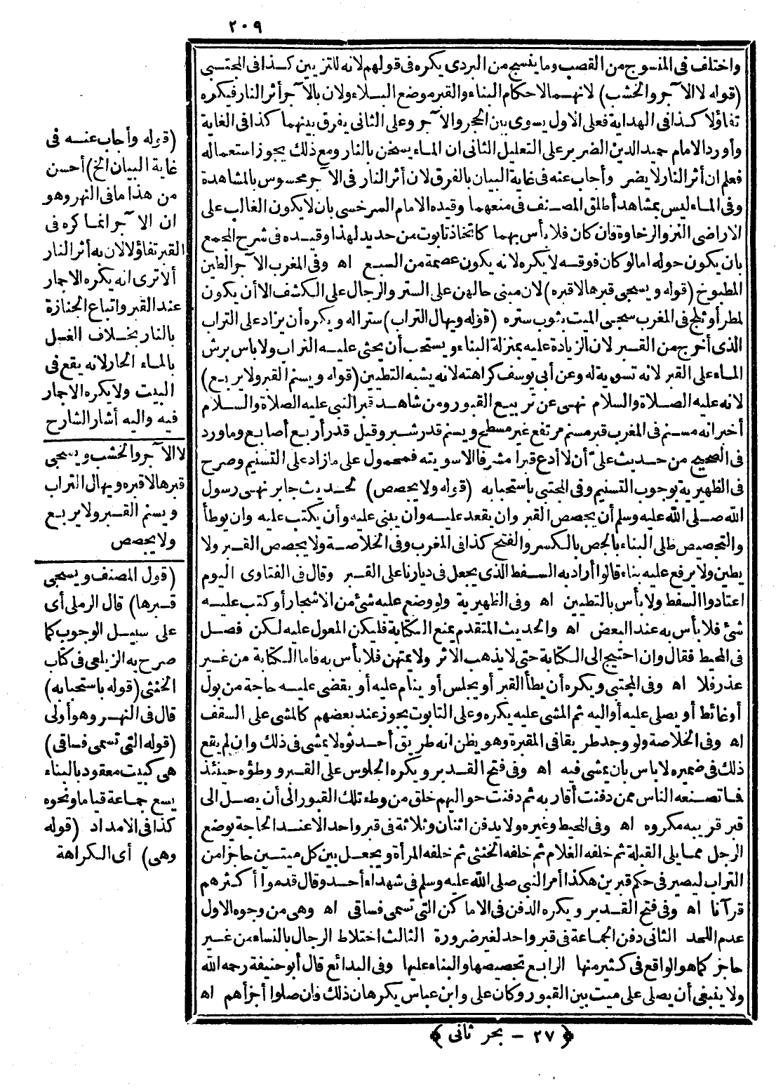 وَهِيَ مِنْ وُجُوهٍ: الْأَوَّلُ عَدَمُ اللَّحْدِ الثَّانِي دَفْنُ الْجَمَاعَةِ فِي قَبْرٍ وَاحِدٍ لِغَيْرِ ضَرُورَةٍ الثَّالِثُ اخْتِلَاطُ الرِّجَالِ بِالنِّسَاءِ مِنْ غَيْرِ حَاجِزٍ كَمَا هُوَ الْوَاقِعُ فِي كَثِيرٍ مِنْهَا الرَّابِعُ تَجْصِيصُهَا وَالْبِنَاءُ عَلَيْهَا، وَفِي الْبَدَائِعِ قَالَ أَبُو حَنِيفَةَ - رَحِمَهُ اللَّهُ -، وَلَا يَنْبَغِي أَنْ يُصَلَّى عَلَى مَيِّتٍ بَيْنَ الْقُبُورِ وَكَانَ عَلِيٌّ وَابْنُ عَبَّاسٍ يَكْرَهَانِ ذَلِكَ، فَإِنْ صَلَّوْا أَجْزَأَهُمْ اهـ. .
