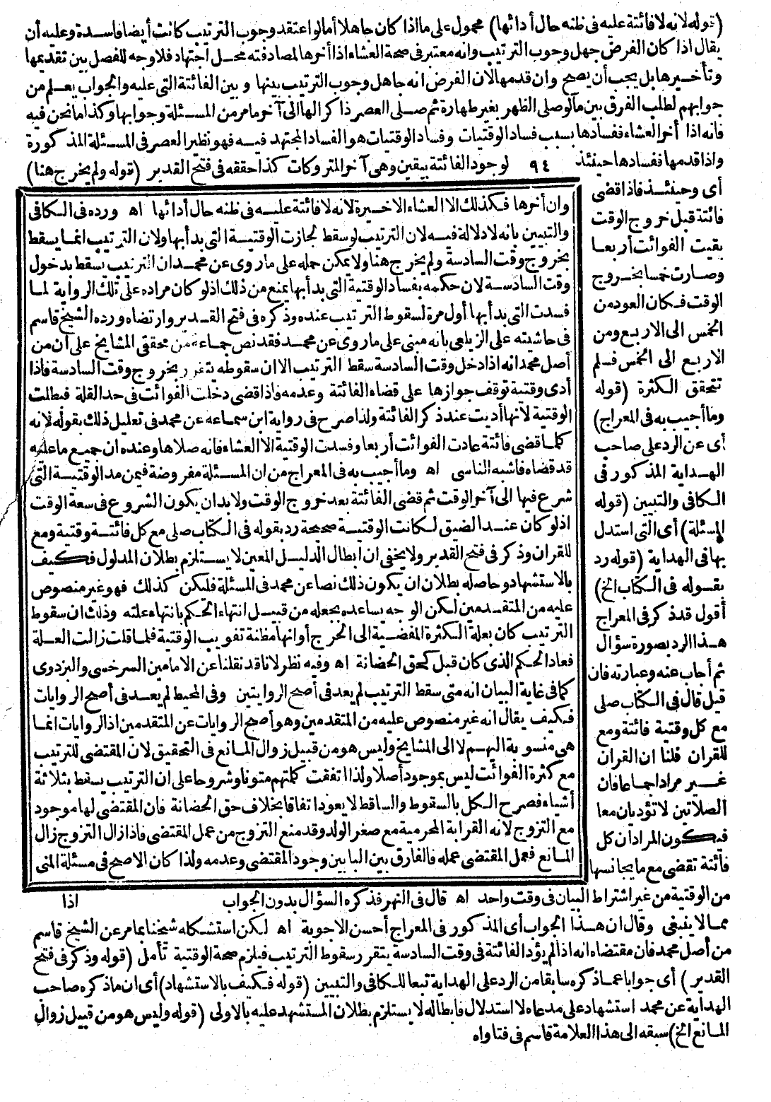 وَمَا أُجِيبَ بِهِ فِي الْمِعْرَاجِ مِنْ أَنَّ الْمَسْأَلَةَ مَفْرُوضَةٌ فِيمَنْ مَدَّ الْوَقْتِيَّةَ الَّتِي شَرَعَ فِيهَا إلَى آخِرِ الْوَقْتِ ثُمَّ قَضَى الْفَائِتَةَ بَعْدَ خُرُوجِ الْوَقْتِ وَلَا بُدَّ أَنْ يَكُونَ الشُّرُوعُ فِي سَعَةِ الْوَقْتِ إذْ لَوْ كَانَ عِنْدَ الضِّيقِ لَكَانَتْ الْوَقْتِيَّةُ صَحِيحَةً رُدَّ بِقَوْلِهِ فِي الْكِتَابِ صَلَّى مَعَ كُلِّ فَائِتَةٍ وَقْتِيَّةٌ وَمَعَ لِلْقِرَانِ وَذَكَرَ فِي فَتْحِ الْقَدِيرِ وَلَا يَخْفَى أَنَّ إبْطَالَ الدَّلِيلِ الْمُعَيَّنِ لَا يَسْتَلْزِمُ بُطْلَانَ الْمَدْلُولِ فَكَيْفَ بِالِاسْتِشْهَادِ وَحَاصِلُهُ بُطْلَانُ أَنْ يَكُونَ ذَلِكَ نَصًّا عَنْ مُحَمَّدٍ فِي الْمَسْأَلَةِ فَلْيَكُنْ كَذَلِكَ فَهُوَ غَيْرُ مَنْصُوصٍ عَلَيْهِ مِنْ الْمُتَقَدِّمِينَ لَكِنَّ الْوَجْهَ يُسَاعِدُهُ بِجَعْلِهِ مِنْ قَبِيلِ انْتِهَاءِ الْحُكْمِ بِانْتِهَاءِ عِلَّتِهِ وَذَلِكَ أَنَّ سُقُوطَ التَّرْتِيبِ كَانَ بِعِلَّةِ الْكَثْرَةِ الْمُفْضِيَةِ إلَى الْحَرَجِ أَوْ أَنَّهَا مَظِنَّةُ تَفْوِيتِ الْوَقْتِيَّةِ فَمَا قُلْت زَالَتْ الْعِلَّةُ فَعَادَ الْحُكْمُ الَّذِي كَانَ قَبْلُ كَحَقِّ الْحَضَانَةِ اهـ.