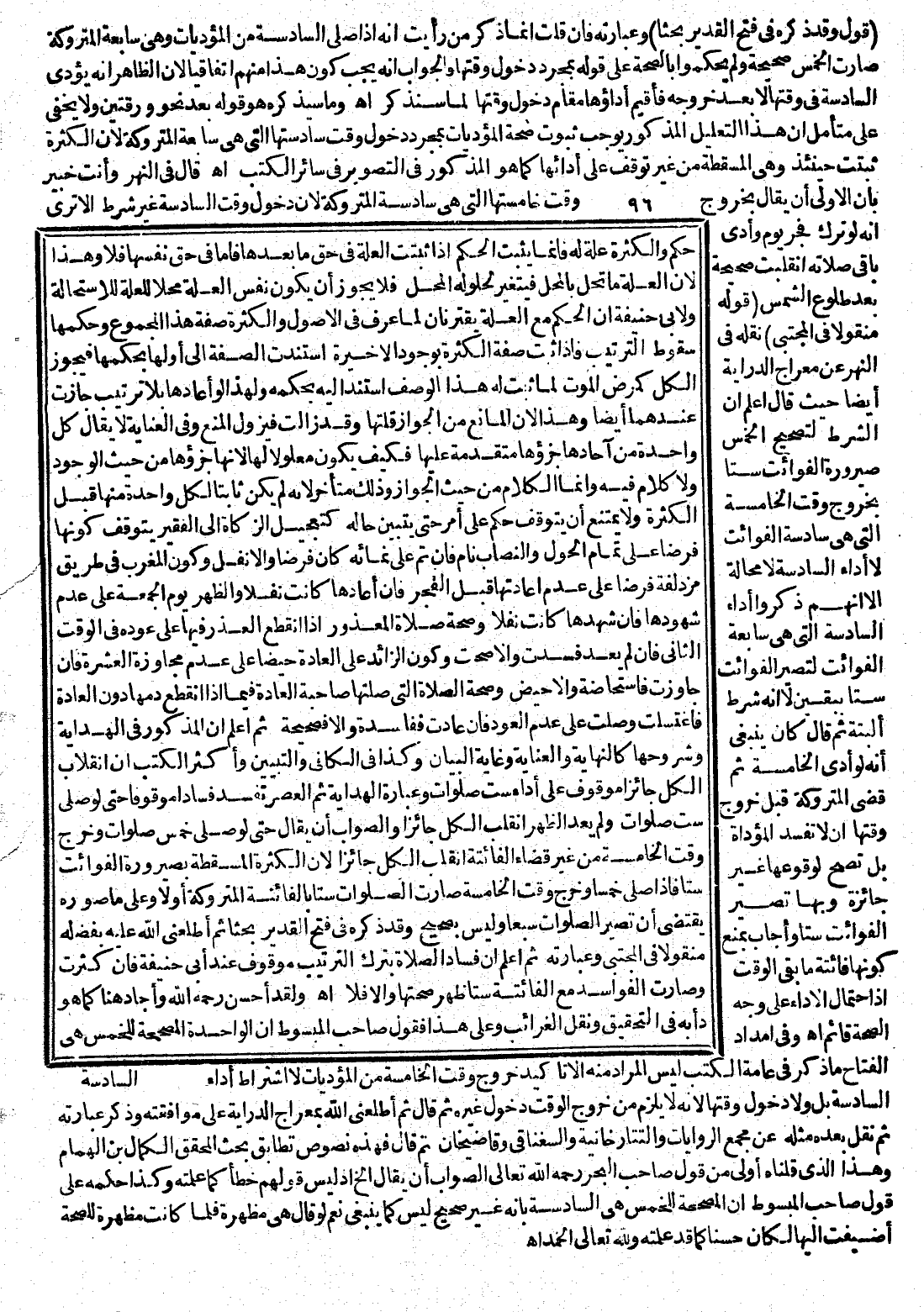 وَفِي إمْدَادِ الْفَتَّاحِ مَا ذُكِرَ فِي عَامَّةِ الْكُتُبِ لَيْسَ الْمُرَادُ مِنْهُ إلَّا تَأْكِيدَ خُرُوجِ وَقْتِ الْخَامِسَةِ مِنْ الْمُؤَدِّيَاتِ لَا اشْتِرَاطُ أَدَاءِ السَّادِسَةِ بَلْ وَلَا دُخُولَ وَقْتِهَا لِأَنَّهُ لَا يَلْزَمُ مِنْ خُرُوجِ الْوَقْتِ دُخُولُ غَيْرِهِ ثُمَّ قَالَ ثُمَّ أَطْلَعَنِي اللَّهُ بِمِعْرَاجِ الدِّرَايَةِ عَلَى مُوَافَقَتِهِ وَذَكَرَ عِبَارَتَهُ ثُمَّ نَقَلَ بَعْدَهُ مِثْلَهُ عَنْ مَجْمَعِ الرِّوَايَاتِ والتتارخانية وَالسِّغْنَاقِيِّ وَقَاضِي خَانْ ثُمَّ قَالَ فَهَذِهِ نُصُوصٌ تُطَابِقُ بَحْثَ الْمُحَقِّقِ الْكَمَالِ بْنِ الْهُمَامِ وَهَذَا الَّذِي قُلْنَاهُ أَوْلَى مِنْ قَوْلِ صَاحِبِ الْبَحْرِ - رَحِمَهُ اللَّهُ تَعَالَى - الصَّوَابُ أَنْ يُقَالَ إلَخْ إذْ لَيْسَ قَوْلُهُمْ خَطَأً كَمَا عَلِمْته وَكَذَا حُكْمُهُ عَلَى قَوْلِ صَاحِبِ الْمَبْسُوطِ أَنَّ الْمُصَحِّحَةَ لِلْخَمْسِ هِيَ السَّادِسَةُ بِأَنَّهُ غَيْرُ صَحِيحٍ لَيْسَ كَمَا يَنْبَغِي نَعَمْ لَوْ قَالَ هِيَ مُظْهِرَةٌ فَلَمَّا كَانَتْ مُظْهِرَةً لِلصِّحَّةِ أُضِيفَتْ إلَيْهَا لَكَانَ حَسَنًا كَمَا قَدْ عَلِمْته وَلِلَّهِ تَعَالَى الْحَمْدُ اهـ.