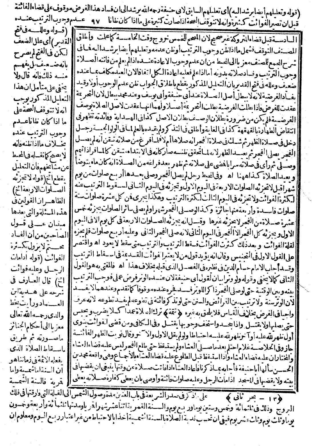 فَالْمُفْتَى بِهِ هُوَ الْقَوْلُ الثَّانِي كَمَا لَا يَخْفَى وَقَوْلُهُ وَلَوْ وِتْرًا بَيَانٌ لِقَوْلِ أَبِي حَنِيفَةَ لِأَنَّ عِنْدَهُ الْوِتْرَ فَرْضٌ عَمَلِيٌّ فَوَجَبَ التَّرْتِيبُ بَيْنَهُ وَبَيْنَ الْوَقْتِيَّةِ حَتَّى لَوْ صَلَّى الْفَجْرَ ذَاكِرًا لِلْوِتْرِ فَسَدَ فَجْرُهُ عِنْدَهُ مَوْقُوفًا كَمَا تَقَدَّمَ وَعِنْدَهُمَا لَا يَفْسُدُ لِأَنَّ الْوِتْرَ سُنَّةٌ وَلَا تَرْتِيبَ بَيْنَ الْفَرَائِضِ وَالسُّنَنِ حَتَّى لَوْ تَذَكَّرَ فَائِتَةً فِي تَطَوُّعِهِ لَمْ يَفْسُدْ لِأَنَّهُ عُرِفَ وَاجِبًا فِي الْفَرْضِ بِخِلَافِ الْقِيَاسِ فَلَا يَلْحَقُ بِهِ غَيْرُهُ يُضْرَبُ وَيُحْبَسُ حَتَّى يُصَلِّيَهَا وَلَا يُقْتَلُ وَإِذَا جَحَدَ وَاسْتَخَفَّ وُجُوبَهَا يُقْتَلُ وَفِي الْكَافِي وَمَنْ قَضَى الْفَوَائِتَ يَنْوِي أَوَّلَ ظُهْرٍ لِلَّهِ عَلَيْهِ أَوْ آخِرَ ظُهْرٍ لِلَّهِ عَلَيْهِ احْتِيَاطًا وَلَوْ لَمْ يَقُلْ الْأَوَّلُ وَالْآخِرُ وَقَالَ نَوَيْت الظُّهْرَ الْفَائِتَةَ جَازَ فِي الْخُلَاصَةِ غُلَامٌ احْتَلَمَ بَعْدَمَا صَلَّى الْعِشَاءَ وَلَمْ يَسْتَيْقِظْ حَتَّى طَلَعَ الْفَجْرُ لَيْسَ عَلَيْهِ قَضَاءُ الْعِشَاءِ وَالْمُخْتَارُ أَنَّ عَلَيْهِ قَضَاءَ الْعِشَاءِ وَإِذَا اسْتَيْقَظَ قَبْلَ الطُّلُوعِ عَلَيْهِ قَضَاءُ الْعِشَاءِ بِالْإِجْمَاعِ وَهِيَ وَاقِعَةُ مُحَمَّدِ بْنِ الْحَسَنِ سَأَلْتهَا أَبَا حَنِيفَةَ فَأَجَابَهُ بِمَا ذَكَرْنَا فَأَعَادَ الْعِشَاءَ إذَا فَاتَتْ صَلَاةٌ عَنْ وَقْتِهَا يَنْبَغِي أَنْ يَقْضِيَهَا فِي بَيْتِهِ وَلَا يَقْضِيَهَا فِي الْمَسْجِدِ إذَا مَاتَ الرَّجُلُ وَعَلَيْهِ صَلَوَاتٌ فَائِتَةٌ وَأَوْصَى بِأَنْ يُعْطَى كَفَّارَةُ صَلَاتِهِ يُعْطَى