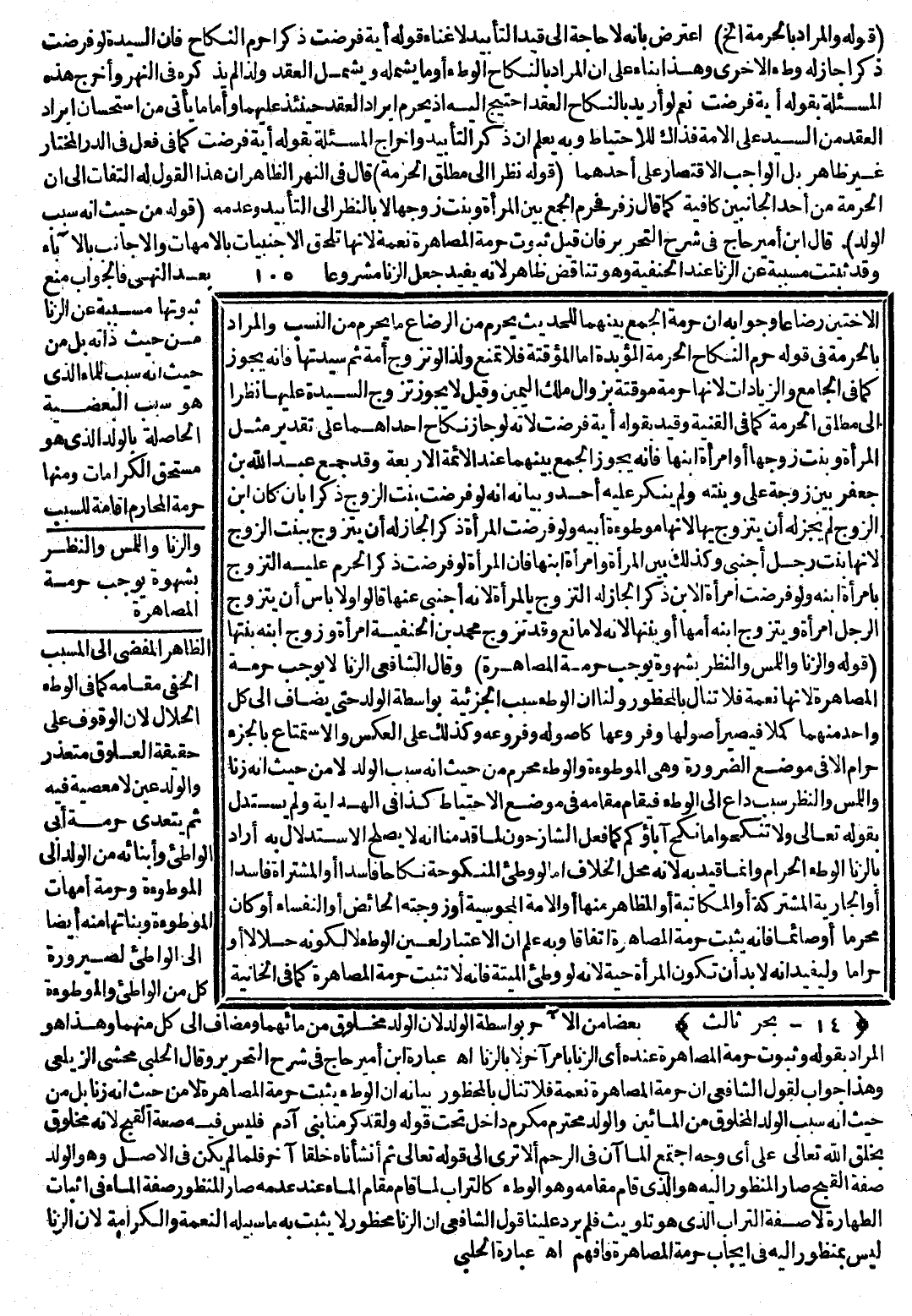 عِبَارَةُ ابْنِ أَمِيرِ حَاجٍّ فِي شَرْحِ التَّحْرِيرِ وَقَالَ الْحَلَبِيُّ مُحَشِّي الزَّيْلَعِيِّ، وَهَذَا جَوَابٌ لِقَوْلِ الشَّافِعِيِّ إنَّ حُرْمَةَ الْمُصَاهَرَةِ نِعْمَةٌ فَلَا تُنَالُ بِالْمَحْظُورِ، بَيَانُهُ: أَنَّ الْوَطْءَ يُثْبِتُ حُرْمَةَ الْمُصَاهَرَةِ لَا مِنْ حَيْثُ إنَّهُ زِنًا بَلْ مِنْ حَيْثُ إنَّهُ سَبَبُ الْوَلَدِ الْمَخْلُوقِ مِنْ الْمَاءَيْنِ وَالْوَلَدُ مُحْتَرَمٌ مُكَرَّمٌ دَاخِلٌ تَحْتَ قَوْلِهِ {وَلَقَدْ كَرَّمْنَا بَنِي آدَمَ} [الإسراء: 70] فَلَيْسَ فِيهِ صِفَةُ الْقُبْحِ؛ لِأَنَّهُ مَخْلُوقٌ بِخَلْقِ اللَّهِ تَعَالَى عَلَى أَيِّ وَجْهٍ اجْتَمَعَ الْمَاءَانِ فِي الرَّحِمِ، أَلَا تَرَى إلَى قَوْله تَعَالَى {ثُمَّ أَنْشَأْنَاهُ خَلْقًا آخَرَ} [المؤمنون: 14] فَلَمَّا لَمْ يَكُنْ فِي الْأَصْلِ وَهُوَ الْوَلَدُ صِفَةَ الْقُبْحِ صَارَ الْمَنْظُورُ إلَيْهِ هُوَ الَّذِي قَامَ مَقَامَهُ وَهُوَ الْوَطْءُ كَالتُّرَابِ لَمَّا قَامَ مَقَامَ الْمَاءِ عِنْدَ عَدَمِهِ صَارَ الْمَنْظُورُ صِفَةَ الْمَاءِ فِي إثْبَاتِ الطَّهَارَةِ لَا صِفَةَ التُّرَابِ الَّذِي هُوَ تَلْوِيثٌ فَلَمْ يَرِدْ عَلَيْنَا قَوْلُ الشَّافِعِيِّ إنَّ الزِّنَا مَحْظُورٌ لَا يَثْبُتُ بِهِ مَا سَبِيلُهُ النِّعْمَةُ وَالْكَرَامَةُ؛ لِأَنَّ الزِّنَا لَيْسَ بِمَنْظُورٍ إلَيْهِ فِي إيجَابِ حُرْمَةِ الْمُصَاهَرَةِ فَافْهَمْ اهـ. عِبَارَةُ الْحَلَبِيِّ.