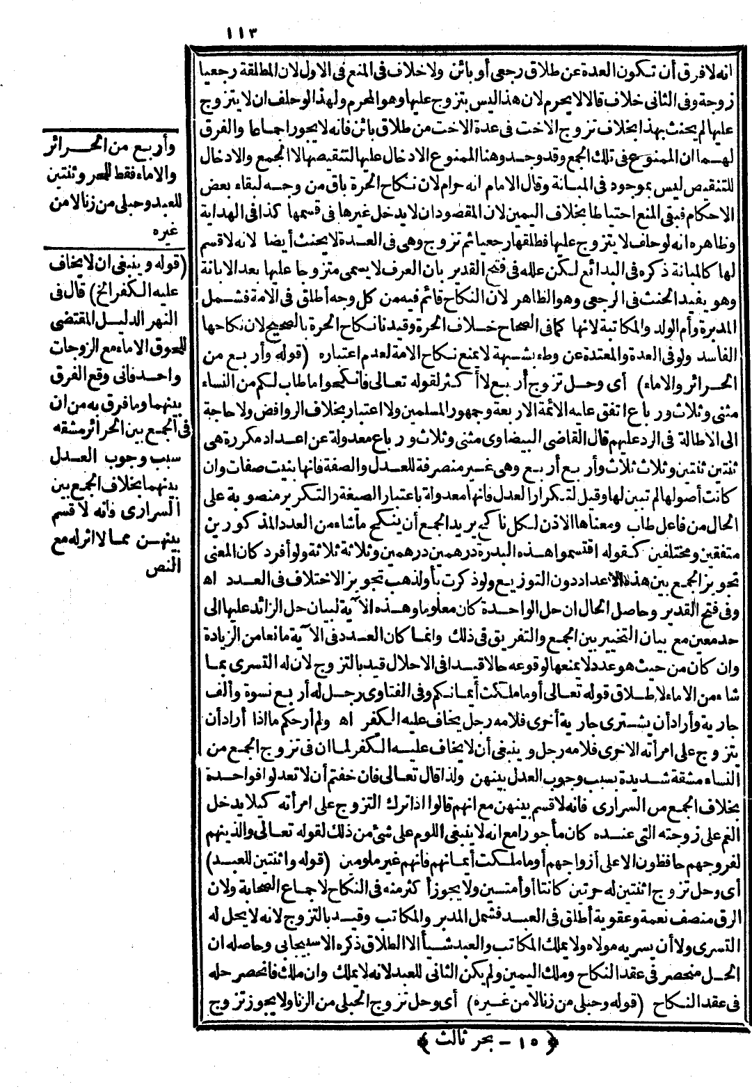 وَفِي فَتْحِ الْقَدِيرِ: وَحَاصِلُ الْحَالِ أَنَّ حِلَّ الْوَاحِدَةِ كَانَ مَعْلُومًا، وَهَذِهِ الْآيَةُ لِبَيَانِ حِلِّ الزَّائِدِ عَلَيْهَا إلَى حَدٍّ مُعَيَّنٍ مَعَ بَيَانِ التَّنْجِيزِ بَيْنَ الْجَمْعِ وَالتَّفْرِيقِ فِي ذَلِكَ، وَإِنَّمَا كَانَ الْعَدَدُ فِي الْآيَةِ مَانِعًا مِنْ الزِّيَادَةِ وَإِنْ كَانَ مِنْ حَيْثُ هُوَ عَدَدٌ لَا يَمْنَعُهَا لِوُقُوعِهِ حَالًا قَيْدًا فِي الْإِحْلَالِ، قَيَّدَ بِالتَّزَوُّجِ؛ لِأَنَّ لَهُ التَّسَرِّي بِمَا شَاءَ مِنْ الْإِمَاءِ لِإِطْلَاقِ قَوْله تَعَالَى {أَوْ مَا مَلَكَتْ أَيْمَانُكُمْ} [النساء: 3] وَفِي الْفَتَاوَى رَجُلٌ لَهُ أَرْبَعُ نِسْوَةٍ وَأَلْفُ جَارِيَةٍ وَأَرَادَ أَنْ يَشْتَرِيَ جَارِيَةً أُخْرَى فَلَامَهُ رَجُلٌ يُخَافُ عَلَيْهِ الْكُفْرُ اهـ.