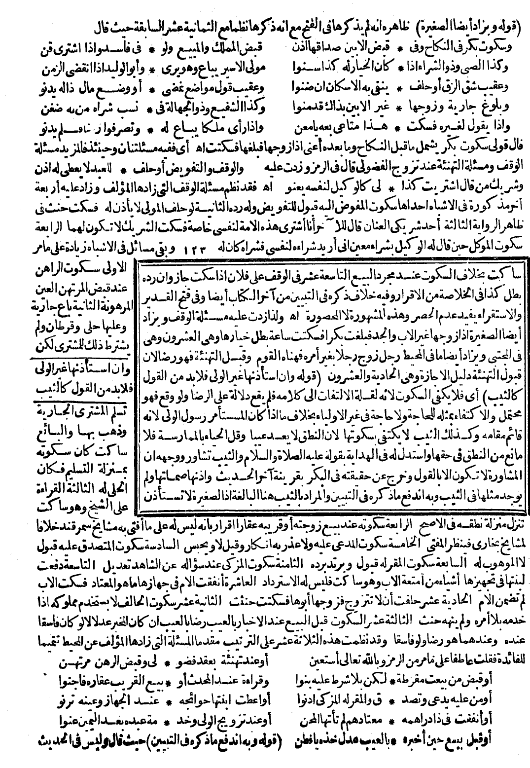 فَقَدْ نَظَمَ مَسْأَلَةَ الْوَقْفِ الَّتِي زَادَهَا الْمُؤَلِّفُ وَزَادَ عَلَيْهِ أَرْبَعَةً أُخَرَ مَذْكُورَةً فِي الْأَشْبَاهِ: إحْدَاهَا سُكُوتُ الْمُفَوَّضِ إلَيْهِ قَبُولٌ لِلتَّفْوِيضِ وَلَهُ رَدُّهُ. الثَّانِيَةُ لَوْ حَلَفَ الْمَوْلَى لَا يَأْذَنُ لَهُ فَسَكَتَ حَنِثَ فِي ظَاهِرِ الرِّوَايَةِ.