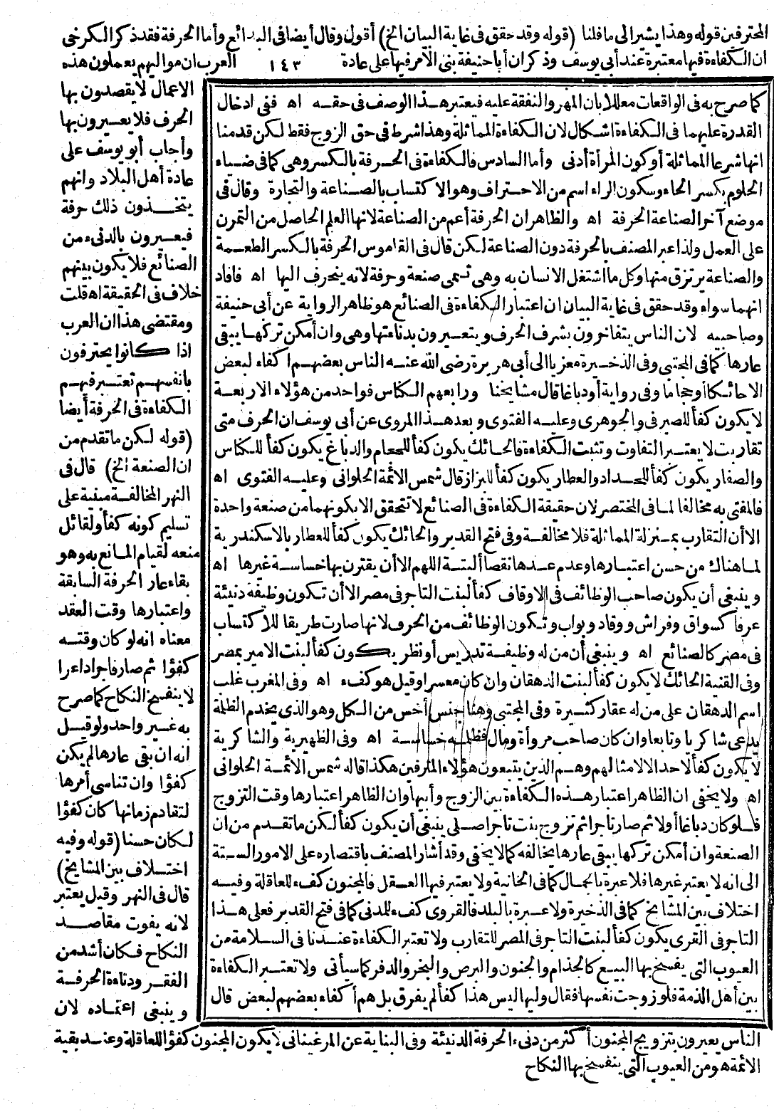 فَأَفَادَ أَنَّهُمَا سَوَاءٌ، وَقَدْ حَقَّقَ فِي غَايَةِ الْبَيَانِ أَنَّ اعْتِبَارَ الْكَفَاءَةِ فِي الصَّنَائِعِ هُوَ ظَاهِرُ الرِّوَايَةِ عَنْ أَبِي حَنِيفَةَ وَصَاحِبَيْهِ؛ لِأَنَّ النَّاسَ يَتَفَاخَرُونَ بِشَرَفِ الْحِرَفِ وَيَتَعَيَّرُونَ بِدَنَاءَتِهَا وَهِيَ وَإِنْ أَمْكَنَ تَرْكُهَا يَبْقَى عَارُهَا كَمَا فِي الْمُجْتَبَى وَفِي الذَّخِيرَةِ مَعْزِيًّا إلَى أَبِي هُرَيْرَةَ - رَضِيَ اللَّهُ عَنْهُ - النَّاسُ بَعْضُهُمْ أَكْفَاءٌ لِبَعْضٍ إلَّا حَائِكًا أَوْ حَجَّامًا وَفِي رِوَايَةٍ، أَوْ دَبَّاغًا: قَالَ مَشَايِخُنَا وَرَابِعُهُمْ الْكَنَّاسُ فَوَاحِدٌ مِنْ هَؤُلَاءِ الْأَرْبَعَةِ لَا يَكُونُ كُفُؤًا لِلصَّيْرَفِيِّ وَالْجَوْهَرِيِّ وَعَلَيْهِ الْفَتْوَى وَبَعْدَ هَذَا الْمَرْوِيُّ عَنْ أَبِي يُوسُفَ إنَّ الْحِرَفَ مَتَى تَقَارَبَتْ لَا يُعْتَبَرُ التَّفَاوُتُ وَتَثْبُتُ الْكَفَاءَةُ فَالْحَائِكُ يَكُونُ كُفُؤًا لِلْحَجَّامِ، وَالدَّبَّاغُ يَكُونُ كُفُؤًا لِلْكَنَّاسِ وَالصَّفَّارُ يَكُونُ كُفُؤًا لِلْحَدَّادِ وَالْعَطَّارُ يَكُونُ كُفُؤًا لِلْبَزَّازِ قَالَ شَمْسُ الْأَئِمَّةِ الْحَلْوَانِيُّ وَعَلَيْهِ الْفَتْوَى. اهـ.