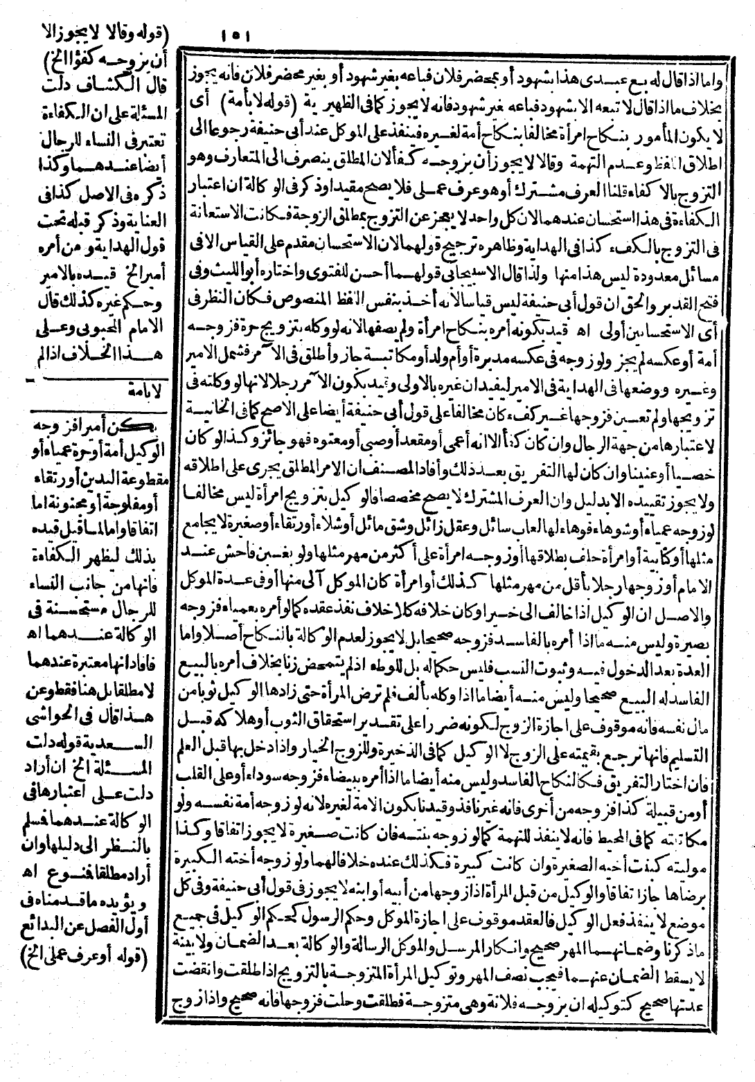 وَأَمَّا إذَا قَالَ لَهُ بِعْ عَبْدِي هَذَا بِشُهُودٍ أَوْ بِمَحْضَرِ فُلَانٍ فَبَاعَهُ بِغَيْرِ شُهُودٍ أَوْ بِغَيْرِ مَحْضَرِ فُلَانٍ فَإِنَّهُ يَجُوزُ بِخِلَافِ مَا إذَا قَالَ لَا تَبِعْهُ إلَّا بِشُهُودٍ فَبَاعَهُ بِغَيْرِ شُهُودٍ فَإِنَّهُ لَا يَجُوزُ كَمَا فِي الظَّهِيرِيَّةِ (قَوْلُهُ لَا بِأَمَةٍ) أَيْ لَا يَكُونُ الْمَأْمُورُ بِنِكَاحِ امْرَأَةٍ مُخَالِفًا بِنِكَاحِ أَمَةٍ لِغَيْرِهِ فَيَنْفُذُ عَلَى الْمُوَكِّلِ عِنْدَ أَبِي حَنِيفَةَ رُجُوعًا إلَى إطْلَاقِ اللَّفْظِ وَعَدَمِ التُّهْمَةِ وَقَالَا لَا يَجُوزُ أَنْ يُزَوِّجَهُ كُفُؤًا؛ لِأَنَّ الْمُطْلَقَ يَنْصَرِفُ إلَى الْمُتَعَارَفِ وَهُوَ التَّزَوُّجُ بِالْأَكْفَاءِ قُلْنَا الْعُرْفُ مُشْتَرَكٌ أَوْ هُوَ عُرْفٌ عَمَلِيٌّ فَلَا يَصِحُّ مُقَيَّدًا وَذُكِرَ فِي الْوَكَالَةِ أَنَّ اعْتِبَارَ الْكَفَاءَةِ فِي هَذَا اسْتِحْسَانٌ عِنْدَهُمَا؛ لِأَنَّ كُلَّ وَاحِدٍ لَا يَعْجِزُ عَنْ التَّزَوُّجِ بِمُطْلَقِ الزَّوْجَةِ فَكَانَتْ الِاسْتِعَانَةُ فِي التَّزَوُّجِ بِالْكُفْءِ كَذَا فِي الْهِدَايَةِ وَظَاهِرُهُ تَرْجِيحُ قَوْلِهِمَا؛ لِأَنَّ الِاسْتِحْسَانَ مُقَدَّمٌ عَلَى الْقِيَاسِ إلَّا فِي مَسَائِلَ مَعْدُودَةٍ لَيْسَ هَذَا مِنْهَا، وَلِذَا قَالَ الْإِسْبِيجَابِيُّ قَوْلُهُمَا أَحْسَنُ لِلْفَتْوَى وَاخْتَارَهُ أَبُو اللَّيْثِ