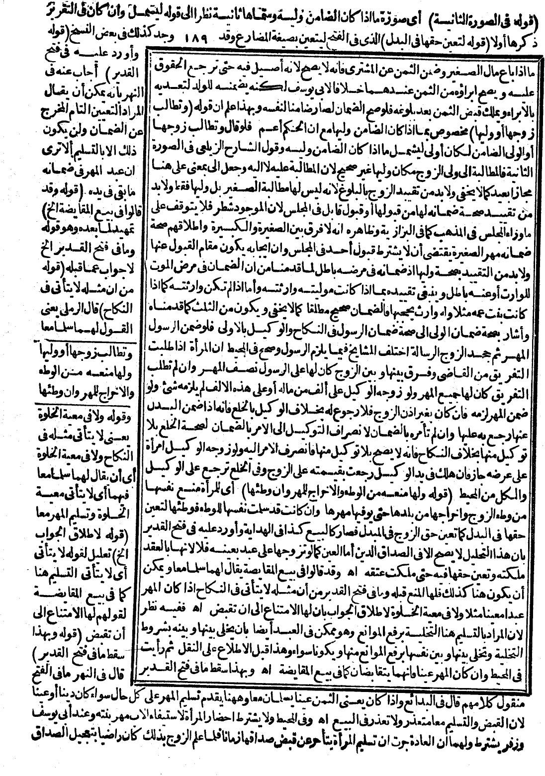 مَا إذَا بَاعَ مَالَ الصَّغِيرِ وَضَمِنَ الثَّمَنَ عَنْ الْمُشْتَرِي فَإِنَّهُ لَا يَصِحُّ؛ لِأَنَّهُ أَصِيلٌ فِيهِ حَتَّى تَرْجِعَ الْحُقُوقُ عَلَيْهِ وَيَصِحَّ إبْرَاؤُهُ مِنْ الثَّمَنِ عِنْدَهُمَا خِلَافًا لِأَبِي يُوسُفَ لَكِنَّهُ يَضْمَنُهُ لِلْوَلَدِ لِتَعَدِّيهِ بِالْإِبْرَاءِ وَيَمْلِكُ قَبْضَ الثَّمَنِ بَعْدَ بُلُوغِهِ فَلَوْ صَحَّ الضَّمَانُ لَصَارَ ضَامِنًا لِنَفْسِهِ وَبِهَذَا عُلِمَ أَنَّ قَوْلَهُ (وَتُطَالِبُ زَوْجَهَا أَوْ وَلِيَّهَا) مَخْصُوصٌ بِمَا إذَا كَانَ الضَّامِنُ وَلِيَّهَا مَعَ أَنَّ الْحُكْمَ أَعَمُّ فَلَوْ قَالَ وَتُطَالِبُ زَوْجَهَا أَوْ الْوَلِيَّ الضَّامِنَ لَكَانَ أَوْلَى لِيَشْمَلَ مَا إذَا كَانَ الضَّامِنُ وَلِيَّهُ وَقَوْلُ الشَّارِحِ الزَّيْلَعِيِّ فِي الصُّورَةِ الثَّانِيَةِ فَالْمُطَالَبَةُ إلَى وَلِيِّ الزَّوْجِ مَكَانَ وَلِيِّهَا غَيْرُ صَحِيحٍ؛ لِأَنَّ الْمُطَالَبَةَ عَلَيْهِ لَا إلَيْهِ وَجَعْلُ إلَيَّ بِمَعْنَى عَلَيَّ هُنَا مَجَازًا بَعِيدٌ كَمَا لَا يَخْفَى وَلَا بُدَّ مِنْ تَقْيِيدِ الزَّوْجِ بِالْبُلُوغِ؛ لِأَنَّهُ لَيْسَ لَهَا مُطَالَبَةُ الصَّغِيرِ بَلْ وَلِيِّهَا فَقَطْ وَلَا بُدَّ مِنْ تَقْيِيدِ صِحَّةِ ضَمَانِهِ لَهَا مِنْ قَبُولِهَا أَوْ قَبُولِ قَابِلٍ فِي الْمَجْلِسِ؛ لِأَنَّ الْمَوْجُودَ شَطْرٌ فَلَا يَتَوَقَّفُ عَلَى مَا وَرَاءِ الْمَجْلِسِ فِي الْمَذْهَبِ كَمَا فِي الْبَزَّازِيَّةِ وَظَاهِرُهُ أَنَّهُ لَا فَرْقَ بَيْنَ الصَّغِيرَةِ وَالْكَبِيرَةِ وَإِطْلَاقُهُمْ صِحَّةَ ضَمَانِهِ مَهْرَ الصَّغِيرَةِ يَقْتَضِي أَنْ لَا يُشْتَرَطَ قَبُولُ أَحَدٍ فِي الْمَجْلِسِ وَأَنَّ إيجَابَهُ يَكُونُ مَقَامَ الْقَبُولِ عَنْهَا وَلَا بُدَّ مِنْ التَّقْيِيدِ بِصِحَّةِ وَلِيِّهَا إذْ ضَمَانُهُ فِي مَرَضِهِ بَاطِلٌ لِمَا قَدَّمْنَا مِنْ أَنَّ الضَّمَانَ فِي مَرَضِ الْمَوْتِ لِلْوَارِثِ أَوْ عَنْهُ بَاطِلٌ وَيَنْبَغِي تَقْيِيدُهُ بِمَا إذَا كَانَتْ مُولِيَتُهُ وَارِثَتَهُ