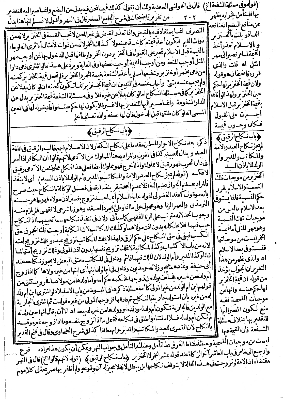 ذَكَرَهُ بَعْدَ نِكَاحِ الْأَحْرَارِ الْمُسْلِمِينَ مُقَدَّمًا عَلَى نِكَاحِ الْكُفَّارِ لِأَنَّ الْإِسْلَامَ فِيهِمْ غَالِبٌ، وَالرَّقِيقُ فِي اللُّغَةِ: الْعَبْدُ، وَيُقَالُ لِلْعَبِيدِ كَذَا فِي الْمُغْرِبِ، وَالْمُرَادُ بِهِ هُنَا: الْمَمْلُوكُ مِنْ الْآدَمِيِّ لِأَنَّهُمْ قَالُوا: إنَّ الْكَافِرَ إذَا أُسِرَ فِي دَارِ الْحَرْبِ فَهُوَ رَقِيقٌ لَا مَمْلُوكٌ وَإِذَا أُخْرِجَ فَهُوَ مَمْلُوكٌ أَيْضًا فَعَلَى هَذَا فَكُلُّ مَمْلُوكٍ مِنْ الْآدَمِيِّ رَقِيقٌ لَا عَكْسُهُ (قَوْلُهُ: لَمْ يَجُزْ نِكَاحُ الْعَبْدِ، وَالْأَمَةِ وَالْمُكَاتَبِ، وَالْمُدَبَّرِ وَأُمِّ الْوَلَدِ إلَّا بِإِذْنِ السَّيِّدِ) أَيْ لَا يَنْفُذُ فَالْمُرَادُ بِعَدَمِ الْجَوَازِ عَدَمُ النَّفَاذِ لَا عَدَمُ الصِّحَّةِ بِقَرِينَةِ سَابِقِهِ فِي فَصْلِ الْوَكَالَةِ بِالنِّكَاحِ حَيْثُ صَرَّحَ بِأَنَّهُ مَوْقُوفٌ كَعَقْدِ الْفُضُولِيِّ لِقَوْلِهِ - عَلَيْهِ السَّلَامُ - «أَيُّمَا عَبْدٍ تَزَوَّجَ بِغَيْرِ إذْنِ مَوْلَاهُ فَهُوَ عَاهِرٌ» حَسَّنَهُ التِّرْمِذِيُّ، وَالْعَهْرُ الزِّنَا وَهُوَ مَحْمُولٌ عَلَى مَا إذَا وَطِئَ بِمُجَرَّدِ الْعَقْدِ وَهُوَ زِنًا شَرْعِيٌّ لَا فِقْهِيٌّ فَلَمْ يَلْزَمْ مِنْهُ وُجُوبُ الْحَدِّ لِأَنَّهُ مُتَرَتِّبٌ عَلَى الزِّنَا الْفِقْهِيِّ كَمَا سَيَأْتِي وَلِأَنَّ فِي تَنْفِيذِ نِكَاحِهِمَا تَعْيِيبُهُمَا إذْ النِّكَاحُ عَيْبٌ فِيهِمَا فَلَا يَمْلِكَانِهِ بِدُونِ إذْنِ مَوْلَاهُمَا وَكَذَلِكَ الْمُكَاتَبُ لِأَنَّ الْكِتَابَةَ أَوْجَبَتْ فَكَّ الْحَجْرِ فِي حَقِّ الْكَسْبِ فَبَقِيَ فِي حَقِّ النِّكَاحِ عَلَى حُكْمِ الرِّقِّ وَلِهَذَا لَا يَمْلِكُ الْمُكَاتَبُ تَزْوِيجَ عَبْدِهِ وَيَمْلِكُ تَزْوِيجَ أَمَتِهِ لِأَنَّهُ مِنْ بَابِ الِاكْتِسَابِ وَكَذَا الْمُكَاتَبَةُ لَا تَمْلِكُ تَزْوِيجَ نَفْسِهَا بِدُونِ إذْنِ الْمَوْلَى وَتَمْلِكُ تَزْوِيجَ أَمَتِهَا لِمَا قُلْنَا