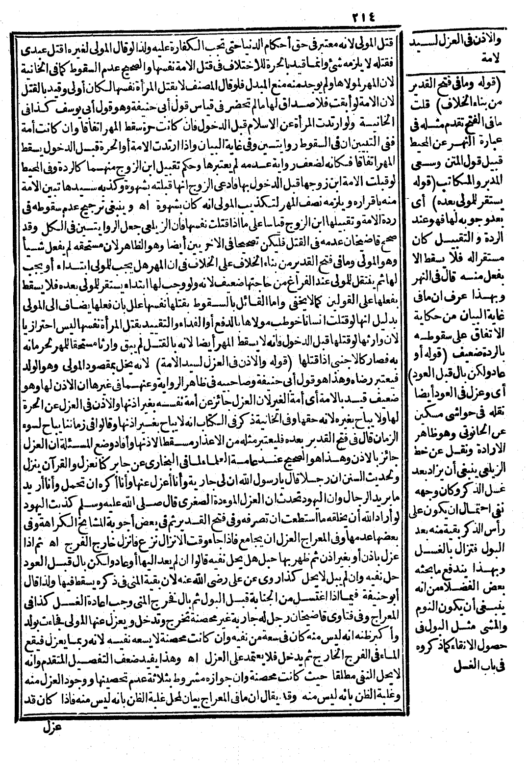 وَفِي فَتْحِ الْقَدِيرِ ثُمَّ فِي بَعْضِ أَجْوِبَةِ الْمَشَايِخِ الْكَرَاهَةُ، وَفِي بَعْضِهَا عَدَمُهَا، وَفِي الْمِعْرَاجِ الْعَزْلُ أَنْ يُجَامِعَ فَإِذَا جَاءَ وَقْتُ الْإِنْزَالِ نَزَعَ فَأَنْزَلَ خَارِجَ الْفَرْجِ اهـ.