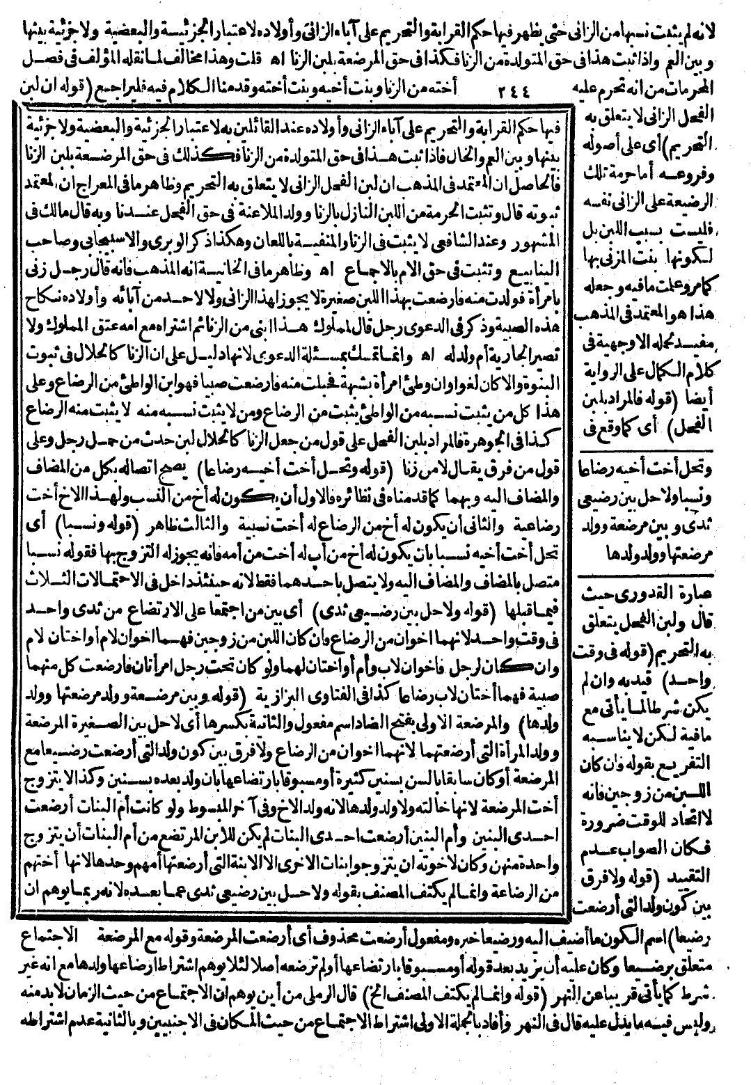 فِيهَا حُكْمُ الْقَرَابَةِ، وَالتَّحْرِيمِ عَلَى آبَاءِ الزَّانِي وَأَوْلَادِهِ عِنْدَ الْقَائِلِينَ بِهِ لِاعْتِبَارِ الْجُزْئِيَّةِ، وَالْبَعْضِيَّةِ وَلَا جُزْئِيَّةَ بَيْنَهَا وَبَيْنَ الْعَمِّ، وَالْخَالِ فَإِذَا ثَبَتَ هَذَا فِي حَقِّ الْمُتَوَلِّدَةِ مِنْ الزِّنَا فَكَذَلِكَ فِي حَقِّ الْمِرْضَعَةِ بِلَبَنِ الزِّنَا فَالْحَاصِلُ أَنَّ الْمُعْتَمَدَ فِي الْمَذْهَبِ أَنَّ لَبَنَ الْفَحْلِ الزَّانِي لَا يَتَعَلَّقُ بِهِ التَّحْرِيمُ وَظَاهِرُ مَا فِي الْمِعْرَاجِ أَنَّ الْمُعْتَمَدَ ثُبُوتُهُ قَالَ: وَتَثْبُتُ الْحُرْمَةُ مِنْ اللَّبَنِ النَّازِلِ بِالزِّنَا وَوَلَدُ الْمُلَاعَنَةِ فِي حَقِّ الْفَحْلِ عِنْدَنَا وَبِهِ قَالَ مَالِكٌ فِي الْمَشْهُورِ وَعِنْدَ الشَّافِعِيِّ: لَا يَثْبُتُ فِي الزِّنَا، وَالْمَنْفِيَّةُ بِاللِّعَانِ وَهَكَذَا ذَكَرَ الْوَبَرِيُّ والإسبيجابي وَصَاحِبُ الْيَنَابِيعِ وَتَثْبُتُ فِي حَقِّ الْأُمِّ بِالْإِجْمَاعِ اهـ.
