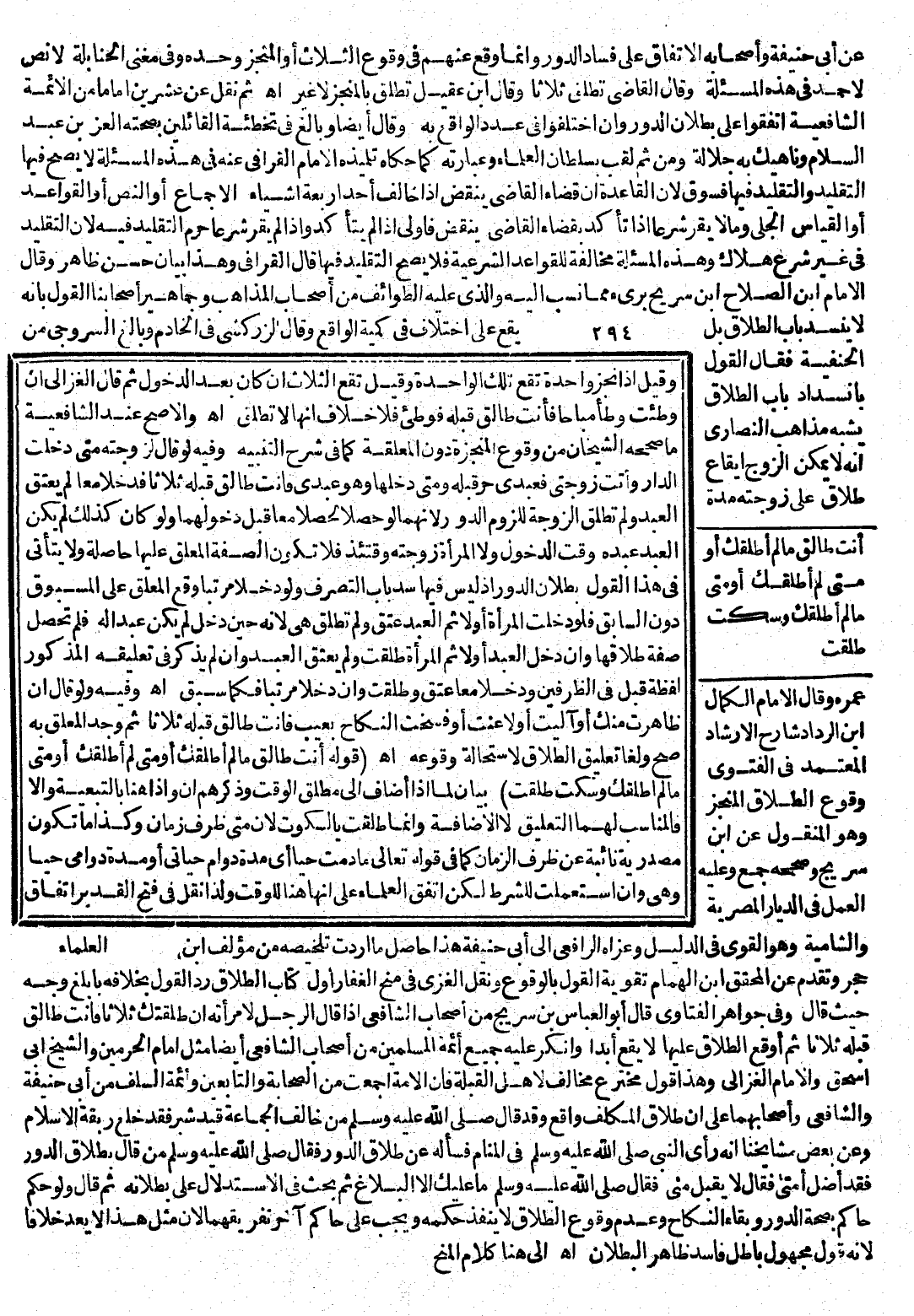 ثُمَّ نُقِلَ عَنْ عِشْرِينَ إمَامًا مِنْ الْأَئِمَّةِ الشَّافِعِيَّةِ اتَّفَقُوا عَلَى بُطْلَانِ الدَّوْرِ، وَإِنْ اخْتَلَفُوا فِي عَدَدِ الْوَاقِعِ بِهِ وَقَالَ أَيْضًا وَبَالَغَ فِي تَخْطِئَةِ الْقَائِلِينَ بِصِحَّتِهِ الْعِزُّ بْنُ عَبْدِ السَّلَامِ وَنَاهِيك بِهِ جَلَالَةً وَمِنْ ثَمَّ لُقِّبَ بِسُلْطَانِ الْعُلَمَاءِ، وَعِبَارَتُهُ كَمَا حَكَاهُ تِلْمِيذُهُ الْإِمَامُ الْقَرَافِيُّ عَنْهُ فِي هَذِهِ الْمَسْأَلَةِ: لَا يَصِحُّ فِيهَا التَّقْلِيدُ، وَالتَّقْلِيدُ فِيهَا فُسُوقٌ؛ لِأَنَّ الْقَاعِدَةَ أَنَّ قَضَاءَ الْقَاضِي يُنْقَضُ إذَا خَالَفَ أَحَدَ أَرْبَعَةِ أَشْيَاءَ الْإِجْمَاعَ أَوْ النَّصَّ أَوْ الْقَوَاعِدَ أَوْ الْقِيَاسَ الْجَلِيَّ وَمَا لَا يُقَرُّ شَرْعًا إذَا تَأَكَّدَ بِقَضَاءِ الْقَاضِي يُنْقَضُ فَأَوْلَى إذَا لَمْ يَتَأَكَّدْ وَإِذَا لَمْ يُقَرَّ شَرْعًا حَرُمَ التَّقْلِيدُ فِيهِ لِأَنَّ التَّقْلِيدَ فِي غَيْرِ شَرْعٍ هَلَاكٌ وَهَذِهِ الْمَسْأَلَةُ مُخَالِفَةٌ لِلْقَوَاعِدِ الشَّرْعِيَّةِ فَلَا يَصِحُّ التَّقْلِيدُ فِيهَا قَالَ الْقَرَافِيُّ: وَهَذَا بَيَانٌ حَسَنٌ ظَاهِرٌ وَقَالَ الْإِمَامُ ابْنُ الصَّلَاحِ: ابْنُ سُرَيْجٍ بَرِيءٌ مَا نُسِبَ إلَيْهِ وَاَلَّذِي عَلَيْهِ الطَّوَائِفُ مِنْ أَصْحَابِ الْمَذَاهِبِ، وَجَمَاهِيرُ أَصْحَابِنَا الْقَوْلُ بِأَنَّهُ لَا يَنْسَدُّ بَابُ الطَّلَاقِ بَلْ يَقَعُ عَلَى اخْتِلَافٍ فِي كَمِّيَّةِ الْوَاقِعِ، وَقَالَ الزَّرْكَشِيُّ فِي الْخَادِمِ: وَبَالَغَ السُّرُوجِيُّ مِنْ الْحَنَفِيَّةِ فَقَالَ: الْقَوْلُ بِانْسِدَادِ بَابِ الطَّلَاقِ يُشْبِهُ مَذَاهِبَ النَّصَارَى أَنَّهُ لَا يُمْكِنُ لِلزَّوْجِ إيقَاعُ طَلَاقٍ عَلَى زَوْجَتِهِ مُدَّةَ عُمُرِهِ.