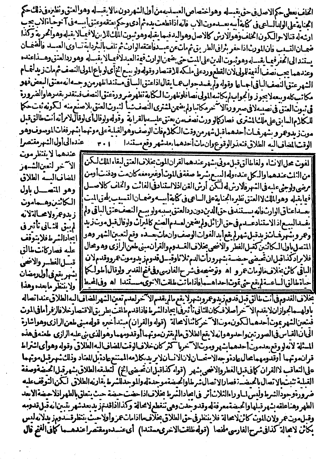 وَلَوْ بِيعَ النِّصْفُ عَتَقَ الْبَاقِي وَلَمْ يَفْسُدْ الْبَيْعُ إذْ الِاسْتِنَادُ عُدِمَ فِي حَقِّ الزَّائِلِ وَلَمْ يَضْمَنْ لِعَدَمِ الصُّنْعِ كَالْمِيرَاثِ وَلَوْ قَالَ قَبْلَ مَوْتِ زَيْدٍ وَعَمْرٍو بِشَهْرٍ فَمَاتَ زَيْدٌ قَبْلَ شَهْرٍ لَمْ يَقَعْ أَبَدًا لِفَوَاتِ الْوَصْفِ، وَإِنْ مَاتَ بَعْدَهُ وَقَعَ لِتَعْيِينِ الشَّهْرِ وَهُوَ الْمُتَّصِلُ بِأَوَّلِ الْكَائِنَيْنِ كَقَبْلَ الْفِطْرِ، وَالْأَضْحَى بِخِلَافِ الْقُدُومِ، وَالْقِرَانُ مَبْنَى طَعْنِ الرَّازِيّ وَهُوَ مُحَالٌ فَلَا يُرَادُ كَذَا قَبْلَ أَنْ تَحِيضِي حَيْضَةً بِشَهْرٍ وَرَأَتْ الدَّمَ ثَلَاثًا وَقَبْلَ قُدُومِ زَيْدٍ وَمَوْتِ عَمْرٍو وَقُدِّمَ لِأَنَّ الْبَاقِيَ كَائِنٌ بِخِلَافِ مَا لَوْ مَاتَ عَمْرٌو اهـ.