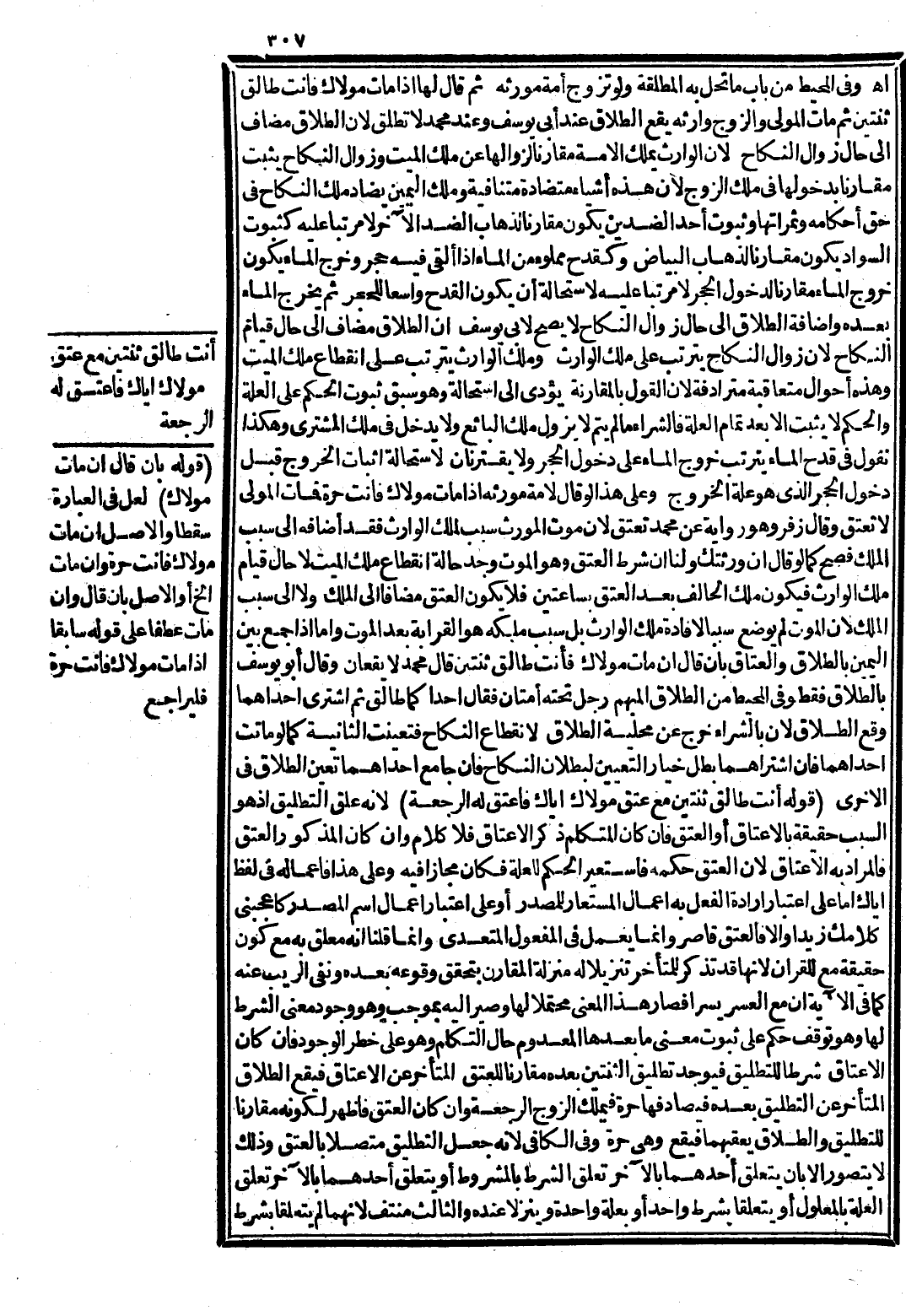 وَفِي الْمُحِيطِ مِنْ بَابِ مَا تَحِلُّ بِهِ الْمُطَلَّقَةُ وَلَوْ تَزَوَّجَ أَمَةَ مُوَرِّثِهِ ثُمَّ قَالَ لَهَا إذَا مَاتَ مَوْلَاك فَأَنْت طَالِقٌ ثِنْتَيْنِ ثُمَّ مَاتَ الْمَوْلَى، وَالزَّوْجُ وَارِثُهُ يَقَعُ الطَّلَاقُ عِنْدَ أَبِي يُوسُفَ وَعِنْدَ مُحَمَّدٍ لَا تَطْلُقُ لِأَنَّ الطَّلَاقَ مُضَافٌ إلَى حَالِ زَوَالِ النِّكَاحِ لِأَنَّ الْوَارِثَ يَمْلِكُ الْأَمَةَ مُقَارِنًا لِزَوَالِهَا عَنْ مِلْكِ الْمَيِّتِ وَزَوَالُ النِّكَاحِ يَثْبُتُ مُقَارِنًا بِدُخُولِهَا فِي مِلْكِ الزَّوْجِ لِأَنَّ هَذِهِ أَشْيَاءُ مُتَضَادَّةٌ مُتَنَافِيَةٌ وَمِلْكُ الْيَمِينِ يُضَادُّ مِلْكَ النِّكَاحِ فِي حَقِّ أَحْكَامِهِ وَثَمَرَاتُهَا وَثُبُوتُ أَحَدِ الضِّدَّيْنِ يَكُونُ مُقَارِنًا لِذَهَابِ الضِّدِّ الْآخَرِ لَا مُرَتَّبًا عَلَيْهِ كَثُبُوتِ السَّوَادِ يَكُونُ مُقَارِنًا لِذَهَابِ الْبَيَاضِ وَكَقَدَحٍ مَمْلُوءٍ مِنْ الْمَاءِ إذَا أُلْقِيَ فِيهِ حَجَرٌ وَخَرَجَ الْمَاءُ يَكُونُ خُرُوجُ الْمَاءِ مُقَارِنًا لِدُخُولِ الْحَجَرِ لَا مُرَتَّبًا عَلَيْهِ لِاسْتِحَالَةِ أَنْ يَكُونَ الْقَدَحُ وَاسِعًا لِلْحَجَرِ ثُمَّ يَخْرُجُ الْمَاءُ بَعْدَهُ وَإِضَافَةُ الطَّلَاقِ إلَى حَالِ زَوَالِ النِّكَاحِ لَا يَصِحُّ لِأَبِي يُوسُفَ أَنَّ الطَّلَاقَ مُضَافٌ إلَى حَالِ قِيَامِ النِّكَاحِ لِأَنَّ زَوَالَ النِّكَاحِ يَتَرَتَّبُ عَلَى مِلْكُ الْوَارِثِ وَمُلْكُ الْوَارِثِ يَتَرَتَّبُ عَلَى انْقِطَاعِ مِلْكِ الْمَيِّتِ وَهَذِهِ أَحْوَالٌ مُتَعَاقِبَةٌ مُتَرَادِفَةٌ لِأَنَّ الْقَوْلَ بِالْمُقَارَنَةِ يُؤَدِّي إلَى اسْتِحَالَةٍ وَهُوَ سَبْقُ ثُبُوتِ الْحُكْمِ عَلَى الْعِلَّةِ، وَالْحُكْمُ لَا يَثْبُتُ إلَّا بَعْدَ تَمَامِ الْعِلَّةِ فَالشِّرَاءُ مَا لَمْ يَتِمَّ لَا يَزُولُ مِلْكُ الْبَائِعِ وَلَا يَدْخُلُ فِي مِلْكِ الْمُشْتَرِي.