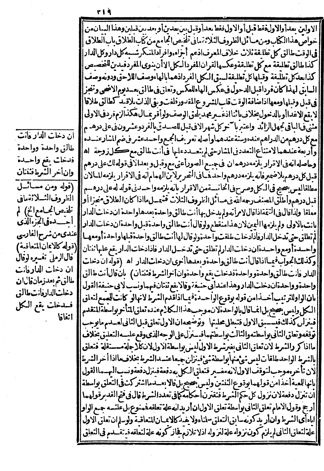الْأَوَّلَيْنِ بَعْدُ أَوْ الْأَوَّلُ فَقَطْ قَبْلُ أَوْ الْأَوَّلُ فَقَطْ بَعْدُ أَوْ قَبْلُ بَيْنَ بَعْدَيْنِ أَوْ بَعْدُ بَيْنَ قَبْلَيْنِ وَهَذَا الْبَيَانُ مِنْ خَوَاصِّ هَذَا الْكِتَابِ وَمِنْ مَسَائِلِ الظُّرُوفِ الثَّلَاثَةِ مَا فِي تَلْخِيصِ الْجَامِعِ مِنْ كِتَابِ الطَّلَاقِ بَابُ الطَّلَاقِ فِي الْوَقْتِ طَالِقٌ كُلَّ تَطْلِيقَةٍ ثَلَاثٌ خِلَافُ الْمُعَرَّفِ إذْ عَمَّ أَجْزَاءَ وَأَفْرَادَ الْمُنَكَّرِ شَبَهَ كُلِّ دَارٍ وَكُلِّ الدَّارِ كَذَا طَالِقٌ تَطْلِيقَةً مَعَ كُلِّ تَطْلِيقَةٍ وَعَكْسُهَا الْقِرَانُ الْمُفْرَدُ الْكُلُّ إلَّا أَنْ يَنْوِيَ الْمُفْرَدَ فَيُدَيَّنُ لِلتَّخْصِيصِ كَذَا بَعْدَ كُلِّ تَطْلِيقَةٍ، وَقَبْلَهَا كُلُّ تَطْلِيقَةٍ لِسَبْقِ الْكُلِّ الْفَرْدَ إذْ هُمَا بِالْهَاءِ وَصْفُ اللَّاحِقِ وَدُونَهُ وَصْفُ السَّابِقِ لِهَذَا كَانَ فَرْدًا قَبْلَ الدُّخُولِ فِي عَكْسِ الْهَاءِ لِلْعَكْسِ وَتَعَلَّقَ فِي طَالِقٍ بَعْدَ يَوْمِ الْأَضْحَى وَتَنْجُزُ فِي قَبْلُ وَقَبْلَهَا وَمَعَهَا إذْ إضَافَةُ الْوَقْتِ قَلَبَ الْمَشْرُوعَ الْمَقْدُورَ فَلَغَتْ وَبَقِيَ الذَّاتُ بِلَا قَيْدٍ كَطَالِقٍ طَلَاقًا لَا يَقَعُ إلَّا غَدًا أَوْ بِالدُّخُولِ بِخِلَافِ بَائِنًا إذْ غَيْرُ مُحَمَّدٍ يُلْحِقُ الْوَصْفَ وَلَوْ أَقَرَّ بِمَالٍ هَكَذَا لَزِمَ فَرْدٌ فِي الْأُولَى مُثَنَّى فِي الْبَاقِي لِجَهْلِ الزَّائِدِ وَاعْتُبِرَ بِآخِرِ كُلِّ شَهْرٍ إلَّا فِي قَبْلُ لِلصِّدْقِ بِالْفَرْدِ وَعِشْرُونَ فِي عَلَيَّ دِرْهَمٌ مَعَ كُلِّ دِرْهَمٍ مِنْ الدَّرَاهِمِ عِنْدَهُ وَسِتَّةٌ عِنْدَهُمَا وَأَصْلُهُ تَعْرِيفُ الْجَمْعِ وَأَحَدَ عَشَرَ فِي ضَمِّ الْمُشَارِ عِنْدَهُ وَأَرْبَعَةٌ عِنْدَهُمَا لِامْتِنَاعِ التَّعَدُّدِ فِي الْمُشَارِ حَتَّى لَمْ يَتَعَدَّدْ عَلَيْهَا فِي أَنْت طَالِقٌ مَعَ كُلِّ زَوْجَةٍ اهـ.