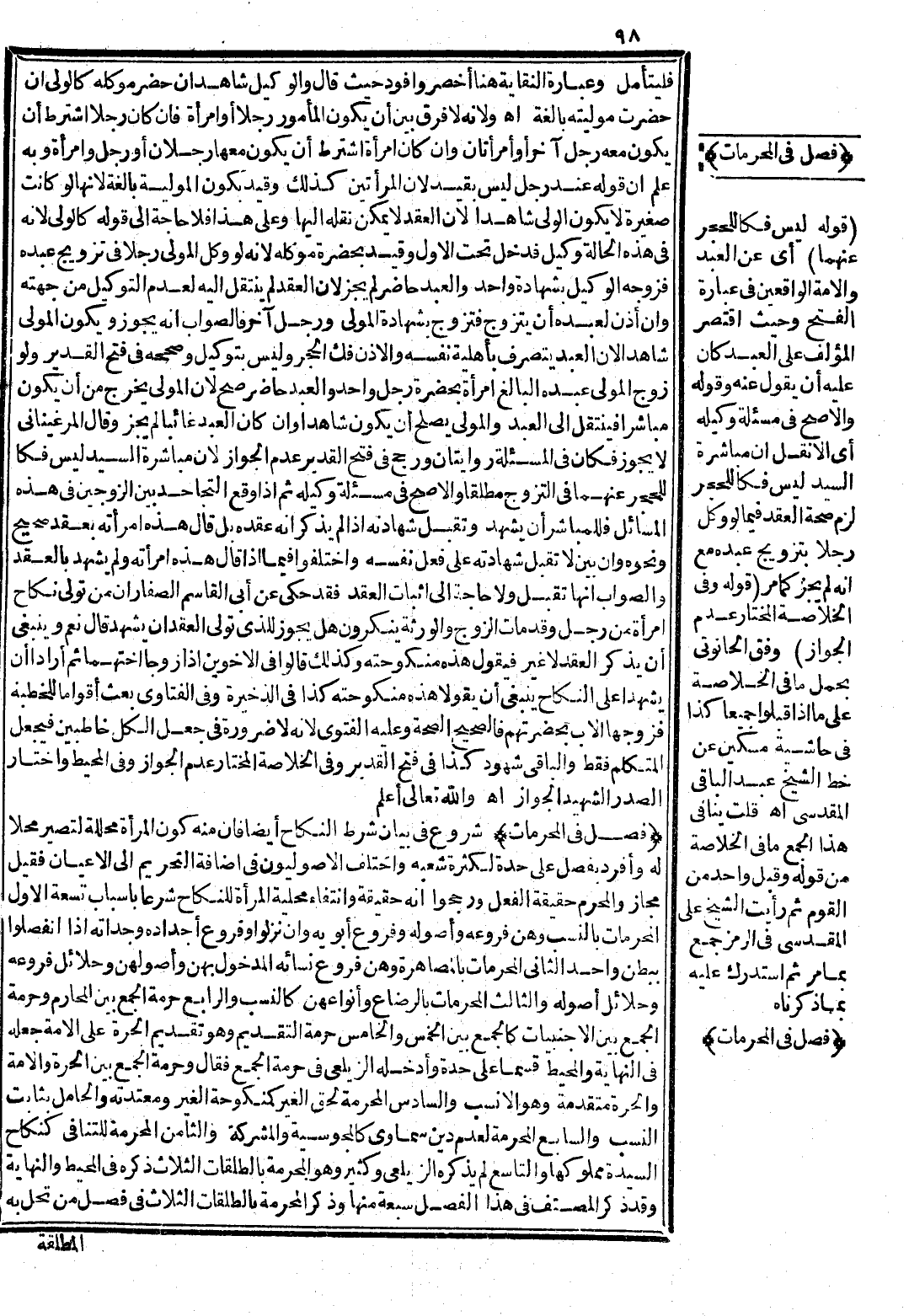 شُرُوعٌ فِي بَيَانِ شَرْطِ النِّكَاحِ أَيْضًا فَإِنَّ مِنْهُ كَوْنَ الْمَرْأَةِ مُحَلَّلَةً لِتَصِيرَ مَحَلًّا لَهُ وَأَفْرَدَ بِفَصْلٍ عَلَى حِدَةٍ لِكَثْرَةِ شُعَبِهِ، وَاخْتَلَفَ الْأُصُولِيُّونَ فِي إضَافَةِ التَّحْرِيمِ إلَى الْأَعْيَانِ، فَقِيلَ: مَجَازٌ وَالْمُحَرَّمُ حَقِيقَةً الْفِعْلُ، وَرَجَّحُوا أَنَّهُ حَقِيقَةٌ وَانْتِفَاءُ مَحَلِّيَّةِ الْمَرْأَةِ لِلنِّكَاحِ شَرْعًا بِأَسْبَابٍ تِسْعَةٍ: الْأَوَّلُ الْمُحَرَّمَاتُ بِالنَّسَبِ: وَهُنَّ فُرُوعُهُ وَأُصُولُهُ وَفُرُوعُ أَبَوَيْهِ وَإِنْ نَزَلُوا وَفُرُوعُ أَجْدَادِهِ وَجَدَّاتِهِ إذَا انْفَصَلُوا بِبَطْنٍ وَاحِدٍ. الثَّانِي الْمُحَرَّمَاتُ بِالْمُصَاهَرَةِ: وَهُنَّ فُرُوعُ نِسَائِهِ الْمَدْخُولِ بِهِنَّ وَأُصُولُهُنَّ وَحَلَائِلُ فُرُوعِهِ وَحَلَائِلُ أُصُولِهِ، وَالثَّالِثُ الْمُحَرَّمَاتُ بِالرَّضَاعِ وَأَنْوَاعُهُنَّ كَالنَّسَبِ، وَالرَّابِعُ حُرْمَةُ الْجَمْعِ بَيْنَ الْمَحَارِمِ وَحُرْمَةُ الْجَمْعِ بَيْنَ الْأَجْنَبِيَّاتِ كَالْجَمْعِ بَيْنَ الْخَمْسِ، وَالْخَامِسُ حُرْمَةُ التَّقْدِيمِ وَهُوَ تَقْدِيمُ الْحُرَّةِ عَلَى الْأَمَةِ جَعَلَهُ فِي النِّهَايَةِ وَالْمُحِيطِ قِسْمًا عَلَى حِدَةٍ وَأَدْخَلَهُ الزَّيْلَعِيُّ فِي حُرْمَةِ الْجَمْعِ، فَقَالَ: وَحُرْمَةُ الْجَمْعِ بَيْنَ الْحُرَّةِ وَالْأَمَةِ وَالْحُرَّةُ مُتَقَدِّمَةٌ وَهُوَ الْأَنْسَبُ، وَالسَّادِسُ الْمُحَرَّمَةُ لِحَقِّ الْغَيْرِ كَمَنْكُوحَةِ الْغَيْرِ وَمُعْتَدَّتِهِ وَالْحَامِلِ بِثَابِتِ النَّسَبِ، وَالسَّابِعُ الْمُحَرَّمَةُ لِعَدَمِ دِينٍ سَمَاوِيٍّ كَالْمَجُوسِيَّةِ وَالْمُشْتَرَكَةِ، وَالثَّامِنُ الْمُحَرَّمَةُ لِلتَّنَافِي كَنِكَاحِ السَّيِّدَةِ مَمْلُوكَهَا، وَالتَّاسِعُ لَمْ يَذْكُرْهُ الزَّيْلَعِيُّ وَكَثِيرٌ وَهُوَ الْمُحَرَّمَةُ بِالطَّلْقَاتِ الثَّلَاثِ ذَكَرَهُ فِي الْمُحِيطِ وَالنِّهَايَةِ، وَقَدْ ذَكَرَ الْمُصَنِّفُ فِي هَذَا الْفَصْلِ سَبْعَةً مِنْهَا، وَذَكَرَ الْمُحَرَّمَةَ بِالطَّلْقَاتِ الثَّلَاثَةِ فِي فَصْلِ مَنْ تَحِلُّ بِهِ