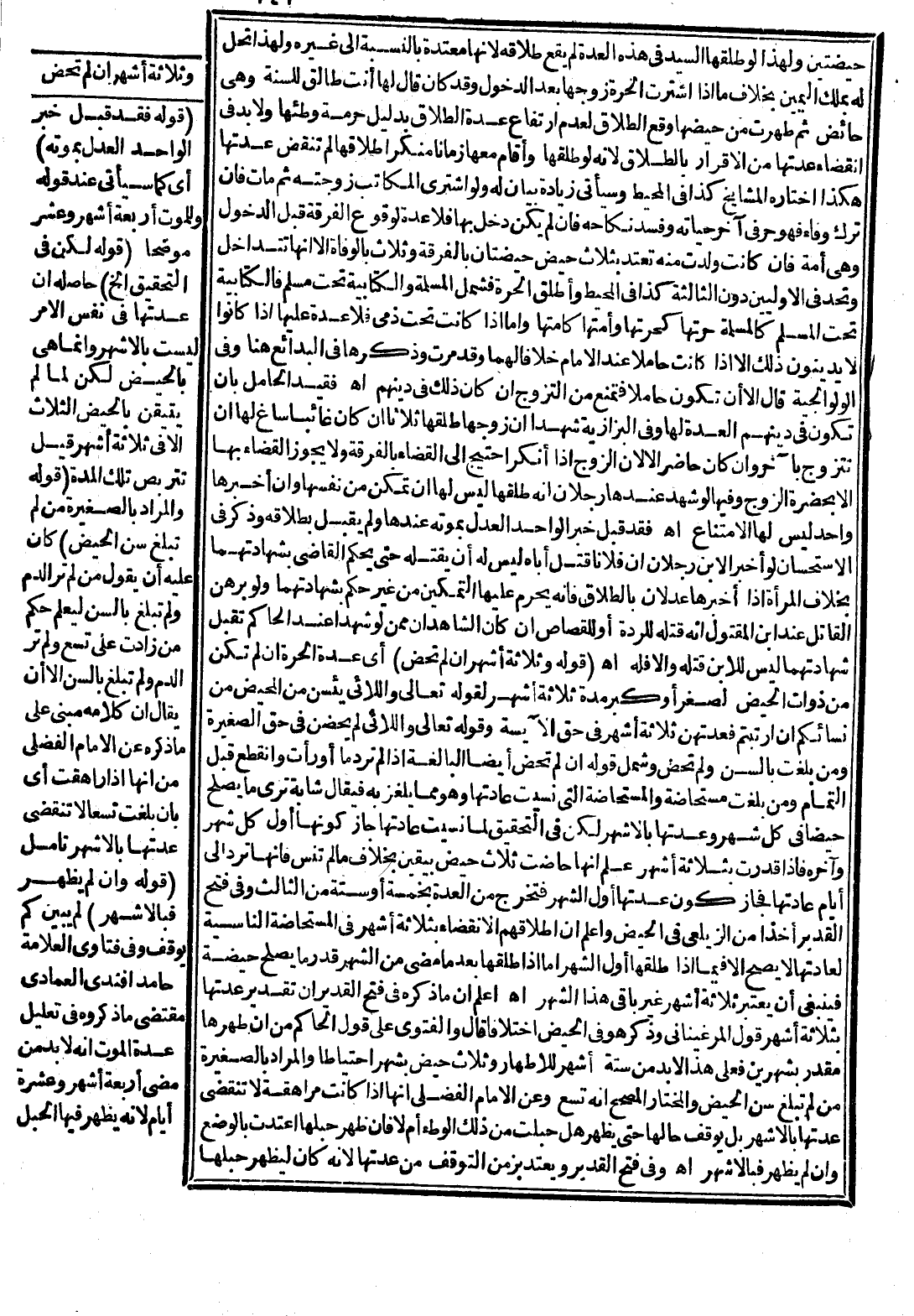 (قَوْلُهُ وَثَلَاثَةُ أَشْهُرٍ إنْ لَمْ تَحِضْ) أَيْ: عِدَّةُ الْحُرَّةِ إنْ لَمْ تَكُنْ مِنْ ذَوَاتِ الْحَيْضِ لِصِغَرٍ أَوْ كِبَرٍ مُدَّةُ ثَلَاثَةِ أَشْهُرٍ لِقَوْلِهِ تَعَالَى {وَاللائِي يَئِسْنَ مِنَ الْمَحِيضِ مِنْ نِسَائِكُمْ إِنِ ارْتَبْتُمْ فَعِدَّتُهُنَّ ثَلاثَةُ أَشْهُرٍ} [الطلاق: 4] فِي حَقِّ الْآيِسَةِ وقَوْله تَعَالَى {وَاللائِي لَمْ يَحِضْنَ} [الطلاق: 4] فِي حَقِّ الصَّغِيرَةِ وَمَنْ بَلَغَتْ بِالسِّنِّ وَلَمْ تَحِضْ وَشَمِلَ قَوْلُهُ إنْ لَمْ تَحِضْ أَيْضًا الْبَالِغَةَ إذَا لَمْ تَرَ دَمًا أَوْ رَأَتْ وَانْقَطَعَ قَبْلَ التَّمَامِ وَمَنْ بَلَغَتْ مُسْتَحَاضَةً وَالْمُسْتَحَاضَةُ الَّتِي نَسِيَتْ عَادَتَهَا وَهُوَ مِمَّا يُلْغَزُ بِهِ فَيُقَالُ شَابَّةٌ تَرَى مَا يَصْلُحُ حَيْضًا فِي كُلِّ شَهْرٍ وَعِدَّتُهَا بِالْأَشْهُرِ لَكِنْ فِي التَّحْقِيقِ لَمَّا نَسِيَتْ عَادَتَهَا جَازَ كَوْنُهَا أَوَّلَ كُلِّ شَهْرٍ وَآخِرَهُ فَإِذَا قُدِّرَتْ بِثَلَاثَةِ أَشْهُرٍ عُلِمَ أَنَّهَا حَاضَتْ ثَلَاثَ حِيَضٍ بِيَقِينٍ بِخِلَافِ مَا لَمْ تَنْسَ فَإِنَّهَا تُرَدُّ إلَى أَيَّامِ عَادَتِهَا فَجَازَ كَوْنُ عِدَّتِهَا أَوَّلَ الشَّهْرِ فَتَخْرُجُ مِنْ الْعِدَّةِ بِخَمْسَةٍ أَوْ سِتَّةٍ مِنْ الثَّالِثِ، وَفِي فَتْحِ الْقَدِيرِ أَخْذًا مِنْ الزَّيْلَعِيِّ فِي الْحَيْضِ وَاعْلَمْ أَنَّ إطْلَاقَهُمْ الِانْقِضَاءَ بِثَلَاثَةِ أَشْهُرٍ فِي الْمُسْتَحَاضَةِ النَّاسِيَةِ لِعَادَتِهَا لَا يَصِحُّ إلَّا فِيمَا إذَا طَلَّقَهَا أَوَّلَ الشَّهْرِ أَمَّا إذَا طَلَّقَهَا بَعْدَمَا مَضَى مِنْ الشَّهْرِ قَدْرَ مَا يَصْلُحُ حَيْضَةً فَيَنْبَغِي أَنْ يُعْتَبَرَ ثَلَاثَةُ أَشْهُرٍ غَيْرَ بَاقِي هَذَا الشَّهْرِ اهـ.