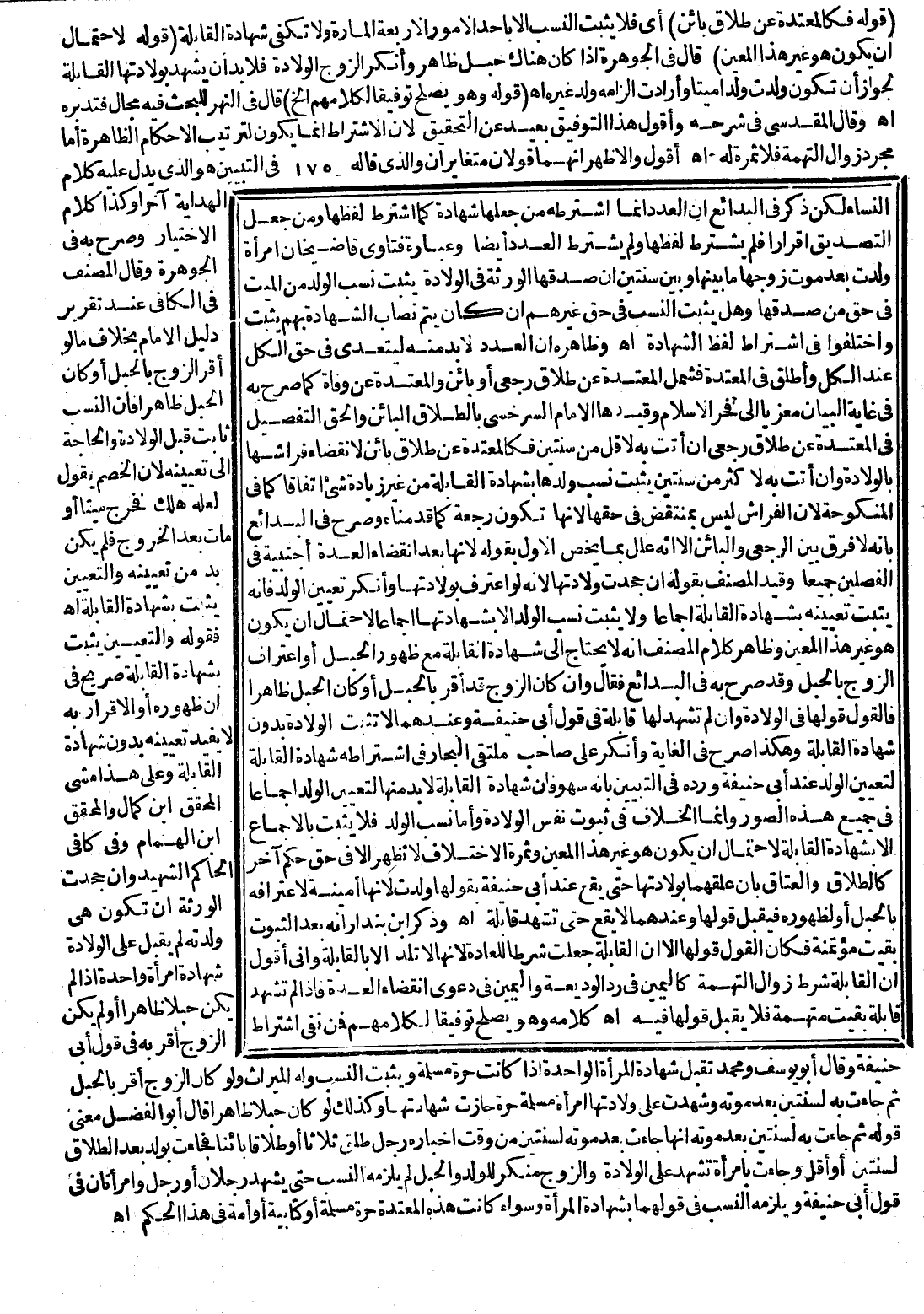 فَقَوْلُهُ وَالتَّعْيِينُ يَثْبُتُ بِشَهَادَةِ الْقَابِلَةِ صَرِيحٌ فِي أَنَّ ظُهُورَهُ أَوْ الْإِقْرَارَ بِهِ لَا يُفِيدُ تَعْيِينَهُ بِدُونِ شَهَادَةِ الْقَابِلَةِ وَعَلَى هَذَا مَشَى الْمُحَقِّقُ ابْنُ كَمَالٍ وَالْمُحَقِّقُ ابْنُ الْهُمَامِ، وَفِي كَافِي الْحَاكِمِ الشَّهِيدِ وَإِنْ جَحَدَتْ الْوَرَثَةُ أَنْ تَكُونَ هِيَ وَلَدَتْهُ لَمْ يُقْبَلْ عَلَى الْوِلَادَةِ شَهَادَةُ امْرَأَةٍ وَاحِدَةٍ إذَا لَمْ يَكُنْ حَبَلًا ظَاهِرًا أَوْ لَمْ يَكُنْ الزَّوْجُ أَقَرَّ بِهِ فِي قَوْلِ أَبِي حَنِيفَةَ وَقَالَ أَبُو يُوسُفَ وَمُحَمَّدٌ تُقْبَلُ شَهَادَةُ الْمَرْأَةِ الْوَاحِدَةِ إذَا كَانَتْ حُرَّةً مُسْلِمَةً وَيَثْبُتُ النَّسَبُ وَلَهُ الْمِيرَاثُ، وَلَوْ كَانَ الزَّوْجُ أَقَرَّ بِالْحَبَلِ ثُمَّ جَاءَتْ بِهِ لِسَنَتَيْنِ بَعْدَ مَوْتِهِ وَشَهِدَتْ عَلَى وِلَادَتِهَا امْرَأَةٌ مُسْلِمَةٌ حُرَّةٌ جَازَتْ شَهَادَتُهَا وَكَذَلِكَ لَوْ كَانَ حَبَلًا ظَاهِرًا قَالَ أَبُو الْفَضْلِ مَعْنَى قَوْلِهِ ثُمَّ جَاءَتْ بِهِ لِسَنَتَيْنِ بَعْدَ مَوْتِهِ أَنَّهَا جَاءَتْ بَعْدَ مَوْتِهِ لِسَنَتَيْنِ مِنْ وَقْتِ إخْبَارِهِ رَجُلٌ طَلَّقَ ثَلَاثًا أَوْ طَلَاقًا بَائِنًا فَجَاءَتْ بِوَلَدٍ بَعْدَ الطَّلَاقِ لِسَنَتَيْنِ أَوْ أَقَلَّ وَجَاءَتْ بِامْرَأَةٍ تَشْهَدُ عَلَى الْوِلَادَةِ وَالزَّوْجُ مُنْكِرٌ لِلْوَلَدِ وَالْحَبَلِ لَمْ يَلْزَمْهُ النَّسَبُ حَتَّى يَشْهَدَ رَجُلَانِ أَوْ رَجُلٌ وَامْرَأَتَانِ فِي قَوْلِ أَبِي حَنِيفَةَ وَيَلْزَمُهُ النَّسَبُ فِي قَوْلِهِمَا بِشَهَادَةِ الْمَرْأَةِ وَسَوَاءٌ كَانَتْ هَذِهِ الْمُعْتَدَّةُ حُرَّةً مُسْلِمَةً أَوْ كِتَابِيَّةً أَوْ أَمَةً فِي هَذَا الْحُكْمِ اهـ.