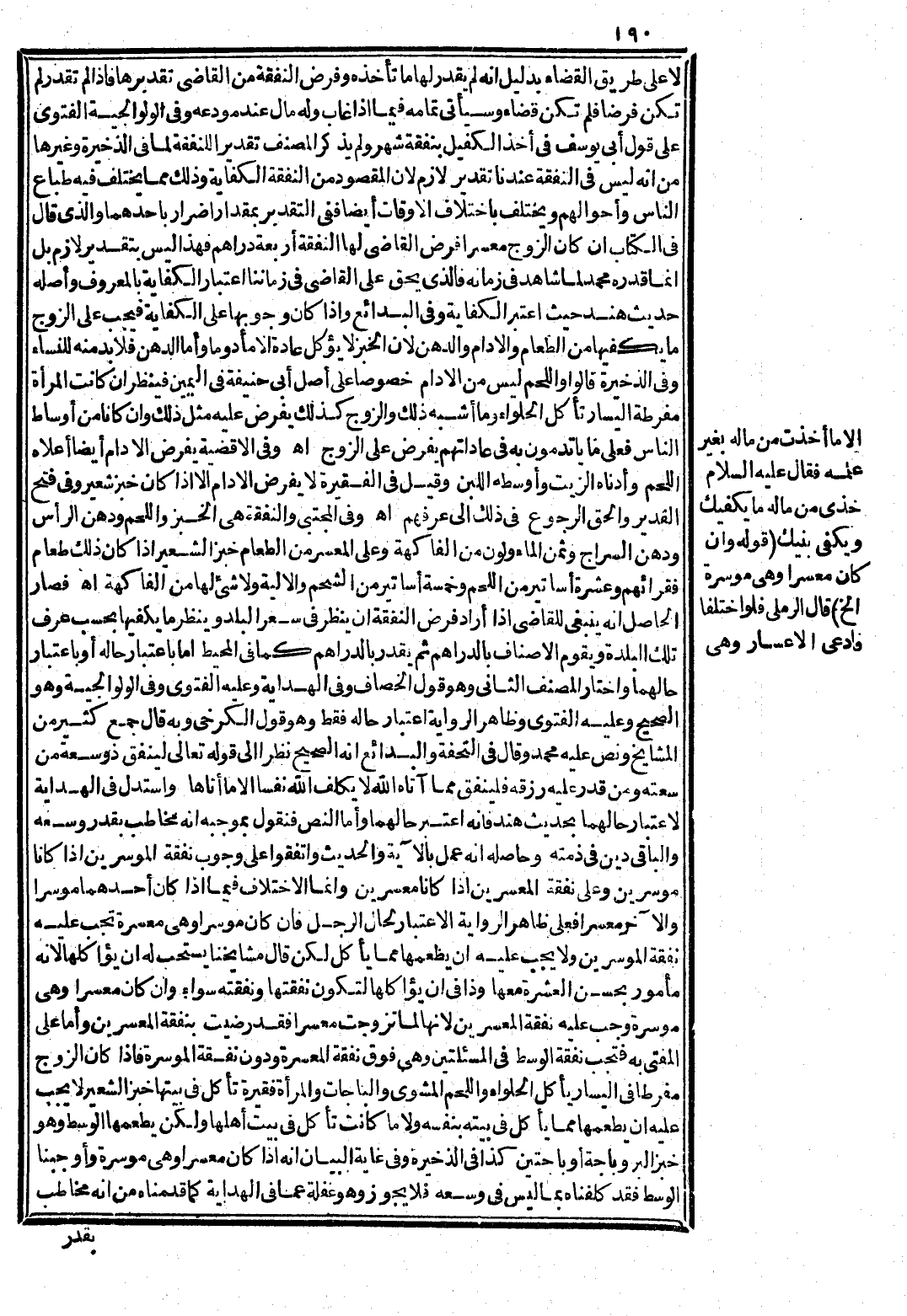 لَا عَلَى طَرِيقِ الْقَضَاءِ بِدَلِيلِ أَنَّهُ لَمْ يُقَدِّرْ لَهَا مَا تَأْخُذُهُ وَفَرْضُ النَّفَقَةِ مِنْ الْقَاضِي تَقْدِيرُهَا فَإِذَا لَمْ تُقَدَّرْ لَمْ تَكُنْ فَرْضًا فَلَمْ تَكُنْ قَضَاءً وَسَيَأْتِي تَمَامُهُ فِيمَا إذَا غَابَ وَلَهُ مَالٌ عِنْدَ مُودَعِهِ، وَفِي الْوَلْوَالِجيَّةِ الْفَتْوَى عَلَى قَوْلِ أَبِي يُوسُفَ فِي أَخْذِ الْكَفِيلِ بِنَفَقَةِ شَهْرٍ وَلَمْ يَذْكُرْ الْمُصَنِّفُ تَقْدِيرًا لِلنَّفَقَةِ لِمَا فِي الذَّخِيرَةِ وَغَيْرِهَا مِنْ أَنَّهُ لَيْسَ فِي النَّفَقَةِ عِنْدَنَا تَقْدِيرٌ لَازِمٌ؛ لِأَنَّ الْمَقْصُودَ مِنْ النَّفَقَةِ الْكِفَايَةُ وَذَلِكَ مِمَّا يَخْتَلِفُ فِيهِ طِبَاعُ النَّاسِ وَأَحْوَالُهُمْ وَيَخْتَلِفُ بِاخْتِلَافِ الْأَوْقَاتِ أَيْضًا فَفِي التَّقْدِيرِ بِمِقْدَارٍ إضْرَارٌ بِأَحَدِهِمَا وَاَلَّذِي قَالَ فِي الْكِتَابِ إنْ كَانَ الزَّوْجُ مُعْسِرًا فَرَضَ الْقَاضِي لَهَا النَّفَقَةَ أَرْبَعَةَ دَرَاهِمَ فَهَذَا لَيْسَ بِتَقْدِيرٍ لَازِمٍ، بَلْ إنَّمَا قَدَّرَهُ مُحَمَّدٌ لِمَا شَاهَدَ فِي زَمَانِهِ فَاَلَّذِي يَحِقُّ عَلَى الْقَاضِي فِي زَمَانِنَا اعْتِبَارُ الْكِفَايَةِ بِالْمَعْرُوفِ وَأَصْلُهُ حَدِيثُ هِنْدَ حَيْثُ اعْتَبَرَ الْكِفَايَةَ وَفِي الْبَدَائِعِ، وَإِذَا كَانَ وُجُوبُهَا عَلَى الْكِفَايَةِ فَيَجِبُ عَلَى الزَّوْجِ مَا يَكْفِيهَا مِنْ الطَّعَامِ وَالْإِدَامِ وَالدُّهْنِ؛ لِأَنَّ الْخُبْزَ لَا يُؤْكَلُ عَادَةً إلَّا مَأْدُومًا، وَأَمَّا الدُّهْنُ فَلَا بُدَّ مِنْهُ لِلنِّسَاءِ وَفِي الذَّخِيرَةِ قَالُوا وَاللَّحْمُ لَيْسَ مِنْ الْإِدَامِ خُصُوصًا عَلَى أَصْلِ أَبِي حَنِيفَةَ فِي الْيَمِينِ، فَيُنْظَرُ إنْ كَانَتْ الْمَرْأَةُ مُفْرِطَةَ الْيَسَارِ تَأْكُلُ الْحَلْوَاءَ وَمَا أَشْبَهَ ذَلِكَ وَالزَّوْجُ كَذَلِكَ يَفْرِضُ عَلَيْهِ مِثْلَ ذَلِكَ وَإِنْ كَانَ مِنْ أَوْسَاطِ النَّاسِ فَعَلَى مَا يَأْتَدِمُونَ بِهِ فِي عَادَاتِهِمْ يَفْرِضُ عَلَى الزَّوْجِ اهـ.