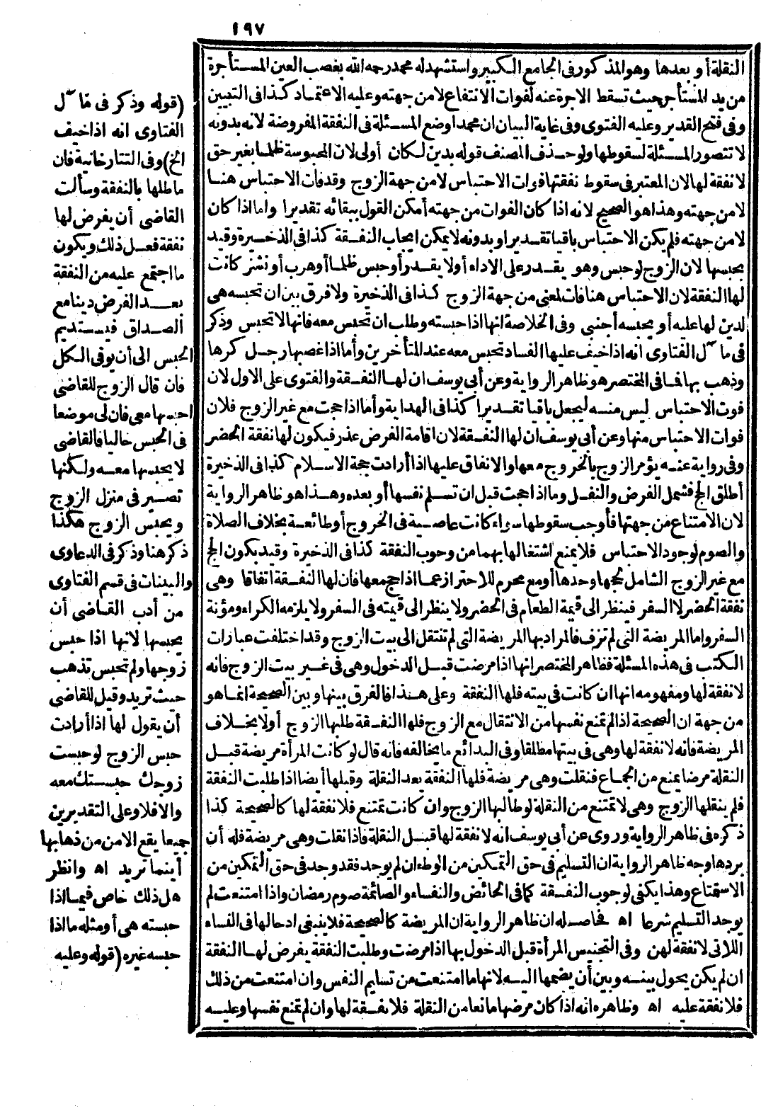 النُّقْلَةِ أَوْ بَعْدَهَا وَهُوَ الْمَذْكُورُ فِي الْجَامِعِ الْكَبِيرِ وَاسْتَشْهَدَ لَهُ مُحَمَّدٌ - رَحِمَهُ اللَّهُ - بِغَصْبِ الْعَيْنِ الْمُسْتَأْجَرَةِ مِنْ يَدِ الْمُسْتَأْجِرِ حَيْثُ تَسْقُطُ الْأُجْرَةُ لِفَوَاتِ الِانْتِفَاعِ لَا مِنْ جِهَتِهِ وَعَلَيْهِ الِاعْتِمَادُ، كَذَا فِي التَّبْيِينِ وَفِي فَتْحِ الْقَدِيرِ وَعَلَيْهِ الْفَتْوَى، وَفِي غَايَةِ الْبَيَانِ أَنَّ مُحَمَّدًا وَضَعَ الْمَسْأَلَةَ فِي النَّفَقَةِ الْمَفْرُوضَةِ؛ لِأَنَّهُ بِدُونِهِ لَا تُتَصَوَّرُ الْمَسْأَلَةُ لِسُقُوطِهَا، وَلَوْ حَذَفَ الْمُصَنِّفُ قَوْلَهُ بِدَيْنٍ لَكَانَ أَوْلَى؛ لِأَنَّ الْمَحْبُوسَةَ ظُلْمًا بِغَيْرِ حَقٍّ لَا نَفَقَةَ لَهَا؛ لِأَنَّ الْمُعْتَبَرَ فِي سُقُوطِ نَفَقَتِهَا فَوَاتُ الِاحْتِبَاسِ لَا مِنْ جِهَةِ الزَّوْجِ، وَقَدْ فَاتَ الِاحْتِبَاسُ هُنَا لَا مِنْ جِهَتِهِ، وَهَذَا هُوَ الصَّحِيحُ؛ لِأَنَّهُ إذَا كَانَ الْفَوَاتُ مِنْ جِهَتِهِ أَمْكَنَ الْقَوْلُ بِبَقَائِهِ تَقْدِيرًا، وَأَمَّا إذَا كَانَ لَا مِنْ جِهَتِهِ فَلَمْ يَكُنْ الِاحْتِبَاسُ بَاقِيًا تَقْدِيرًا وَبِدُونِهِ لَا يُمْكِنُ إيجَابُ النَّفَقَةِ، كَذَا فِي الذَّخِيرَةِ وَقَيَّدَ بِحَبْسِهَا؛ لِأَنَّ الزَّوْجَ لَوْ حُبِسَ وَهُوَ يَقْدِرُ عَلَى الْأَدَاءِ أَوْ لَا يَقْدِرُ أَوْ حُبِسَ ظُلْمًا أَوْ هَرَبَ أَوْ نَشَزَ كَانَتْ لَهَا النَّفَقَةُ؛ لِأَنَّ الِاحْتِبَاسَ هُنَا فَاتَ لِمَعْنًى مِنْ جِهَةِ الزَّوْجِ، كَذَا فِي الذَّخِيرَةِ وَلَا فَرْقَ بَيْنَ أَنْ تَحْبِسَهُ هِيَ لِدَيْنٍ لَهَا عَلَيْهِ أَوْ يَحْبِسَهُ أَجْنَبِيٌّ.