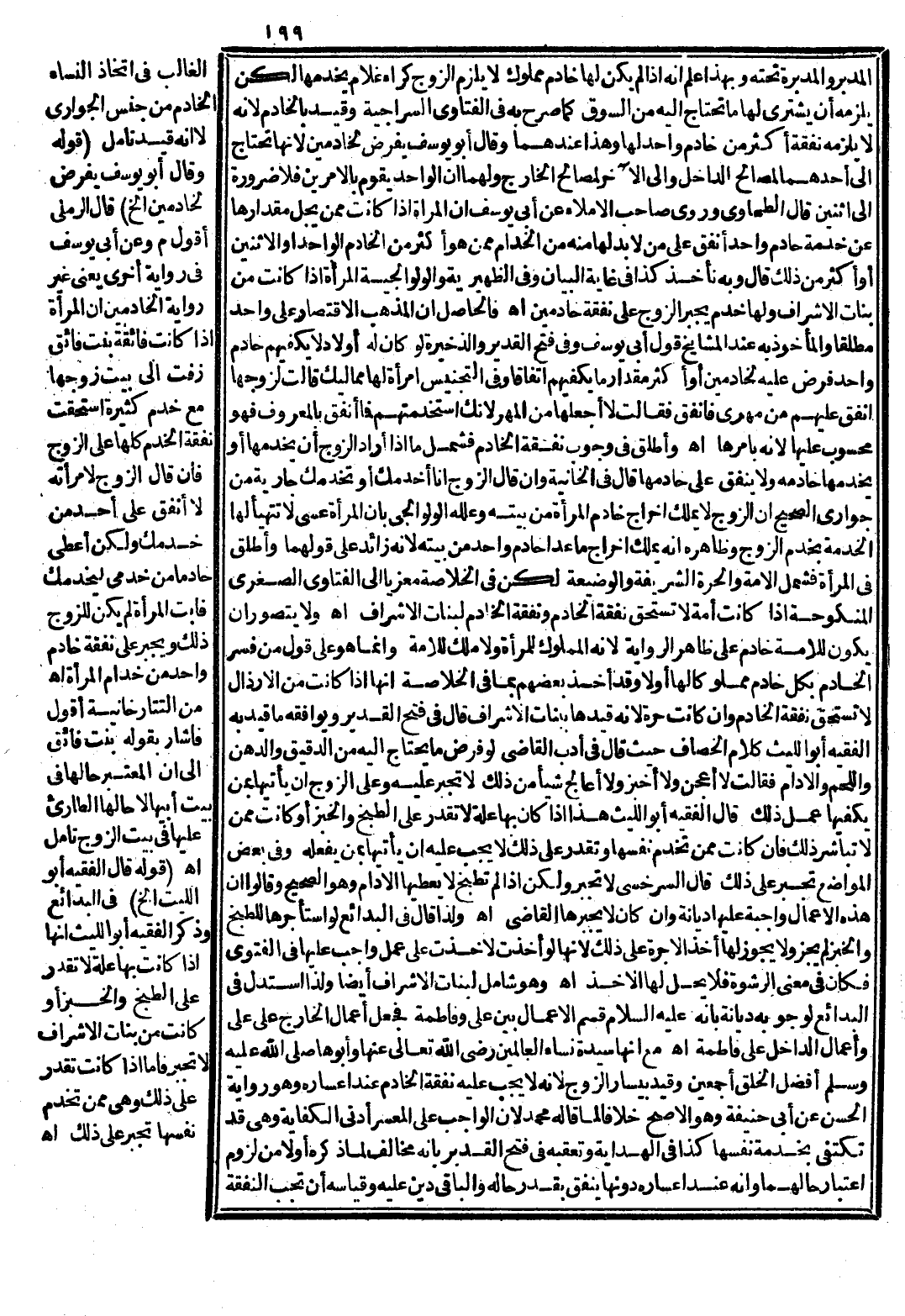 مَعَ أَنَّهَا سَيِّدَةُ نِسَاءِ الْعَالَمِينَ - رَضِيَ اللَّهُ تَعَالَى عَنْهَا - وَأَبُوهَا - صَلَّى اللَّهُ عَلَيْهِ وَسَلَّمَ - أَفْضَلُ الْخَلْقِ أَجْمَعِينَ وَقَيَّدَ بِيَسَارِ الزَّوْجِ؛ لِأَنَّهُ لَا يَجِبُ عَلَيْهِ نَفَقَةُ الْخَادِمِ عِنْدَ إعْسَارِهِ وَهُوَ رِوَايَةُ الْحَسَنِ عَنْ أَبِي حَنِيفَةَ وَهُوَ الْأَصَحُّ خِلَافًا لِمَا قَالَهُ مُحَمَّدٌ؛ لِأَنَّ الْوَاجِبَ عَلَى الْمُعْسِرِ أَدْنَى الْكِفَايَةِ وَهِيَ قَدْ تَكْتَفِي بِخِدْمَةِ نَفْسِهَا، كَذَا فِي الْهِدَايَةِ وَتَعَقَّبَهُ فِي فَتْحِ الْقَدِيرِ بِأَنَّهُ مُخَالِفٌ لِمَا ذَكَرَهُ أَوَّلًا مِنْ لُزُومِ اعْتِبَارِ حَالِهِمَا وَأَنَّهُ عِنْدَ إعْسَارِهِ دُونَهَا يُنْفِقُ بِقَدْرِ حَالِهِ وَالْبَاقِي دَيْنٌ عَلَيْهِ وَقِيَاسُهُ أَنْ تَجِبَ النَّفَقَةُ