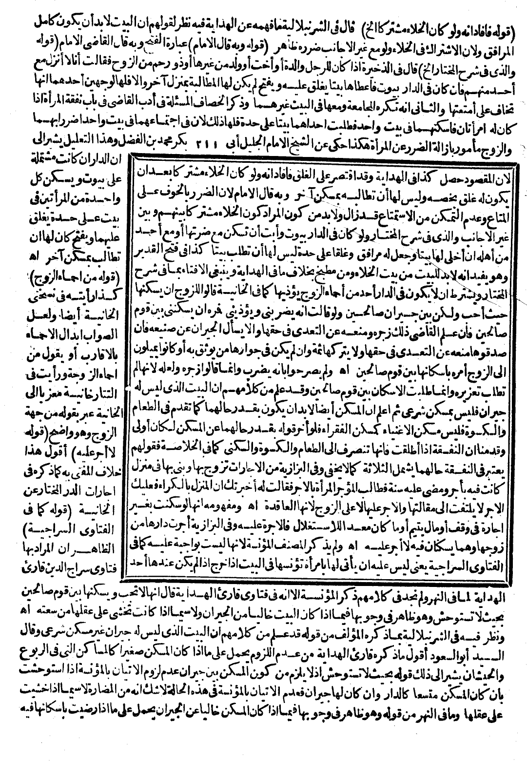 وَنَظَرَ فِي الشُّرُنْبُلَالِيَّةِ بِمَا ذَكَرَ الْمُؤَلِّفُ مِنْ قَوْلِهِ قَدْ عُلِمَ مِنْ كَلَامِهِمْ أَنَّ الْبَيْتَ الَّذِي لَيْسَ لَهُ جِيرَانٌ غَيْرُ مَسْكَنٍ شَرْعِيٍّ، وَقَالَ السَّيِّدُ أَبُو السُّعُودِ أَقُولُ: مَا ذَكَرَهُ قَارِئُ الْهِدَايَةِ مِنْ عَدَمِ اللُّزُومِ وَيُحْمَلُ عَلَى مَا إذَا كَانَ الْمَسْكَنُ صَغِيرًا كَالْمَسَاكِنِ الَّتِي فِي الرُّبُوعِ وَالْحَيْشَانِ يُشِيرُ إلَى ذَلِكَ قَوْلُهُ بِحَيْثُ لَا تَسْتَوْحِشُ إذْ لَا يَلْزَمُ مِنْ كَوْنِ الْمَسْكَنِ بَيْنَ جِيرَانٍ عَدَمُ لُزُومِ الْإِتْيَانِ بِالْمُؤْنِسَةِ إذَا اسْتَوْحَشَتْ بِأَنْ كَانَ الْمَسْكَنُ مُتَّسِعًا كَالدَّارِ وَإِنْ كَانَ لَهَا جِيرَانٌ فَعَدَمُ الْإِتْيَانِ بِالْمُؤْنِسَةِ فِي هَذِهِ الْحَالَةِ لَا شَكَّ أَنَّهُ مِنْ الْمُضَارَّةِ لَا سِيَّمَا إذَا خَشِيَتْ عَلَى عَقْلِهَا وَمَا فِي النَّهْرِ مِنْ قَوْلِهِ وَهُوَ ظَاهِرٌ فِي وُجُوبِهَا فِيمَا إذَا كَانَ الْمَسْكَنُ خَالِيًا عَنْ الْجِيرَانِ يُحْمَلُ عَلَى مَا إذَا رَضِيَتْ بِإِسْكَانِهَا