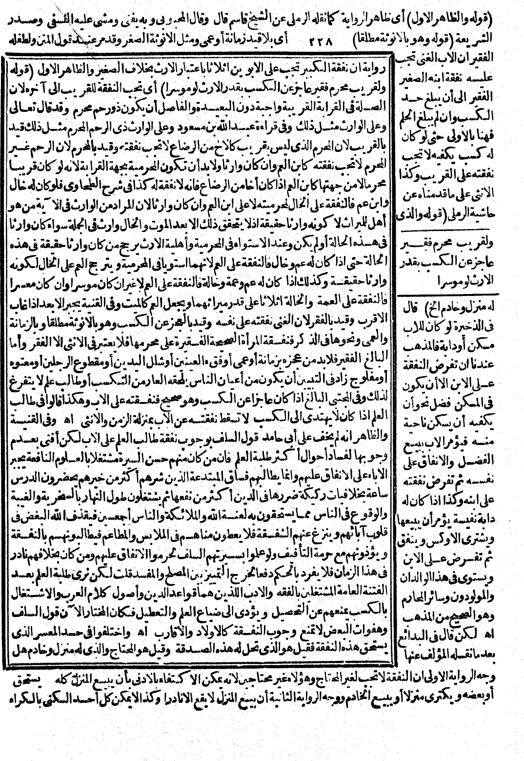 لَكِنْ قَالَ فِي الْبَدَائِعِ بَعْدَمَا نَقَلَهُ الْمُؤَلِّفُ عَنْهَا وَجْهُ الرِّوَايَةِ الْأُولَى أَنَّ النَّفَقَةَ لَا تَجِبُ لِغَيْرِ الْمُحْتَاجِ وَهَؤُلَاءِ غَيْرُ مُحْتَاجِينَ؛ لِأَنَّهُ يُمْكِنُ الِاكْتِفَاءُ بِالْأَدْنَى بِأَنْ يَبِيعَ الْمَنْزِلَ كُلَّهُ أَوْ بَعْضَهُ وَيَكْتَرِيَ مَنْزِلًا أَوْ يَبِيعَ الْخَادِمَ وَوَجْهُ الرِّوَايَةِ الثَّانِيَةِ أَنَّ بَيْعَ الْمَنْزِلِ لَا يَقَعُ إلَّا نَادِرًا، وَكَذَا لَا يُمْكِنُ كُلَّ أَحَدٍ السُّكْنَى بِالْكِرَاءِ