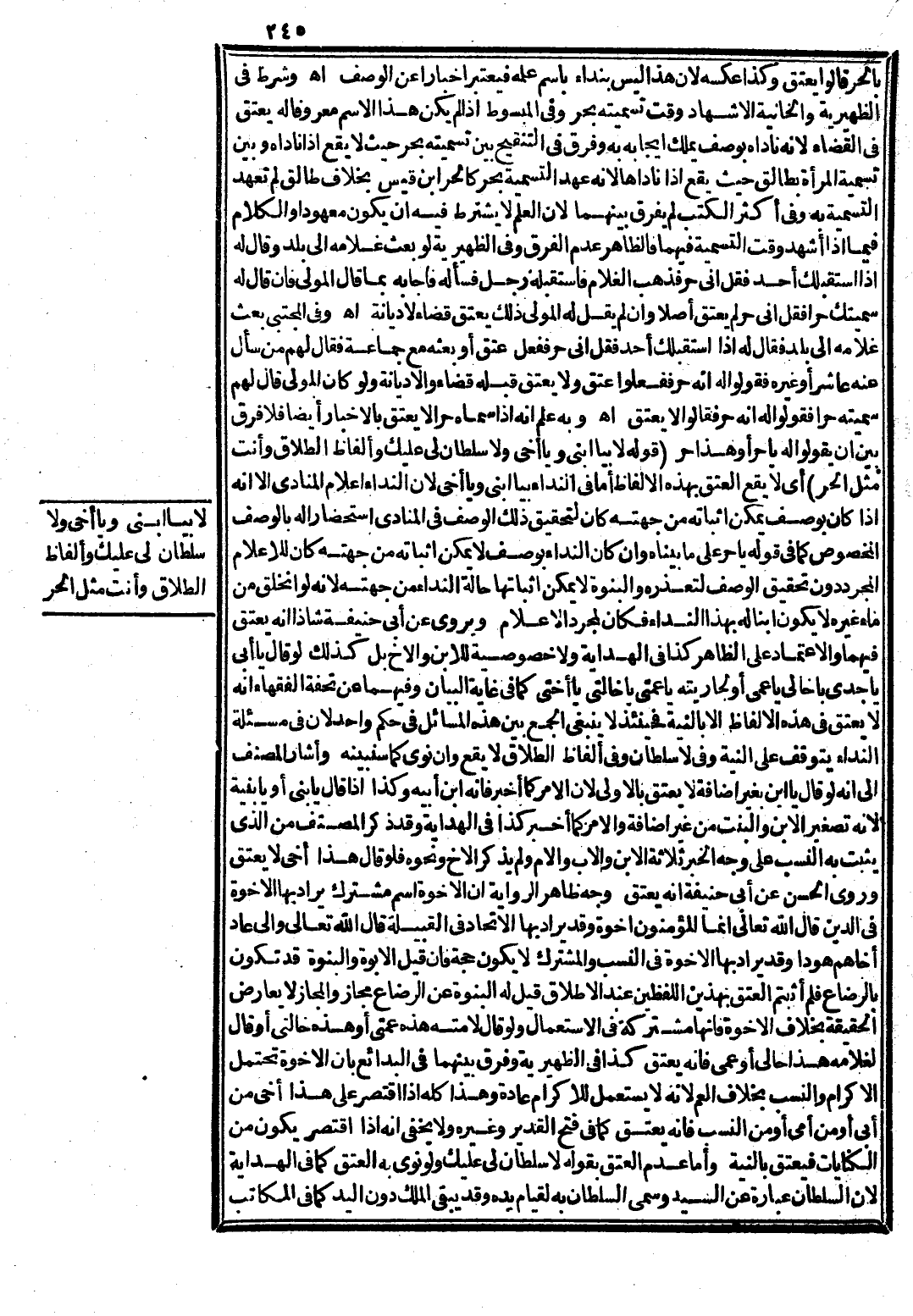 فَلَوْ قَالَ هَذَا أَخِي لَا يَعْتِقُ وَرَوَى الْحَسَنُ عَنْ أَبِي حَنِيفَةَ أَنَّهُ يَعْتِقُ وَجْهُ ظَاهِرِ الرِّوَايَةِ أَنَّ الْأُخُوَّةُ اسْمٌ مُشْتَرَكٌ يُرَادُ بِهَا الْأُخُوَّةُ فِي الدِّينِ قَالَ اللَّهُ تَعَالَى {إِنَّمَا الْمُؤْمِنُونَ إِخْوَةٌ} [الحجرات: 10] ، وَقَدْ يُرَادُ بِهَا الِاتِّحَادُ فِي الْقَبِيلَةِ قَالَ اللَّهُ تَعَالَى {وَإِلَى عَادٍ أَخَاهُمْ هُودًا} [الأعراف: 65] ، وَقَدْ يُرَادُ بِهَا الْأُخُوَّةُ فِي النَّسَبِ وَالْمُشْتَرَكُ لَا يَكُونُ حُجَّةً فَإِنْ قِيلَ الْأُبُوَّةُ وَالْبُنُوَّةُ قَدْ تَكُونُ بِالرَّضَاعِ فَلِمَ أَثْبَتُّمْ الْعِتْقَ بِهَذَيْنِ اللَّفْظَيْنِ عِنْدَ الْإِطْلَاقِ؟ قِيلَ لَهُ الْبُنُوَّةُ عَنْ الرَّضَاعِ مَجَازٌ وَالْمَجَازُ لَا يُعَارِضُ الْحَقِيقَةَ بِخِلَافِ الْأُخُوَّةِ فَإِنَّهَا مُشْتَرَكَةٌ فِي الِاسْتِعْمَالِ، وَلَوْ قَالَ لِأَمَتِهِ هَذِهِ عَمَّتِي أَوْ هَذِهِ خَالَتِي أَوْ قَالَ لِغُلَامِهِ هَذَا خَالِي أَوْ عَمِّي فَإِنَّهُ يَعْتِقُ كَذَا فِي الظَّهِيرِيَّةِ وَفَرَّقَ بَيْنَهُمَا فِي الْبَدَائِعِ بِأَنَّ الْأُخُوَّةَ تَحْتَمِلُ الْإِكْرَامَ وَالنَّسَبَ بِخِلَافِ الْعَمِّ؛ لِأَنَّهُ لَا يُسْتَعْمَلُ لِلْإِكْرَامِ عَادَةً، وَهَذَا كُلُّهُ إذَا اقْتَصَرَ عَلَى هَذَا أَخِي مِنْ أَبِي أَوْ مِنْ أُمِّي أَوْ مِنْ النَّسَبِ فَإِنَّهُ يَعْتِقُ كَمَا فِي فَتْحِ الْقَدِيرِ وَغَيْرِهِ وَلَا يَخْفَى أَنَّهُ إذَا اقْتَصَرَ يَكُونُ مِنْ الْكِنَايَاتِ فَيَعْتِقُ بِالنِّيَّةِ، أَمَّا عَدَمُ الْعِتْقِ بِقَوْلِهِ لَا سُلْطَانَ لِي عَلَيْك، وَلَوْ نَوَى بِهِ الْعِتْقَ كَمَا فِي الْهِدَايَةِ؛ لِأَنَّ السُّلْطَانَ عِبَارَةٌ عَنْ السَّيِّدِ وَسُمِّيَ السُّلْطَانُ بِهِ لِقِيَامِ يَدِهِ، وَقَدْ يَبْقَى الْمِلْكُ دُونَ الْيَدِ كَمَا فِي الْمُكَاتَبِ