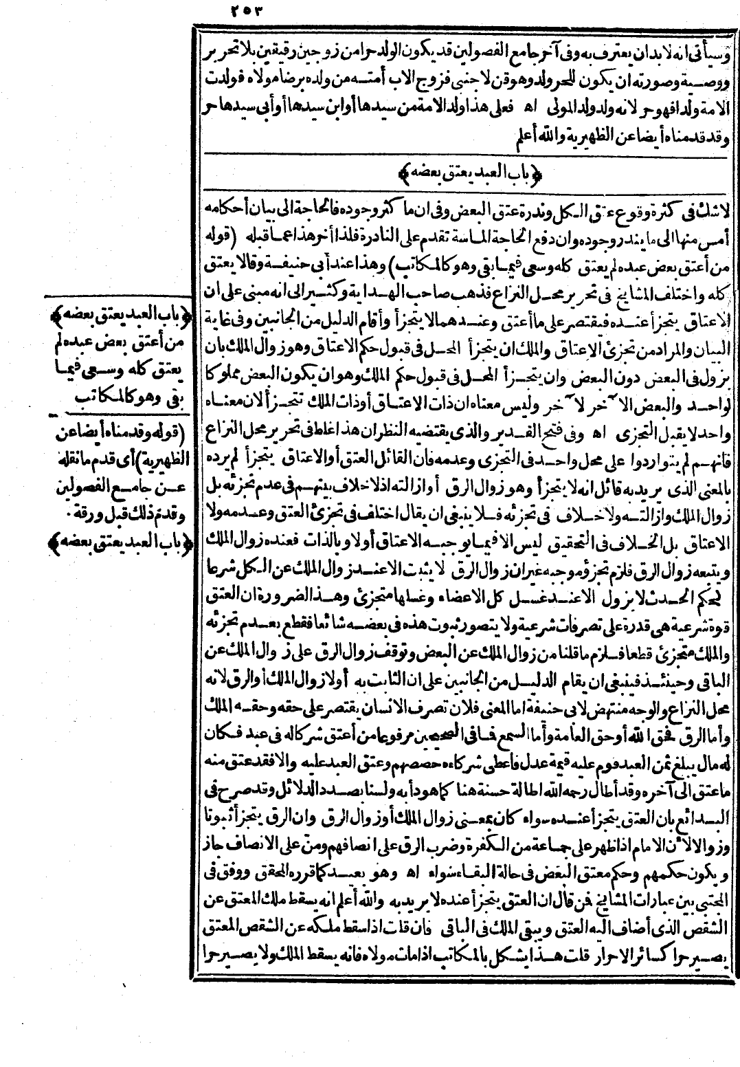 وَهَذَا لِضَرُورَةِ أَنَّ الْعِتْقَ قُوَّةٌ شَرْعِيَّةٌ هِيَ قُدْرَةٌ عَلَى تَصَرُّفَاتٍ شَرْعِيَّةٍ وَلَا يُتَصَوَّرُ ثُبُوتُ هَذِهِ فِي بَعْضِهِ شَائِعًا فَقَطَعَ بِعَدَمِ تَجَزُّئِهِ وَالْمِلْكُ مُتَجَزِّئٌ قَطْعًا فَلَزِمَ مَا قُلْنَا مِنْ زَوَالِ الْمِلْكِ عَنْ الْبَعْضِ وَتَوَقُّفِ زَوَالِ الرِّقِّ عَلَى زَوَالِ الْمِلْكِ عَنْ الْبَاقِي وَحِينَئِذٍ فَيَنْبَغِي أَنْ يُقَامَ الدَّلِيلُ مِنْ الْجَانِبَيْنِ عَلَى أَنَّ الثَّابِتَ بِهِ أَوَّلًا زَوَالُ الْمِلْكِ أَوْ الرِّقِّ؛ لِأَنَّهُ مَحَلُّ النِّزَاعِ وَالْوَجْهُ مُنْتَهَضٌ لِأَبِي حَنِيفَةَ، أَمَّا الْمَعْنَى فَلِأَنَّ تَصَرُّفَ الْإِنْسَانِ يَقْتَصِرُ عَلَى حَقِّهِ، وَحَقُّهُ الْمِلْكُ، أَمَّا الرِّقُّ فَحَقُّ اللَّهِ أَوْ حَقُّ الْعَامَّةِ، أَمَّا السَّمْعُ فَمَا فِي الصَّحِيحَيْنِ مَرْفُوعًا «مِنْ أَعْتَقَ شِرْكًا لَهُ فِي عَبْدٍ فَكَانَ لَهُ مَالٌ يَبْلُغُ ثَمَنَ الْعَبْدِ قُوِّمَ عَلَيْهِ قِيمَةَ عِدْلٍ» فَأَعْطَى شُرَكَاءَهُ حِصَصَهُمْ وَعَتَقَ الْعَبْدُ عَلَيْهِ وَإِلَّا فَقَدْ عَتَقَ مِنْهُ مَا عَتَقَ إلَى آخِرِهِ، وَقَدْ أَطَالَ - رَحِمَهُ اللَّهُ - إطَالَةً حَسَنَةً هُنَا كَمَا هُوَ دَأْبُهُ وَلَسْنَا بِصَدَدِ الدَّلَائِلِ، وَقَدْ صَرَّحَ فِي الْبَدَائِعِ بِأَنَّ الْعِتْقَ يَتَجَزَّأُ عِنْدَهُ سَوَاءٌ كَانَ بِمَعْنَى زَوَالِ الْمِلْكِ أَوْ زَوَالِ الرِّقِّ وَأَنَّ الرِّقَّ يَتَجَزَّأُ ثُبُوتًا وَزَوَالًا؛ لِأَنَّ الْإِمَامَ إذَا ظَهَرَ عَلَى جَمَاعَةٍ مِنْ الْكَفَرَةِ وَضَرَبَ الرِّقَّ عَلَى أَنْصَافِهِمْ وَمَنَّ عَلَى الْأَنْصَافِ جَازَ وَيَكُونُ حُكْمُهُمْ وَحُكْمُ مُعْتَقِ الْبَعْضِ فِي حَالَةِ الْبَقَاءِ سَوَاءً اهـ.