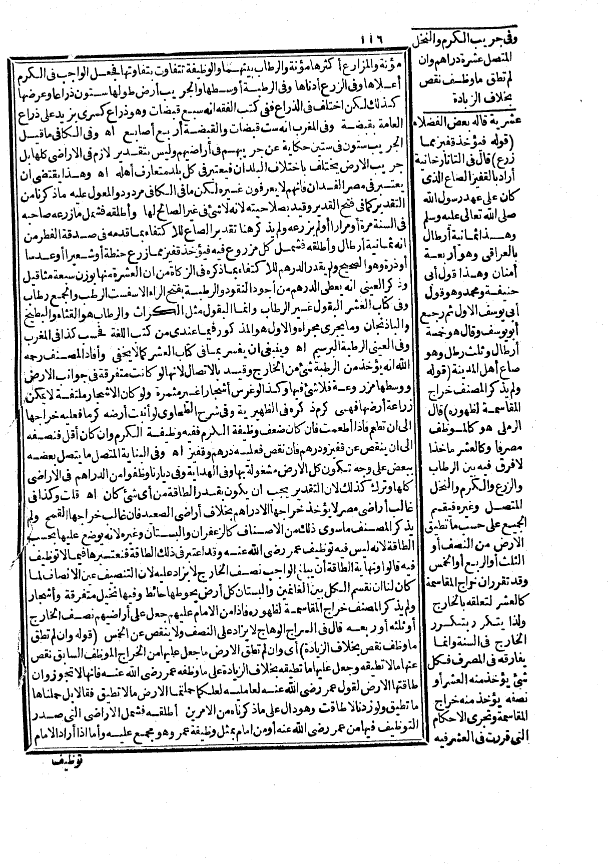 مُؤْنَةً وَالْمَزَارِعُ أَكْثَرُهَا مُؤْنَةً وَالرِّطَابُ بَيْنَهُمَا وَالْوَظِيفَةُ تَتَفَاوَتُ بِتَفَاوُتِهَا فَجَعَلَ الْوَاجِبَ فِي الْكَرْمِ أَعْلَاهَا وَفِي الزَّرْعِ أَدْنَاهَا وَفِي الرَّطْبَةِ أَوْسَطَهَا وَالْجَرِيبُ أَرْضٌ طُولُهَا سِتُّونَ ذِرَاعًا وَعَرْضُهَا كَذَلِكَ لَكِنْ اُخْتُلِفَ فِي الذِّرَاعِ فَفِي كُتُبِ الْفِقْهِ أَنَّهُ سَبْعُ قَبَضَاتٍ وَهُوَ ذِرَاعُ كِسْرَى يَزِيدُ عَلَى ذِرَاعِ الْعَامَّةِ بِقَبْضَةٍ.