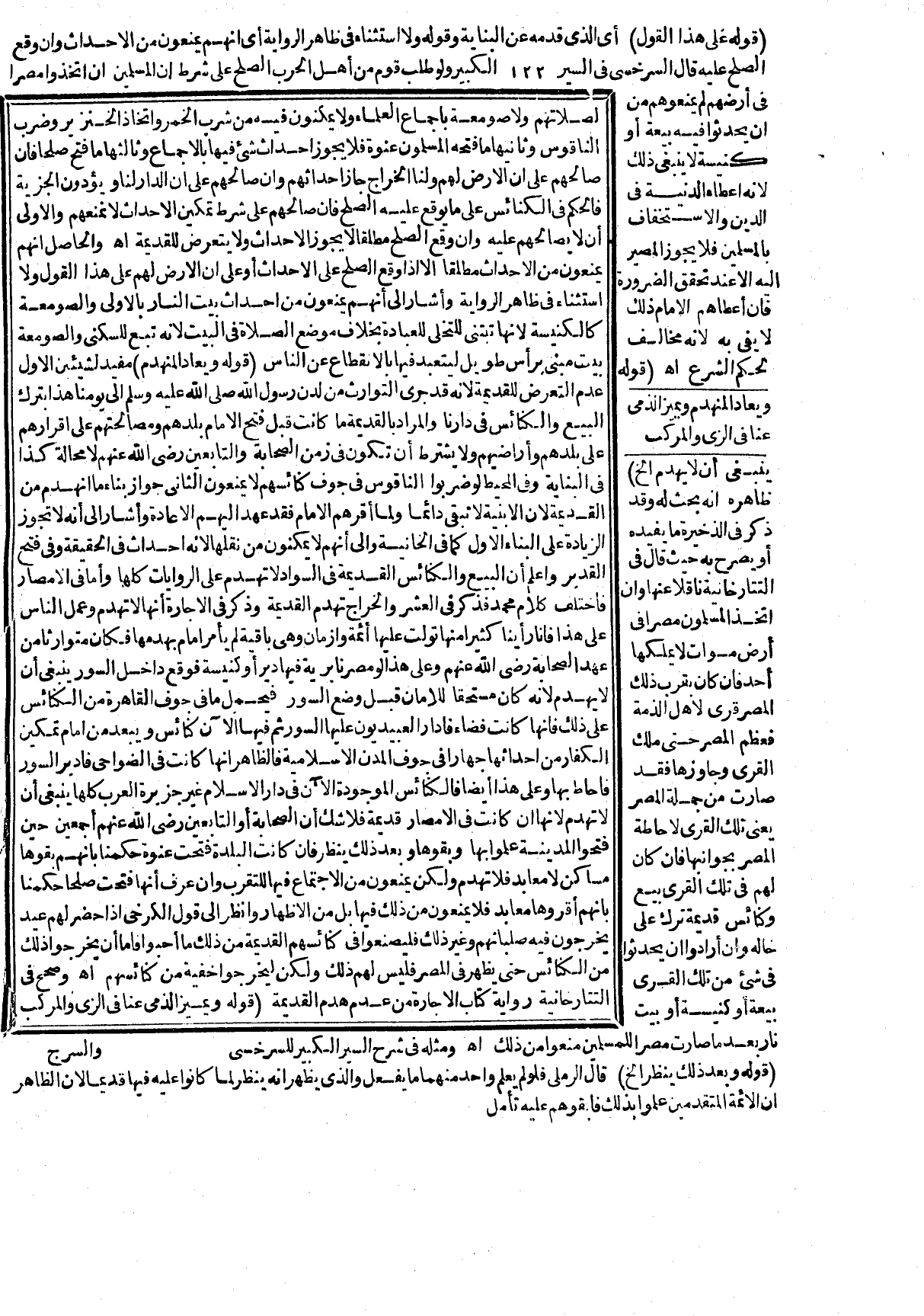 وَاعْلَمْ أَنَّ الْبِيَعَ وَالْكَنَائِسَ الْقَدِيمَةَ فِي السَّوَادِ لَا تُهْدَمُ عَلَى الرَّاوِيَاتِ كُلِّهَا وَأَمَّا فِي الْأَمْصَارِ فَاخْتَلَفَ كَلَامُ مُحَمَّدٍ فَذَكَرَ فِي الْعُشْرِ وَالْخَرَاجِ تُهْدَمُ الْقَدِيمَةُ وَذَكَرَ فِي الْإِجَارَةِ أَنَّهَا لَا تُهْدَمُ وَعَمَلُ النَّاسِ عَنْ هَذَا فَإِنَّا رَأَيْنَا كَثِيرًا مِنْهَا تَوَلَّتْ عَلَيْهَا أَئِمَّةٌ وَأَزْمَانٌ وَهِيَ بَاقِيَةٌ لَمْ يَأْمُرْ إمَامٌ بِهَدْمِهَا فَكَانَ مُتَوَارَثًا مِنْ عَهْدِ الصَّحَابَةِ - رَضِيَ اللَّهُ عَنْهُمْ - وَعَلَى هَذَا لَوْ مَصَّرْنَا بَرِّيَّةً فِيهَا دَيْرٌ أَوْ كَنِيسَةٌ فَوَقَعَ دَاخِلَ السُّور يَنْبَغِي أَنْ لَا يُهْدَمَ لِأَنَّهُ كَانَ مُسْتَحِقًّا لِلْأَمَانِ قَبْلَ وَضْعِ السُّورِ فَيُحْمَلُ مَا فِي جَوْفِ الْقَاهِرَةِ مِنْ الْكَنَائِسِ عَلَى ذَلِكَ فَإِنَّهَا كَانَتْ فَضَاءً فَأَدَارَ الْعَبِيدِيُّونَ عَلَيْهَا السُّوَرَ ثُمَّ فِيهَا الْآنَ كَنَائِسُ وَيَبْعُدُ مِنْ إمَامٍ تَمْكِينُ الْكُفَّارِ مِنْ إحْدَاثِهَا جِهَارًا فِي جَوْفِ الْمُدُنِ الْإِسْلَامِيَّةِ فَالظَّاهِرُ أَنَّهَا كَانَتْ فِي الضَّوَاحِي فَأُدِيرَ السُّوَرُ فَأَحَاطَ بِهَا وَعَلَى هَذَا أَيْضًا فَالْكَنَائِسُ الْمَوْجُودَةُ الْآنَ فِي دَارِ الْإِسْلَامِ غَيْرِ جَزِيرَةِ الْعَرَبِ كُلُّهَا يَنْبَغِي أَنْ لَا تُهْدَمَ لِأَنَّهَا إنْ كَانَتْ فِي الْأَمْصَارِ قَدِيمَةً فَلَا شَكَّ أَنَّ الصَّحَابَةَ أَوْ التَّابِعِينَ - رَضِيَ اللَّهُ عَنْهُمْ - أَجْمَعِينَ حِينَ فَتَحُوا الْمَدِينَةَ عَلِمُوا بِهَا وَبَقُّوهَا وَبَعْدَ ذَلِكَ يُنْظَرُ فَإِنْ كَانَتْ الْبَلْدَةُ فُتِحَتْ عَنْوَةً حَكَمْنَا بِأَنَّهُمْ بَقُّوهَا مَسَاكِنَ لَا مَعَابِدَ فَلَا تُهْدَمُ وَلَكِنْ يُمْنَعُونَ مِنْ الِاجْتِمَاعِ فِيهَا لِلتَّقَرُّبِ وَإِنْ عُرِفَ أَنَّهَا فُتِحَتْ صُلْحًا حَكَمْنَا بِأَنَّهُمْ أَقَرُّوهَا مَعَابِدَ فَلَا يُمْنَعُونَ مِنْ ذَلِكَ فِيهَا بَلْ مِنْ الْإِظْهَارِ وَانْظُرْ إلَى قَوْلِ الْكَرْخِيِّ إذَا حَضَرَ لَهُمْ عِيدٌ يُخْرِجُونَ فِيهِ صُلْبَانَهُمْ وَغَيْرَ ذَلِكَ فَلْيَصْنَعُوا فِي كَنَائِسِهِمْ الْقَدِيمَةِ مِنْ ذَلِكَ مَا أَحَبُّوا فَأَمَّا أَنْ يُخْرِجُوا ذَلِكَ مِنْ الْكَنَائِسِ حَتَّى يَظْهَرَ فِي الْمِصْرِ فَلَيْسَ لَهُمْ ذَلِكَ وَلَكِنْ لِيَخْرُجُوا خُفْيَةً مِنْ كَنَائِسِهِمْ اهـ.